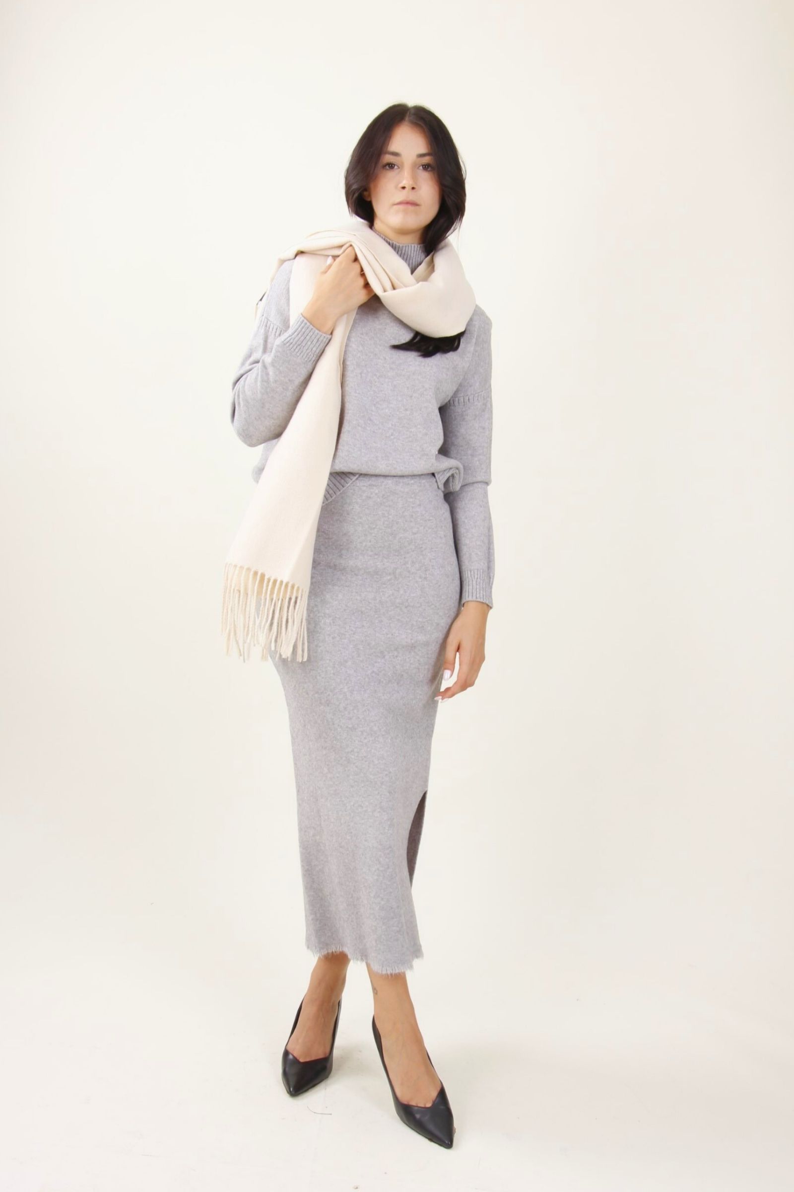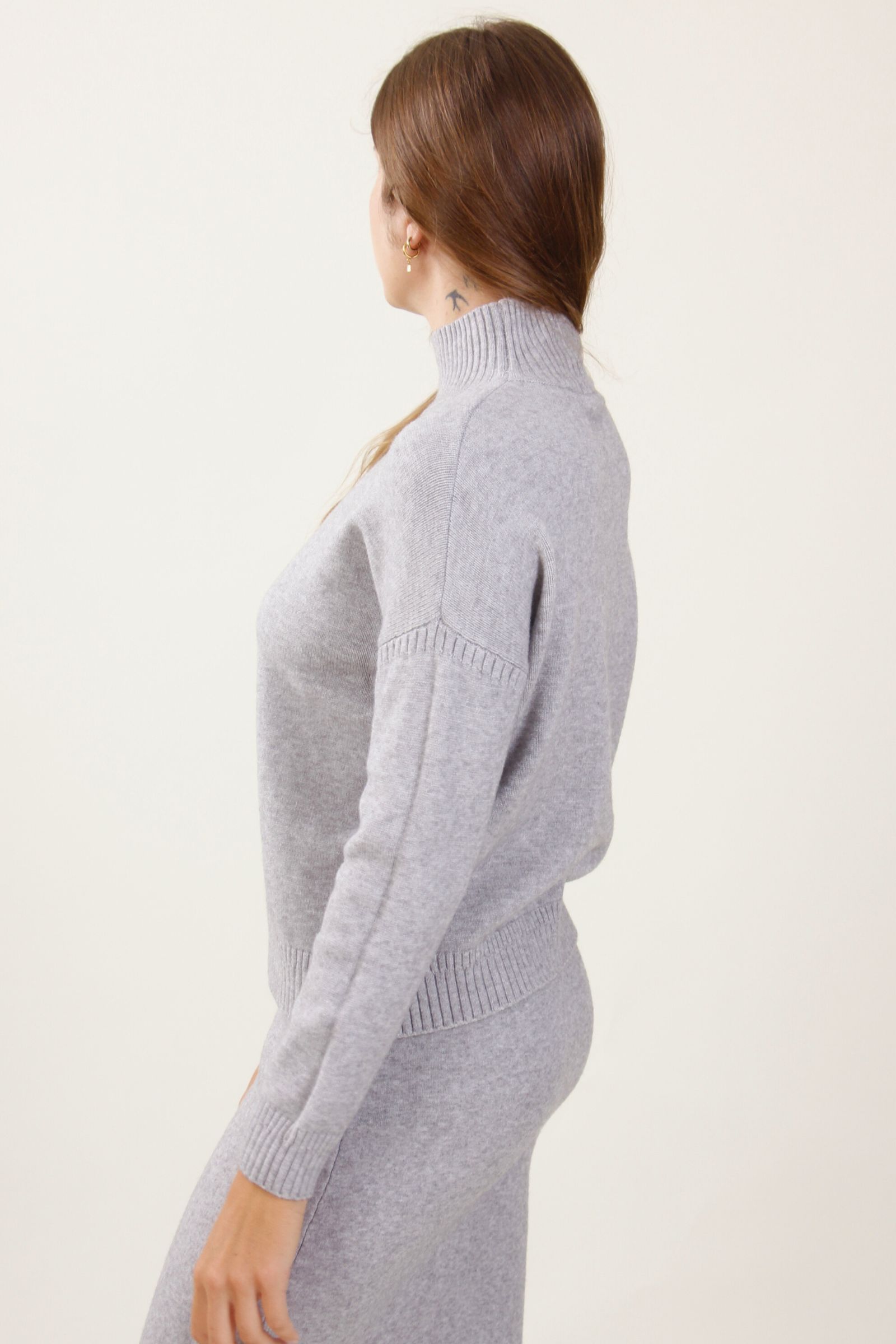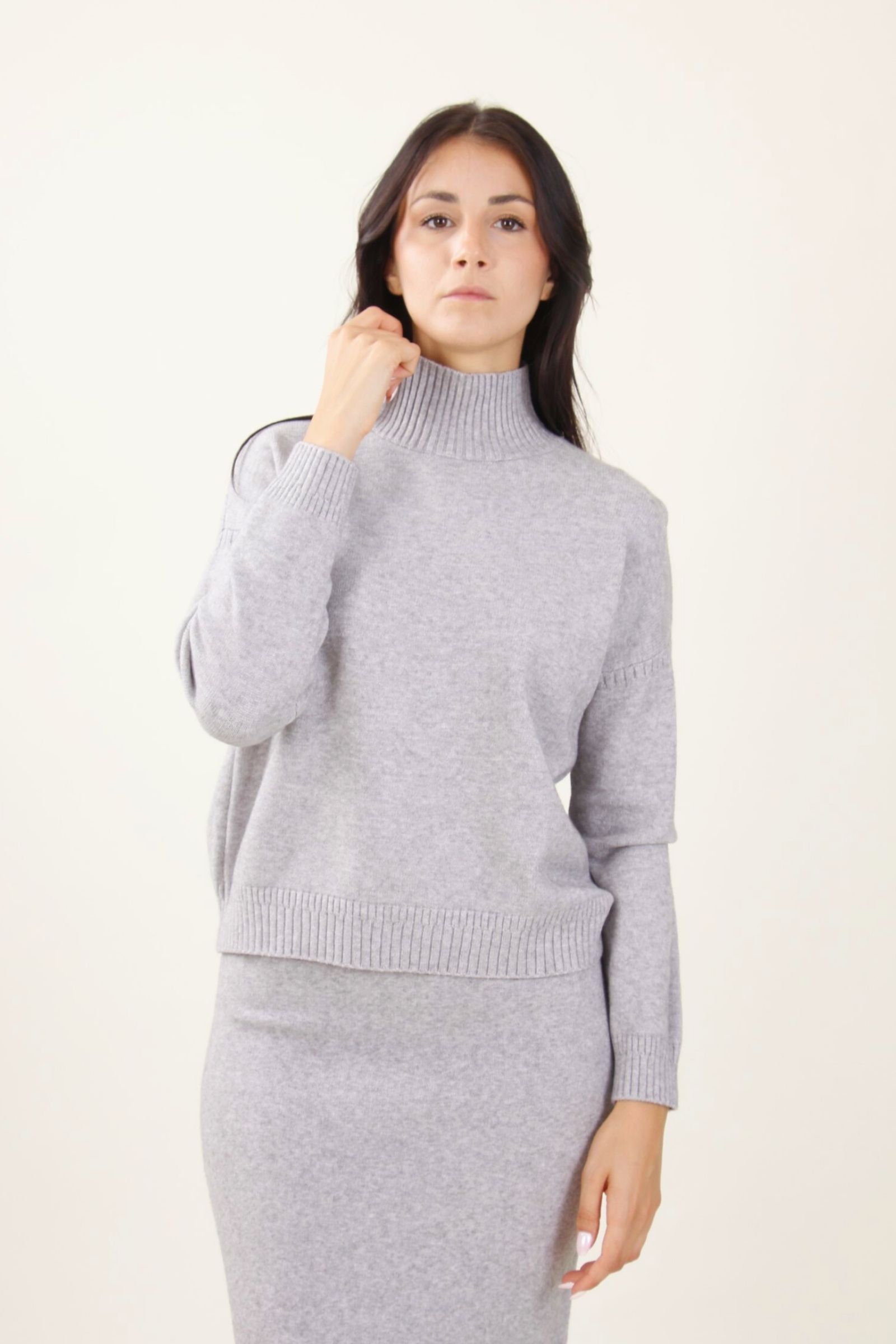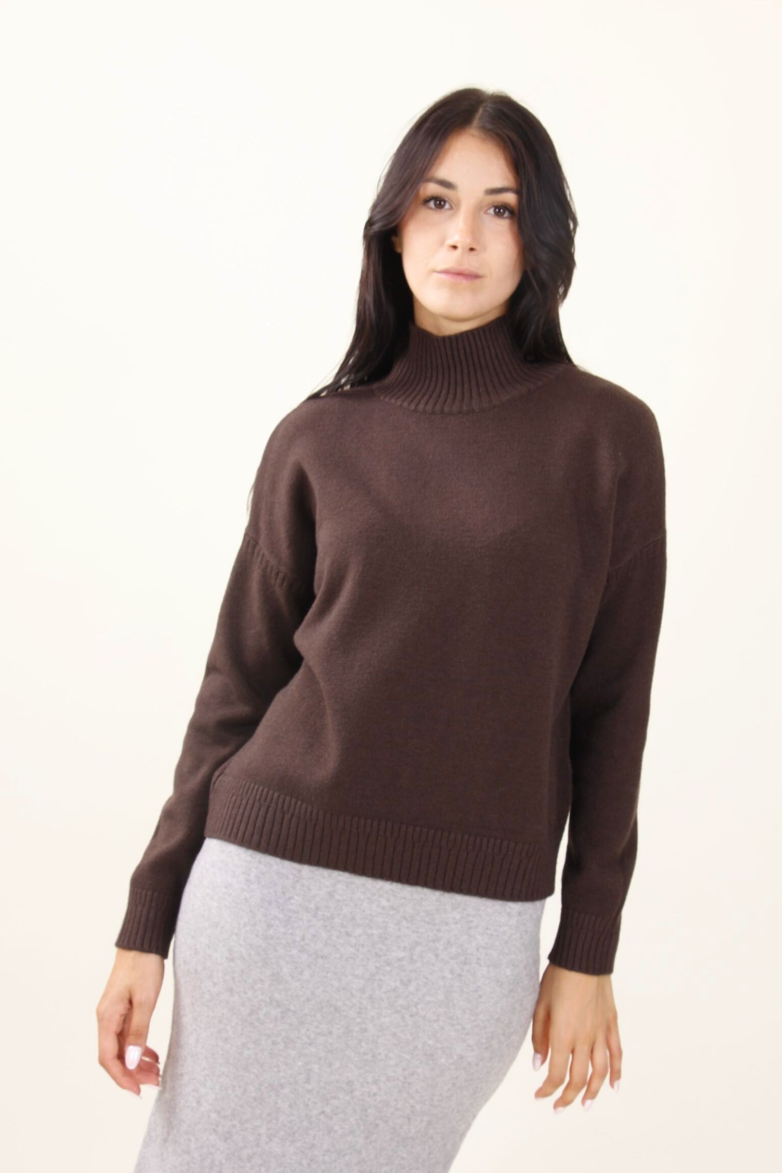 Turtleneck sweater with neck, cuffs and ribbed bottom. Finished at the sleeve. Slightly over fit.