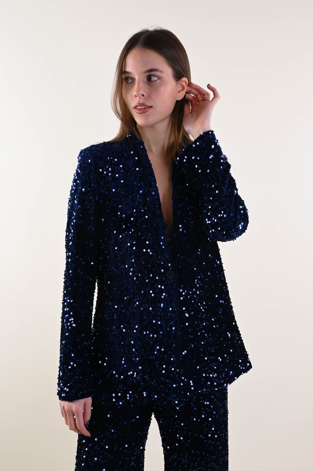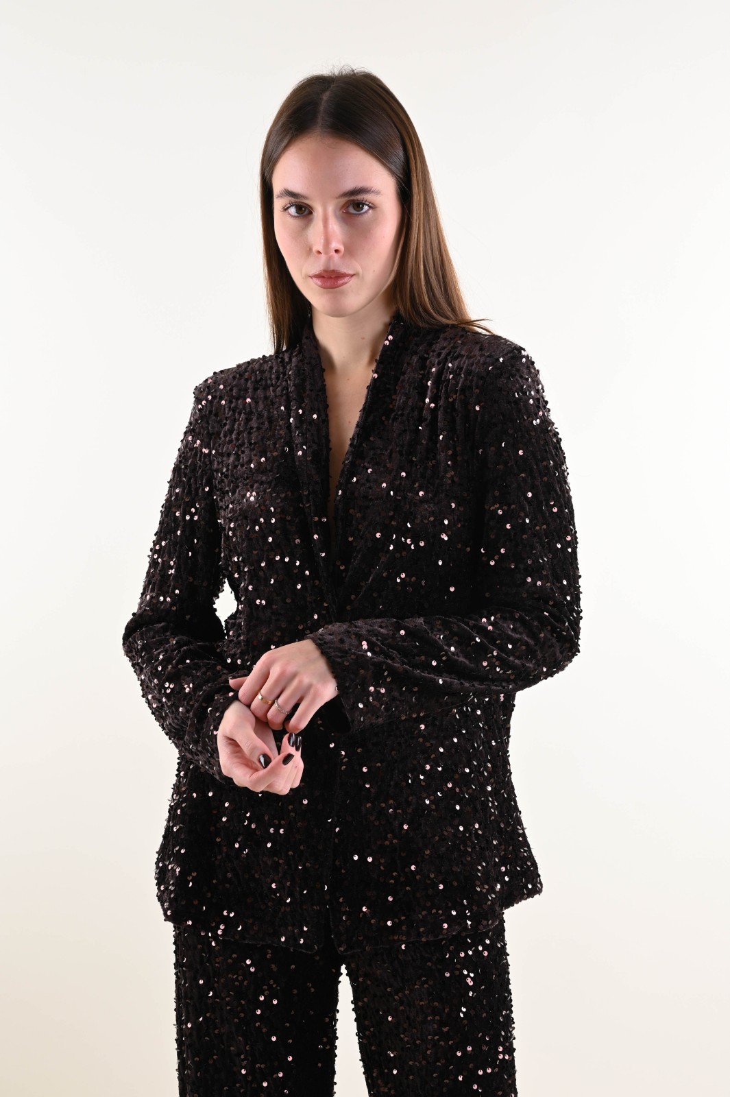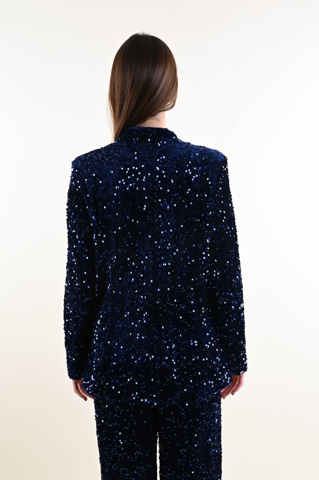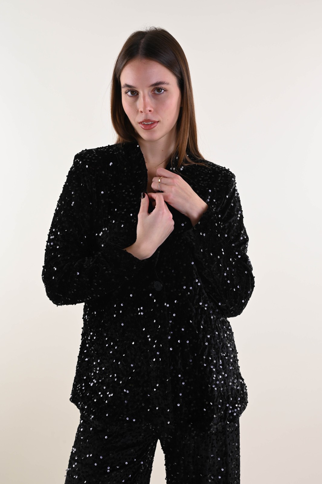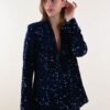 Velvet jacket fully embellished with sequins, designed to elevate any evening or special-occasion outfit. The relaxed cut and open silhouette add movement and femininity, while the velvet base enhances the sparkle of the sequins. A standout piece, perfect for retailers looking to offer eye-catching and elegant outerwear for the festive season.