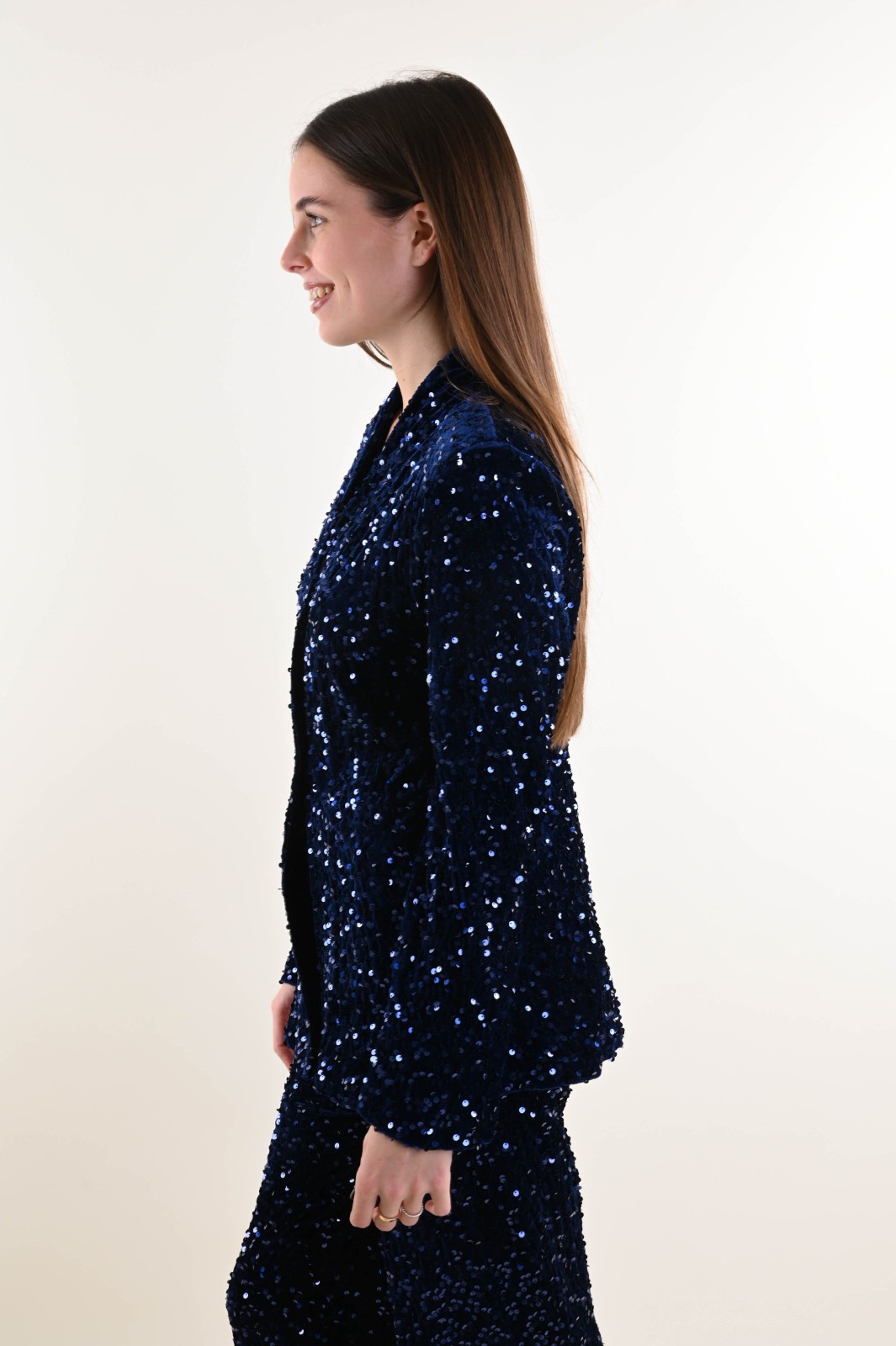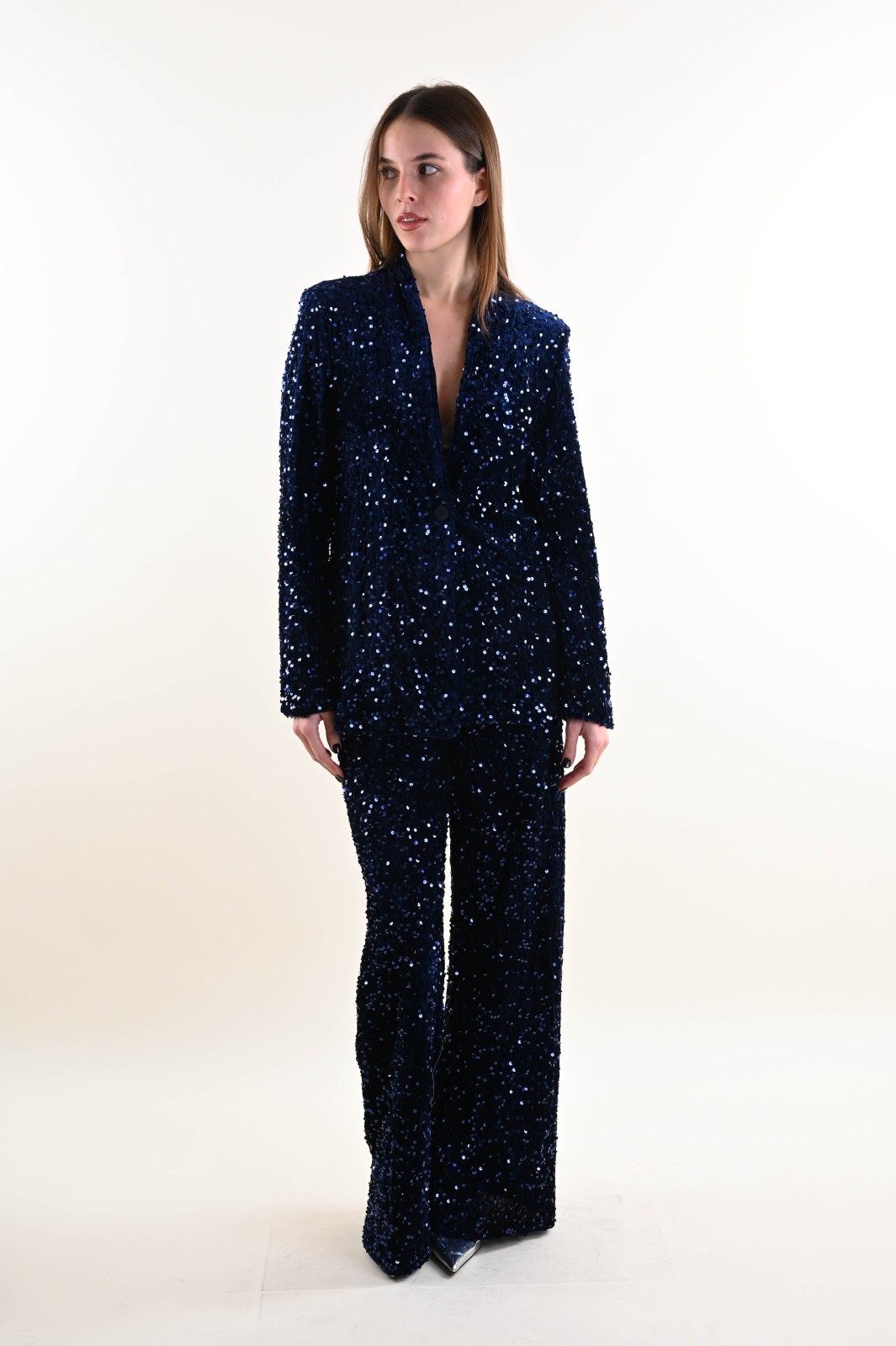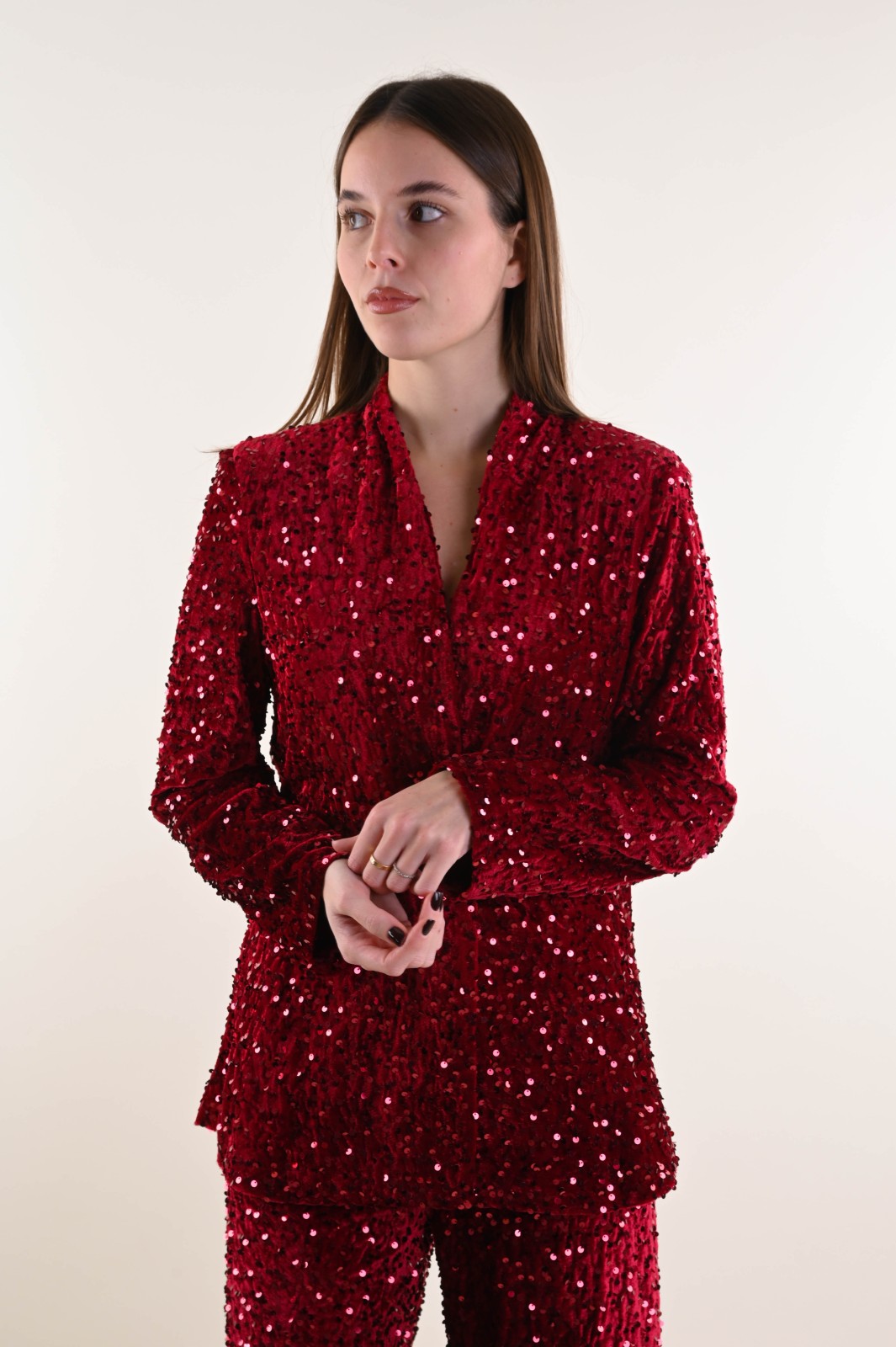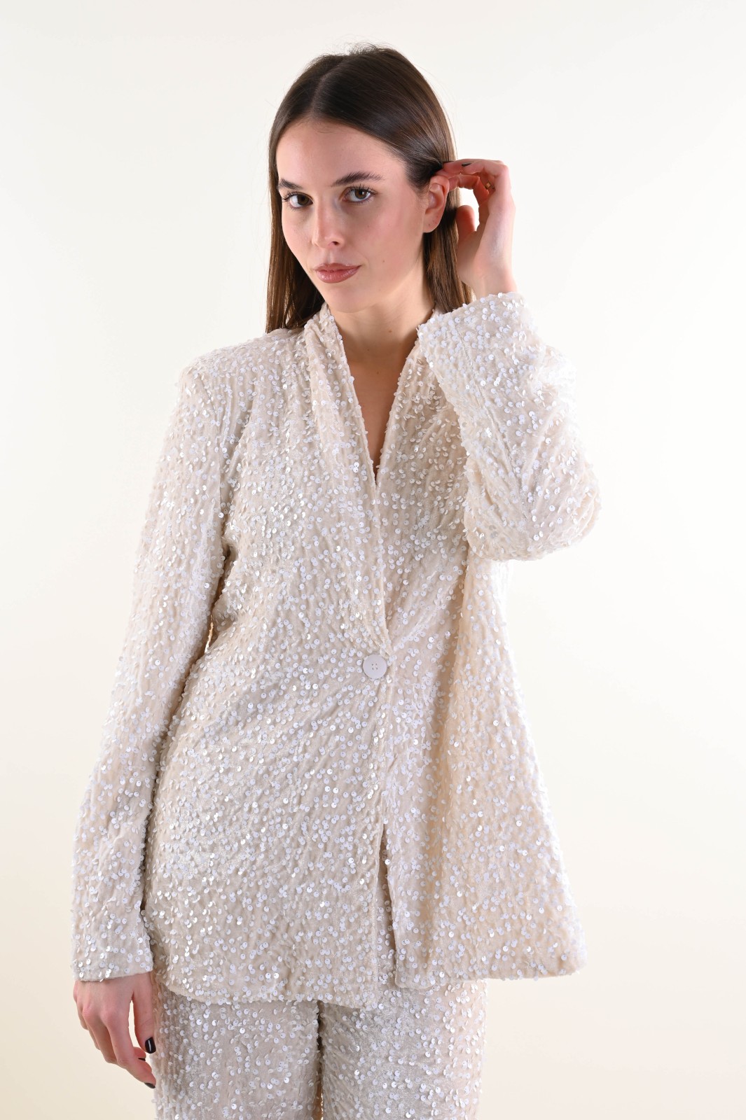 Velvet jacket fully embellished with sequins, designed to elevate any evening or special-occasion outfit. The relaxed cut and open silhouette add movement and femininity, while the velvet base enhances the sparkle of the sequins. A standout piece, perfect for retailers looking to offer eye-catching and elegant outerwear for the festive season.