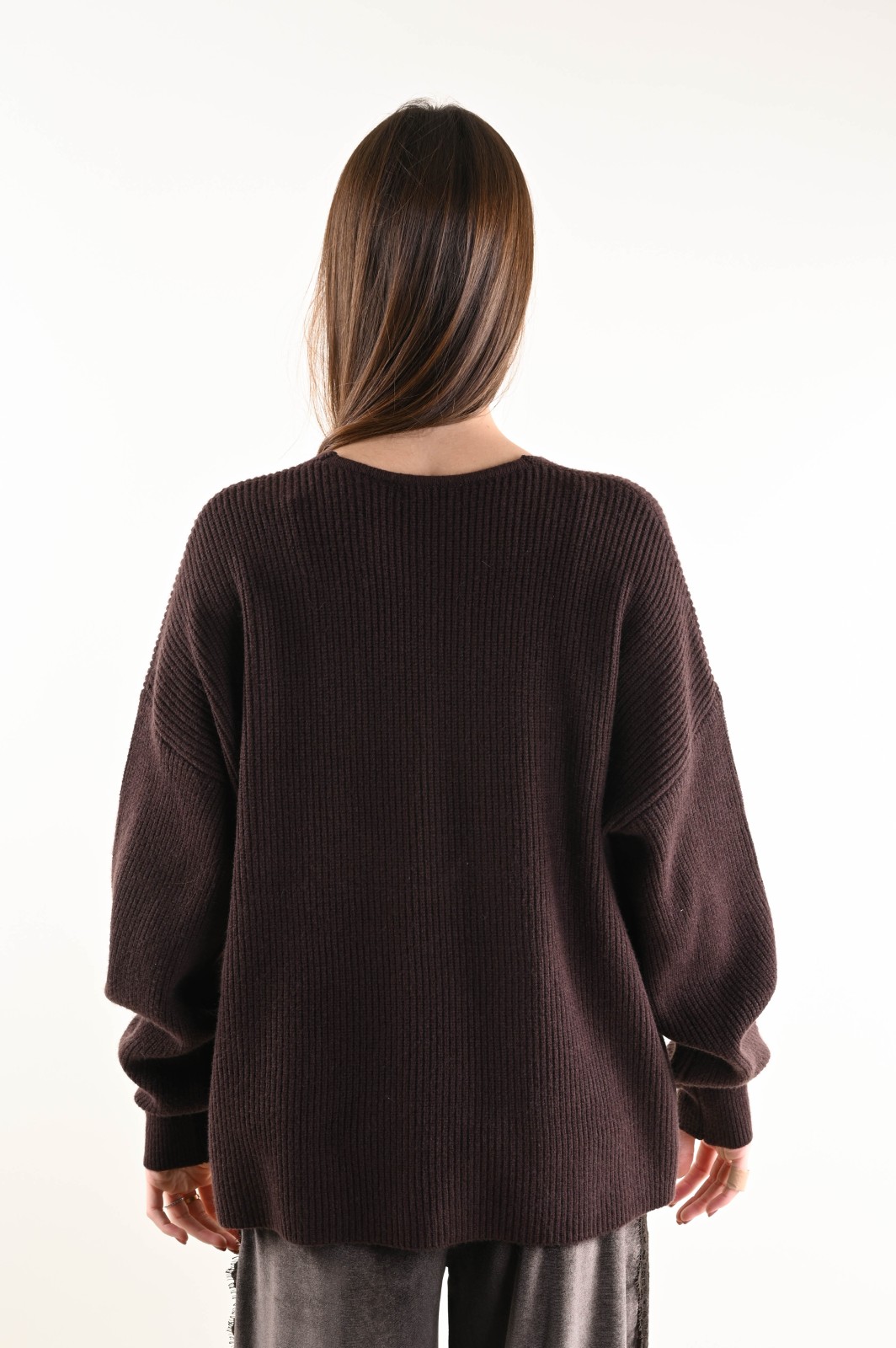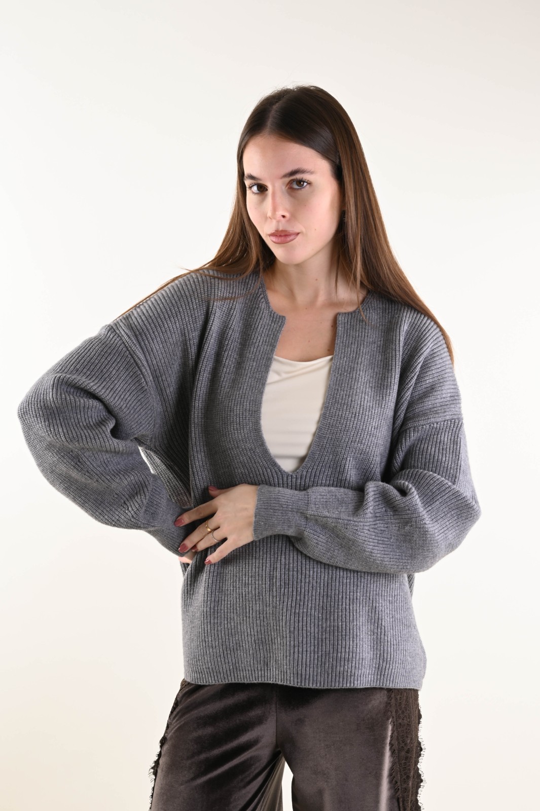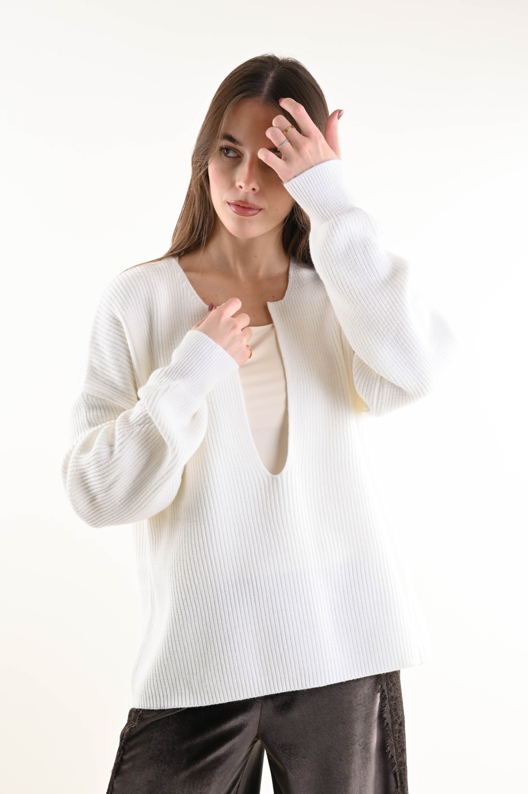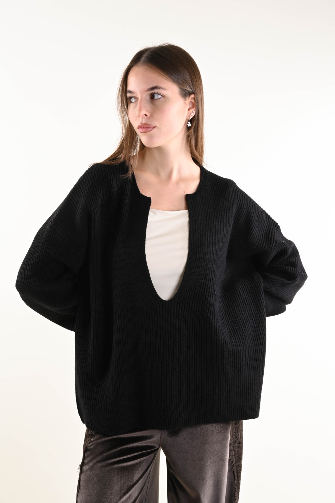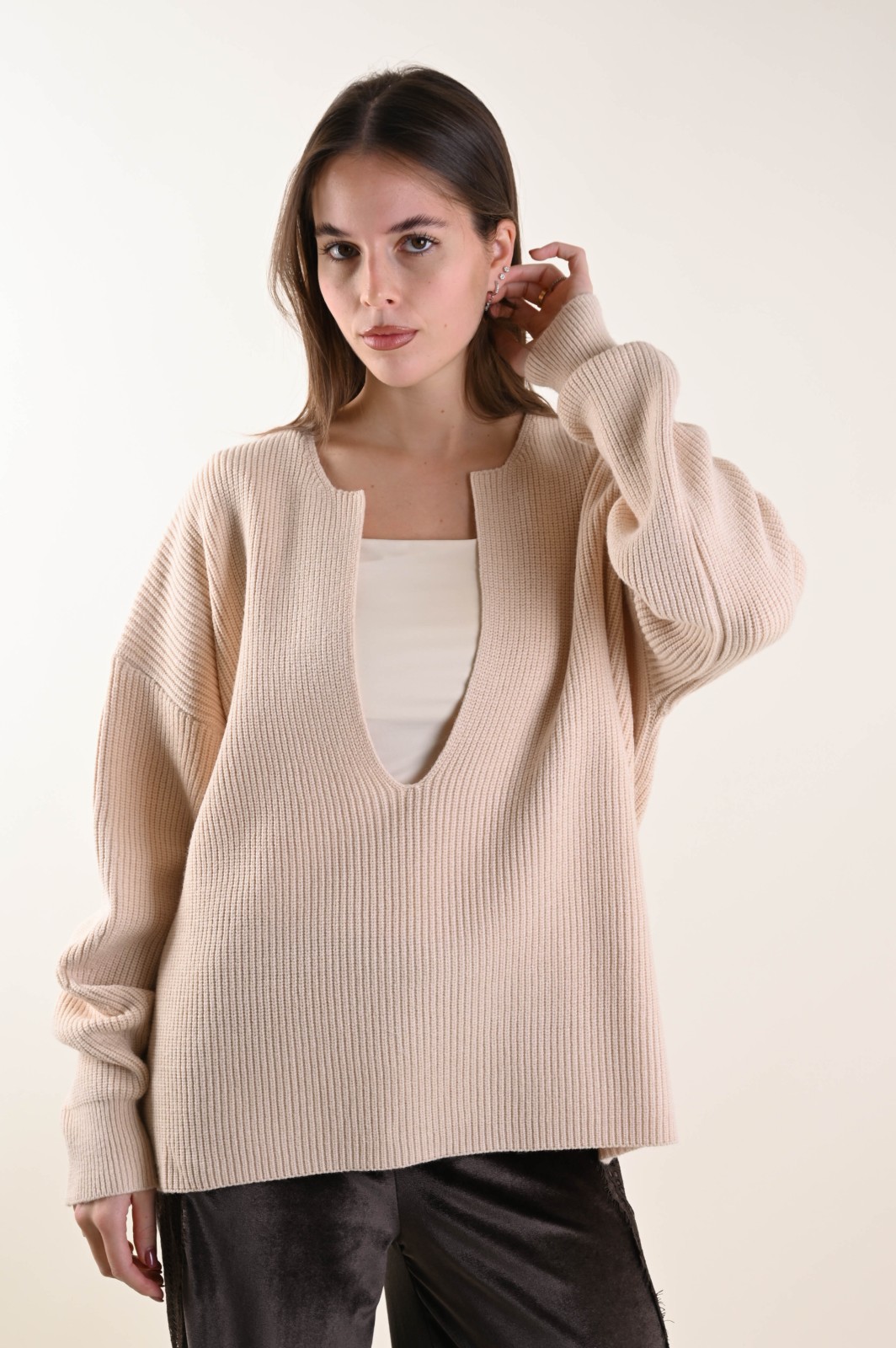Ribbed knit sweater featuring a deep V-neckline and a relaxed fit. An essential and contemporary piece, perfect for creating elegant yet effortless looks. The minimal design and structured texture enhance the silhouette, making it ideal to wear on its own or layered under blazers and coats for a refined touch.