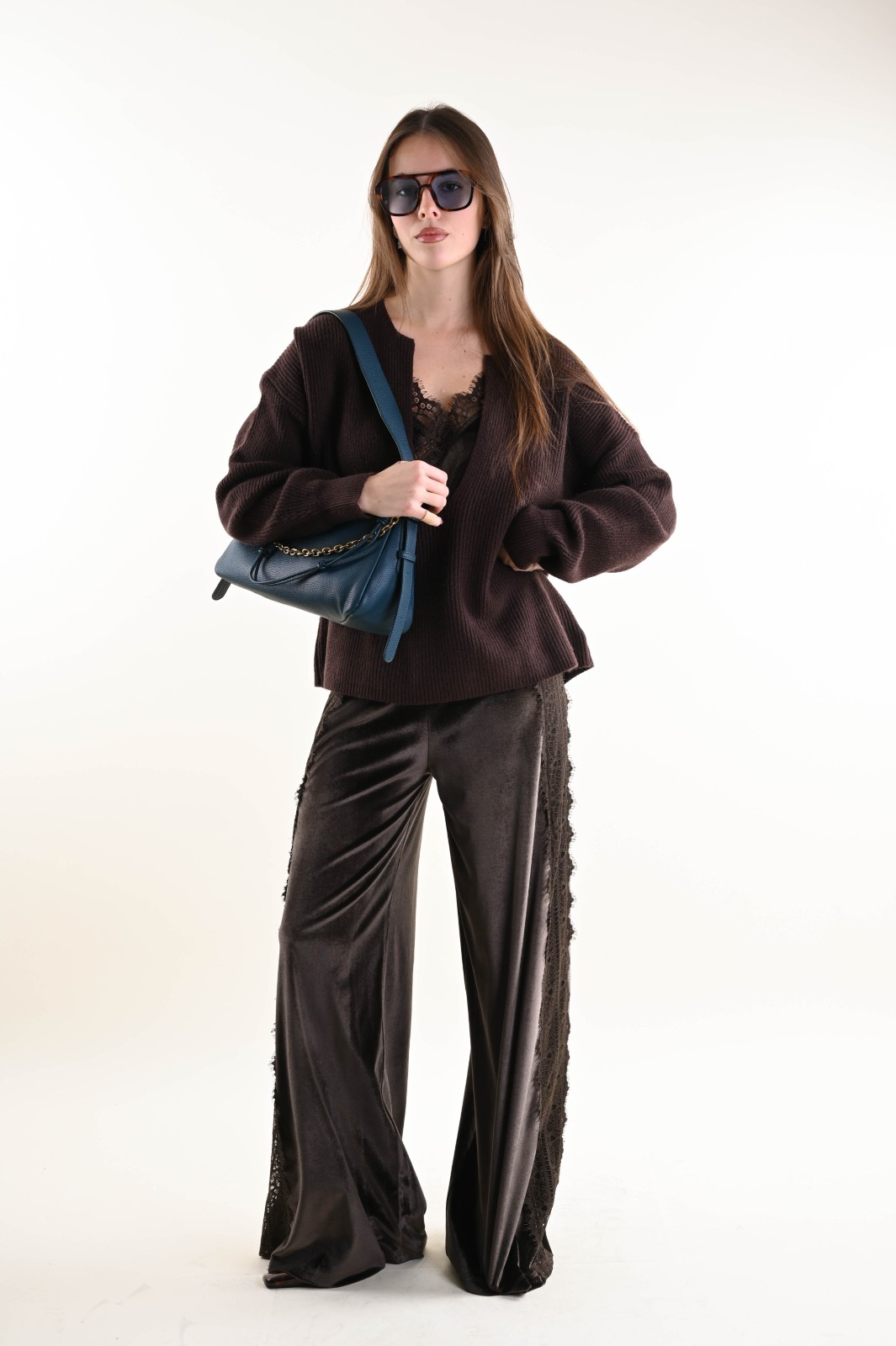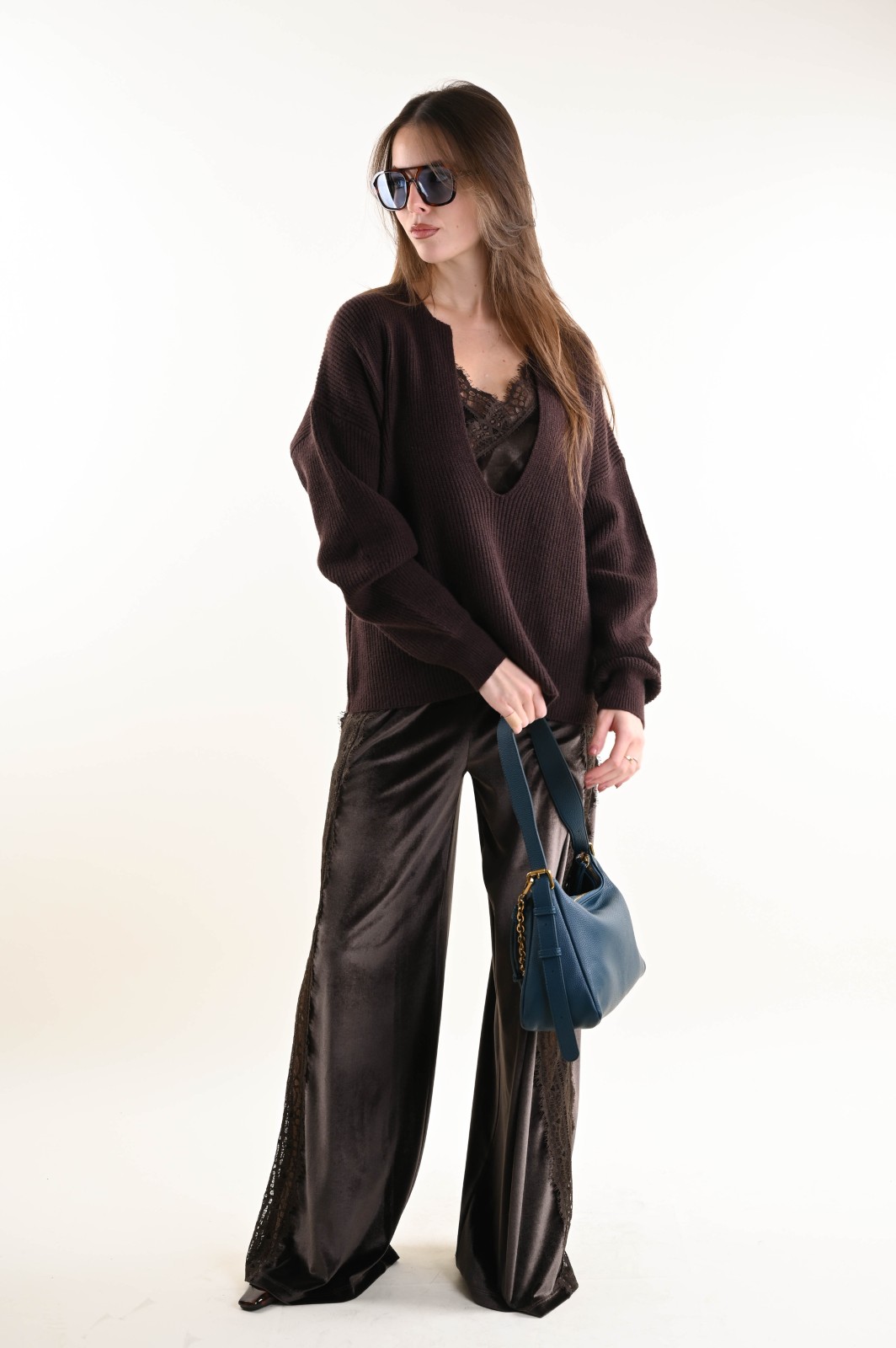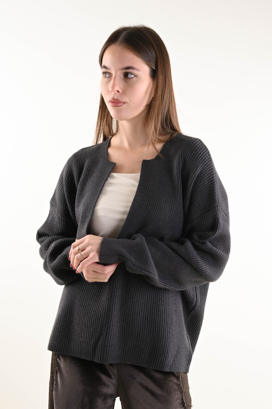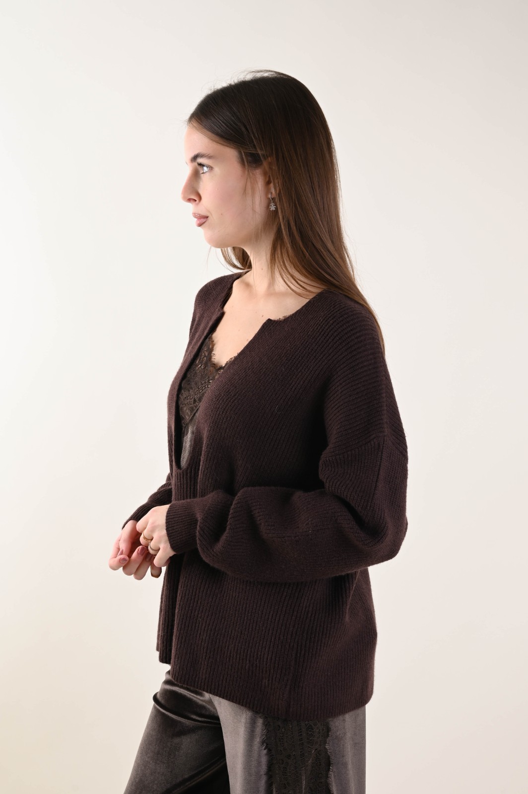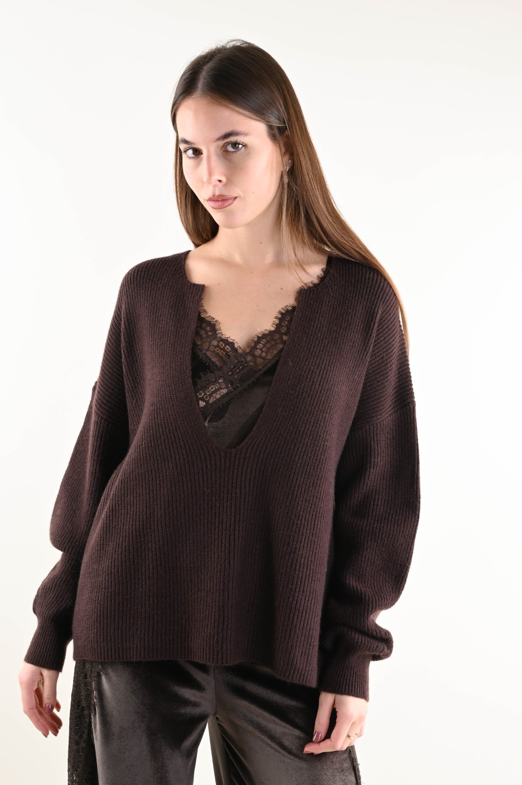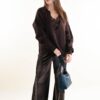 Ribbed knit sweater featuring a deep V-neckline and a relaxed fit. An essential and contemporary piece, perfect for creating elegant yet effortless looks. The minimal design and structured texture enhance the silhouette, making it ideal to wear on its own or layered under blazers and coats for a refined touch.