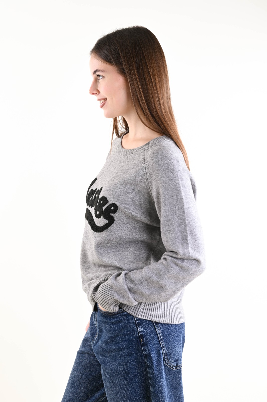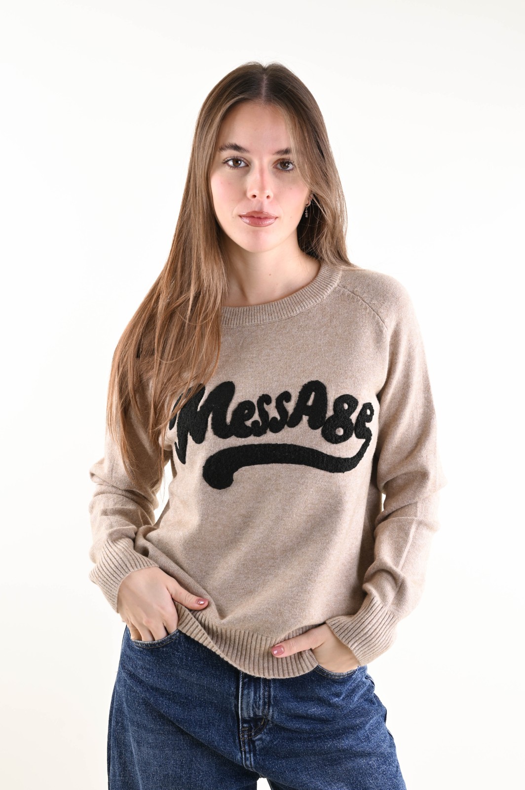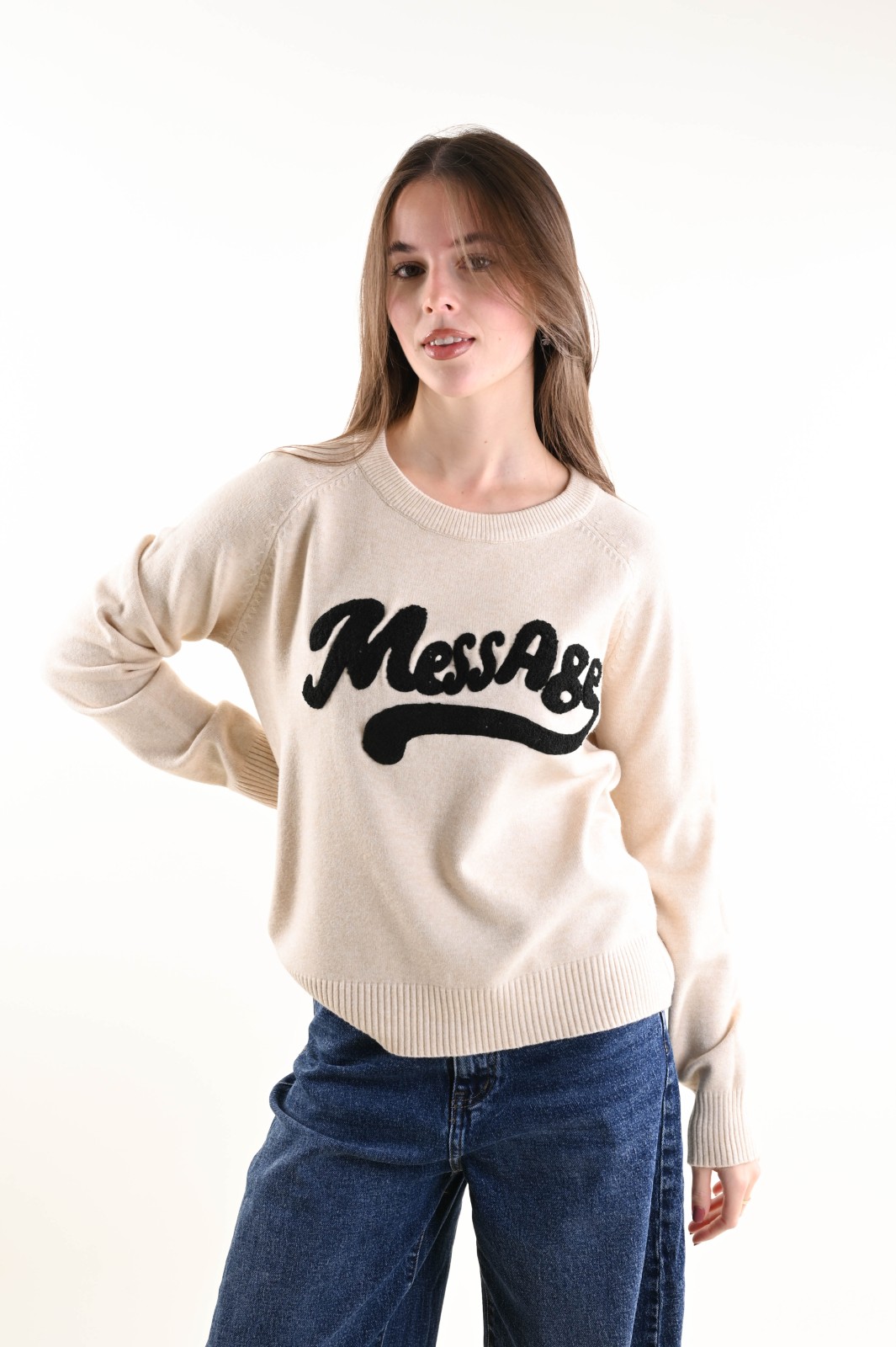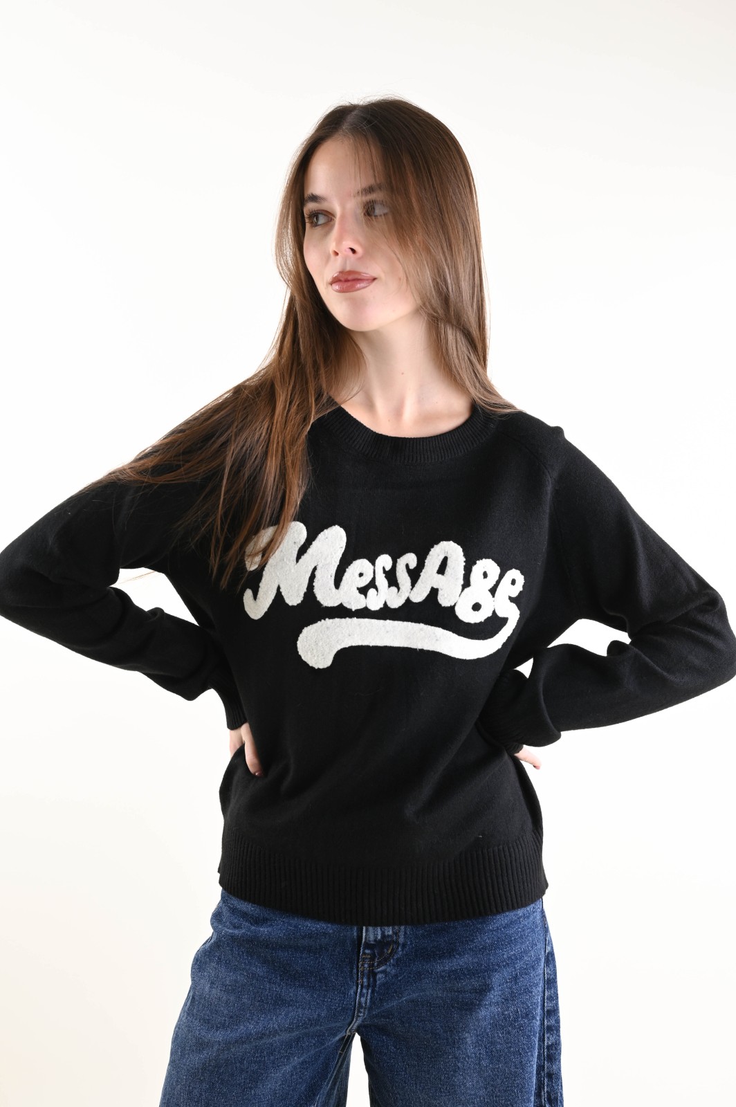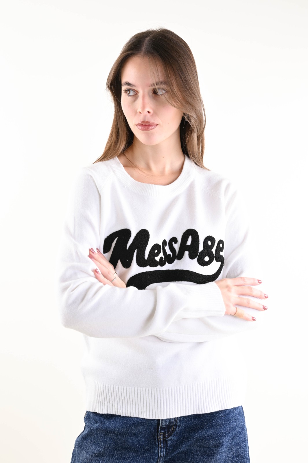 Crew-neck fine knit sweater featuring a raised “Mess Age” embroidery. A minimal design enhanced by contrasting lettering that adds a modern and bold touch to the look. A casual-chic piece perfect for creating contemporary outfits, easily paired with tailored trousers or denim for effortless elegance.
