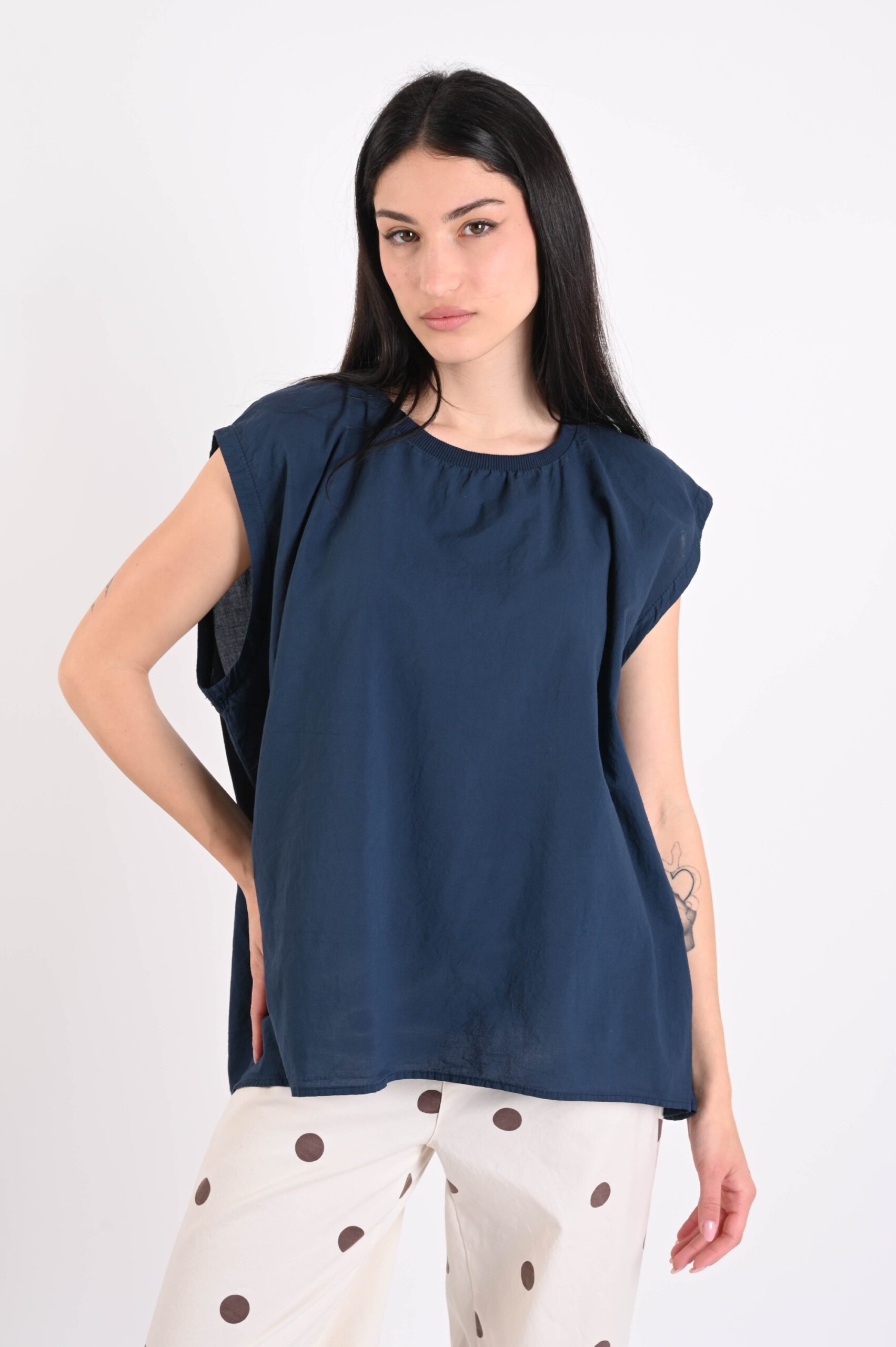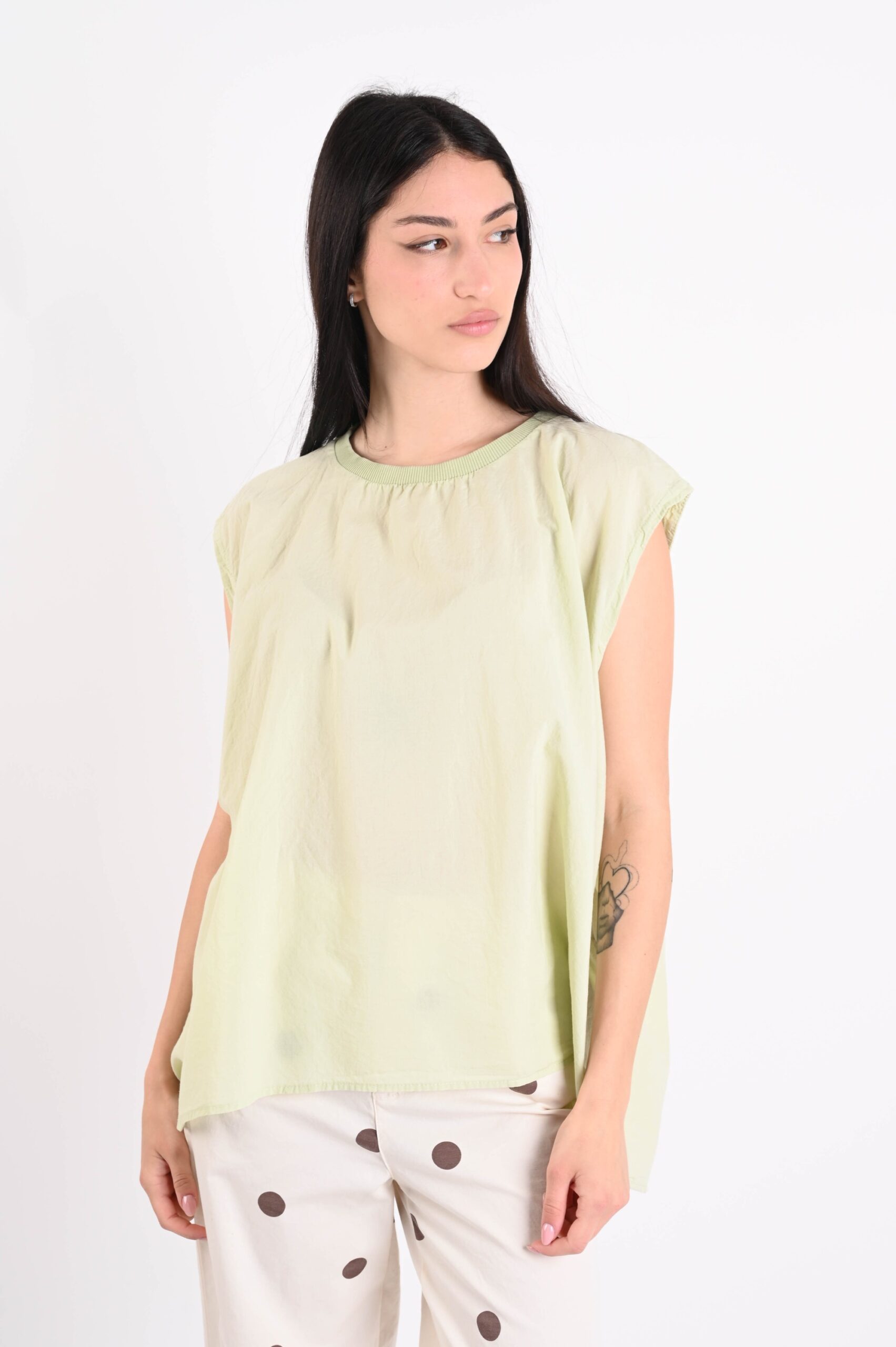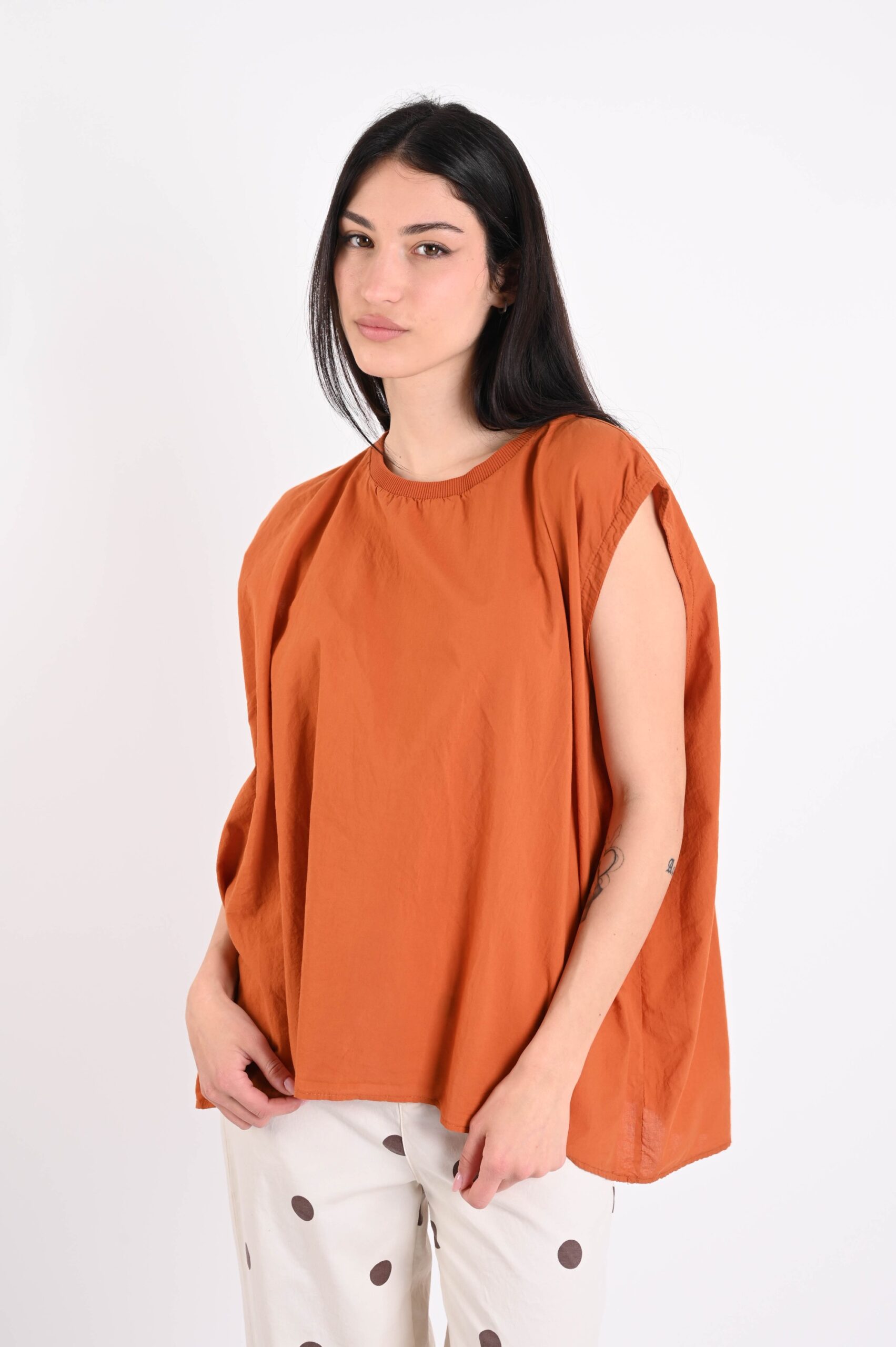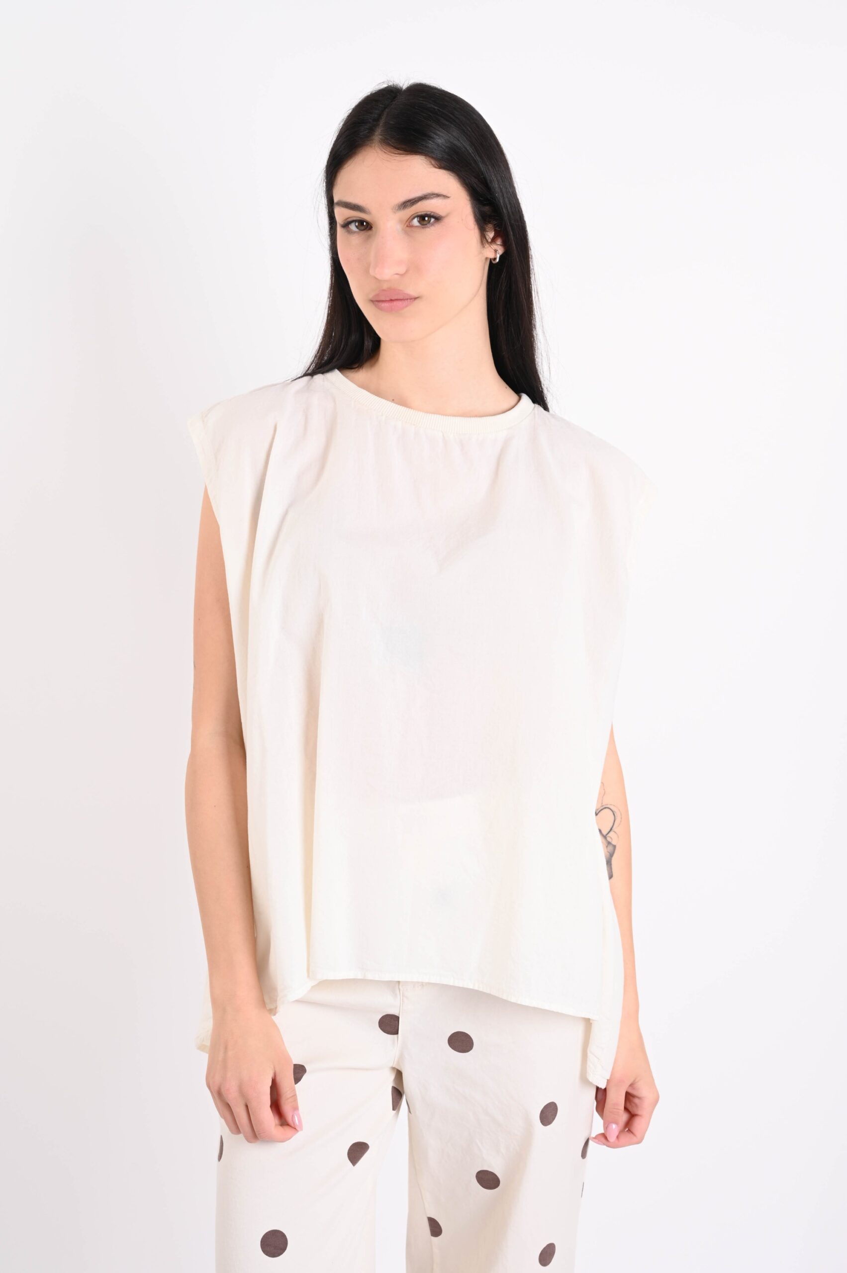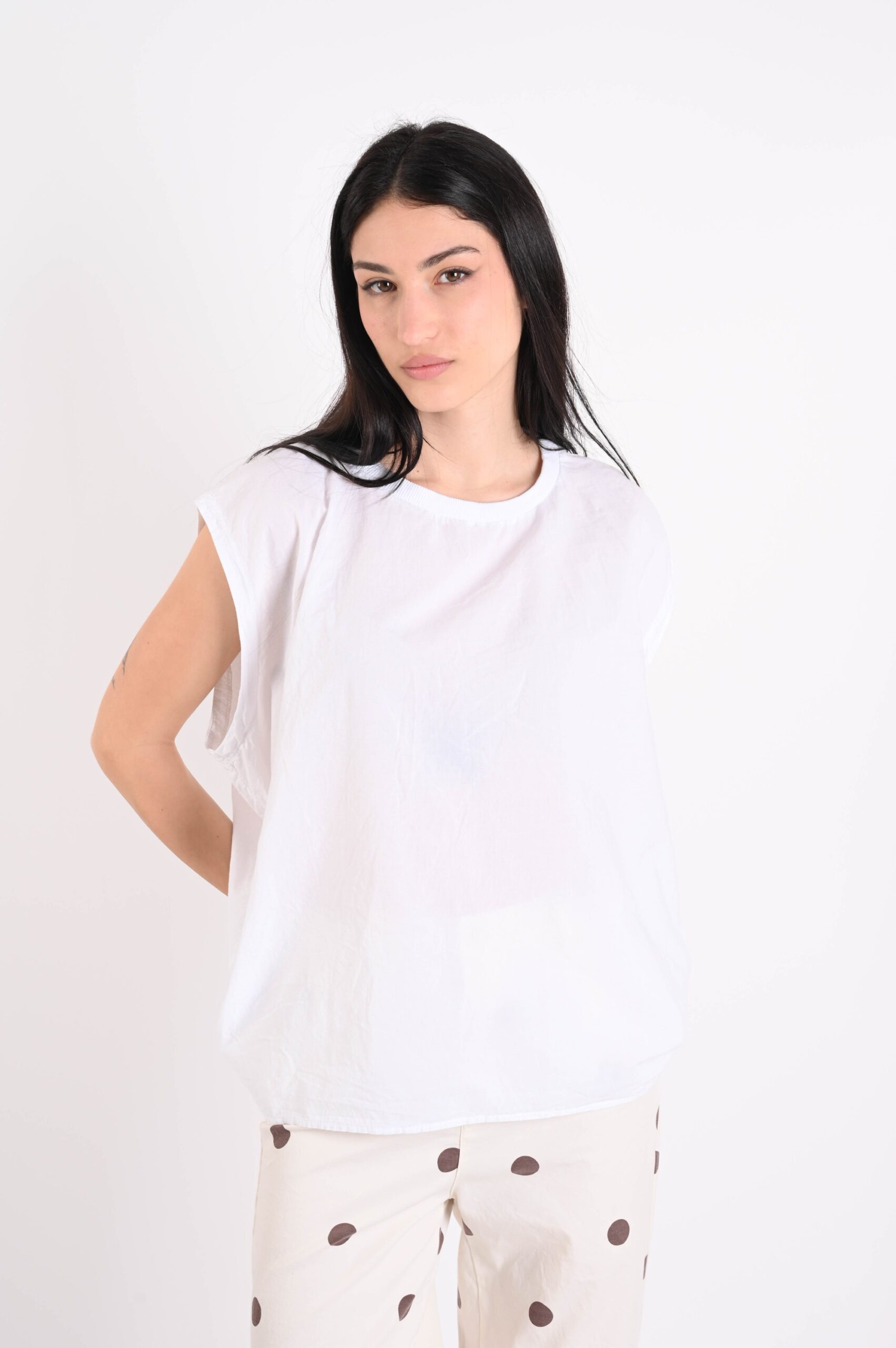 Sleeveless cotton top, an essential and versatile piece perfect for the spring-summer season. Made from breathable natural fabric, it ensures comfort and lightness throughout the day. The clean and contemporary design makes it ideal for creating feminine and dynamic outfits, easy to style from casual to more refined looks. A must-have item for retailers looking for trendy yet timeless basics.