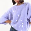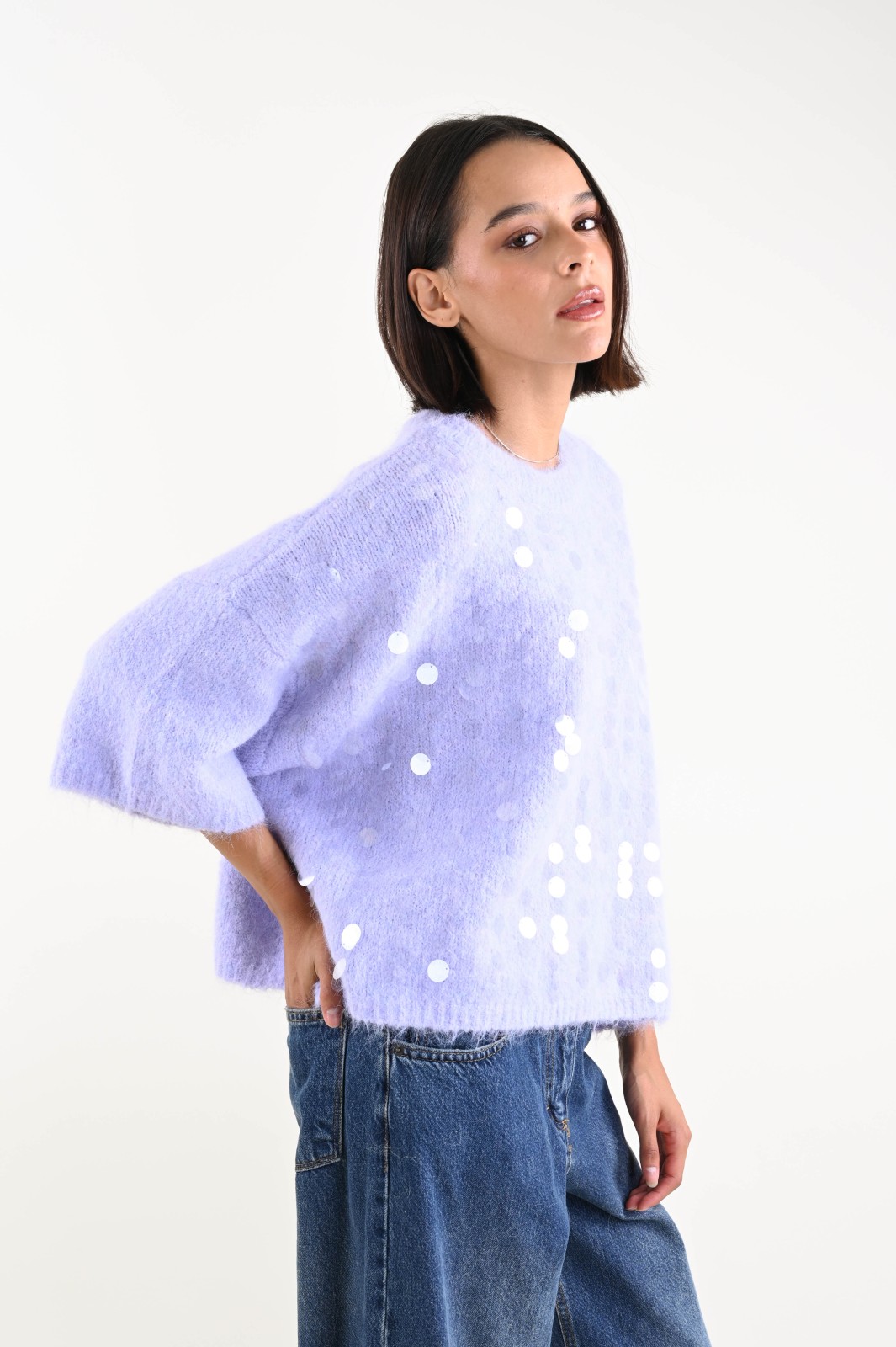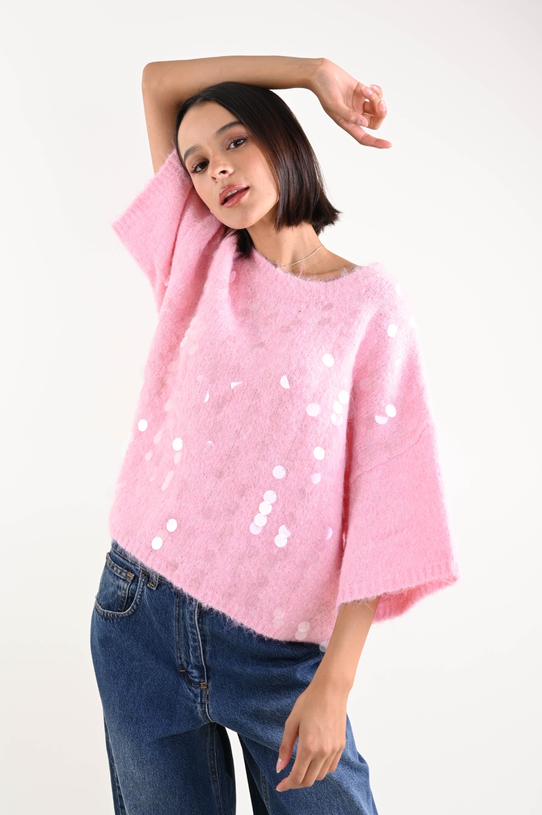 Suéter de punto suave para mujer con mangas 3/4 adornado con maxi apliques de lentejuelas, una prenda brillante y moderna que combina comodidad y estilo glamuroso. Su diseño moderno y brillante lo hace perfecto para looks de noche y eventos especiales, pero también añade un toque de originalidad a conjuntos casual chic. Fácil de combinar con faldas o pantalones elegantes, es una prenda imprescindible para quienes aman destacar con detalles de moda.