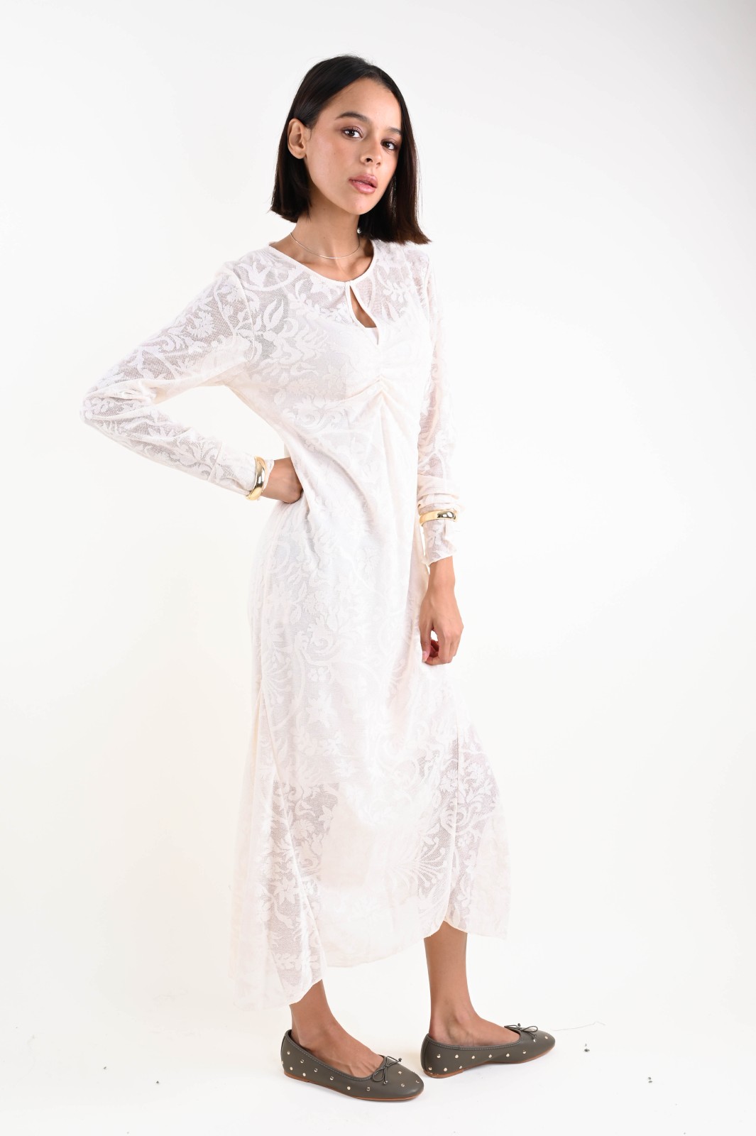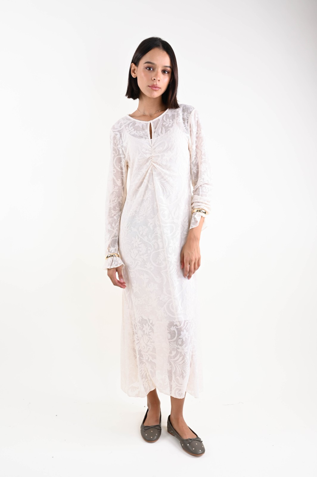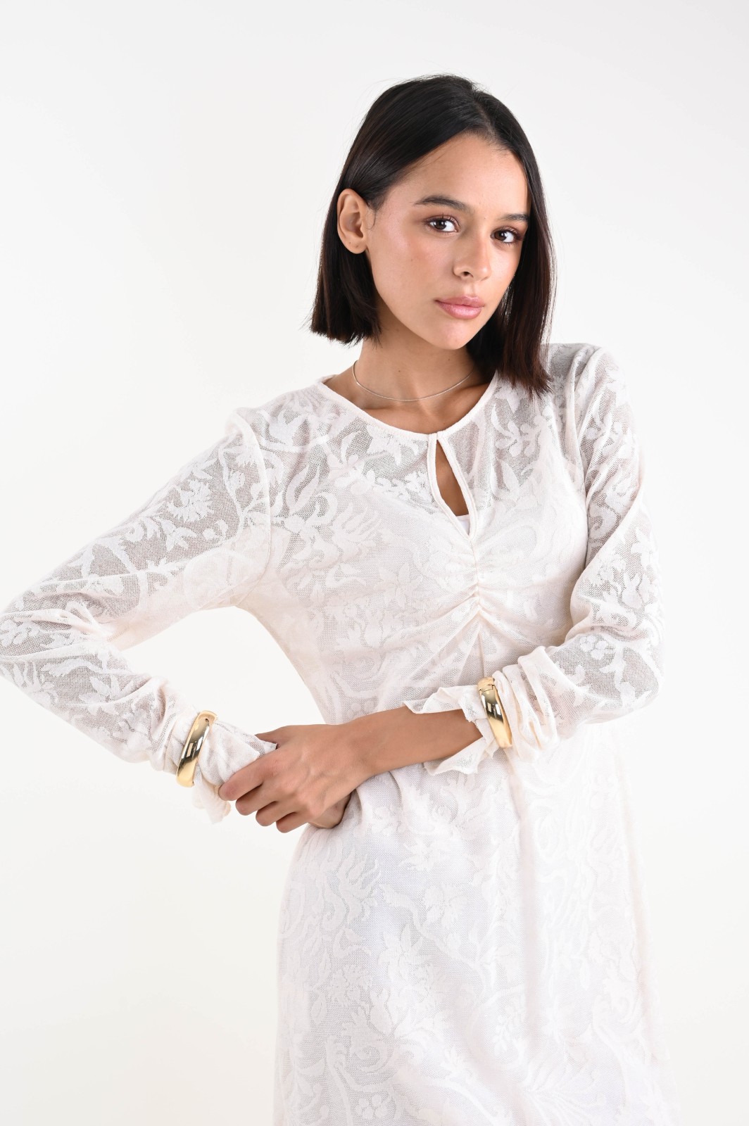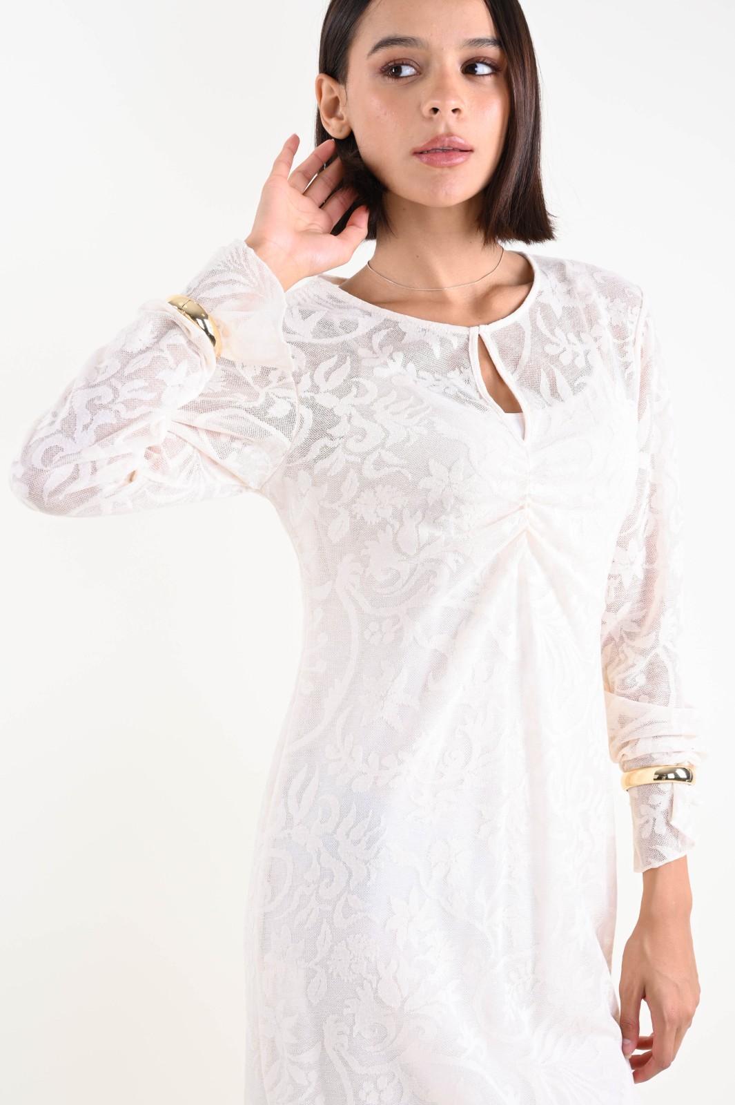 Este vestido de mujer está confeccionado en encaje ligero con un estampado tono sobre tono. Una prenda elegante y refinada que combina feminidad y estilo. El fruncido frontal y el escote redondo realzan la silueta con un toque sofisticado, mientras que las mangas largas le aportan una elegancia atemporal. Perfecto para combinar con accesorios sofisticados en ceremonias, veladas elegantes o eventos especiales, este versátil vestido aporta personalidad y encanto a cualquier look.