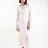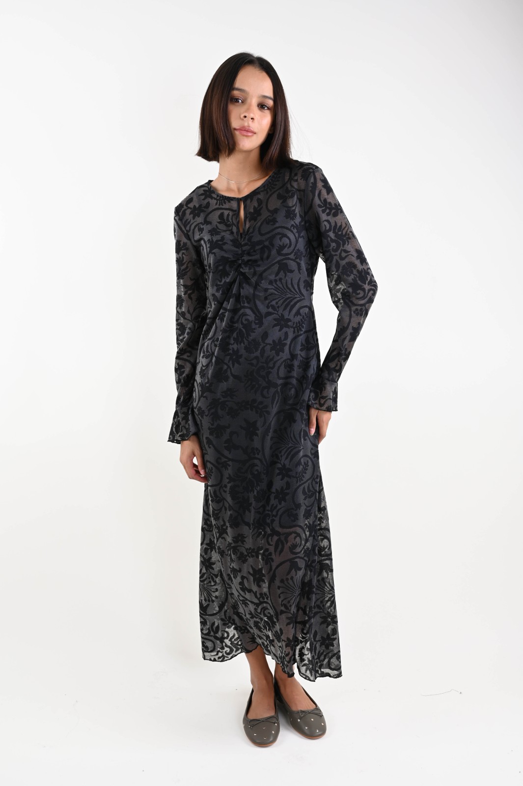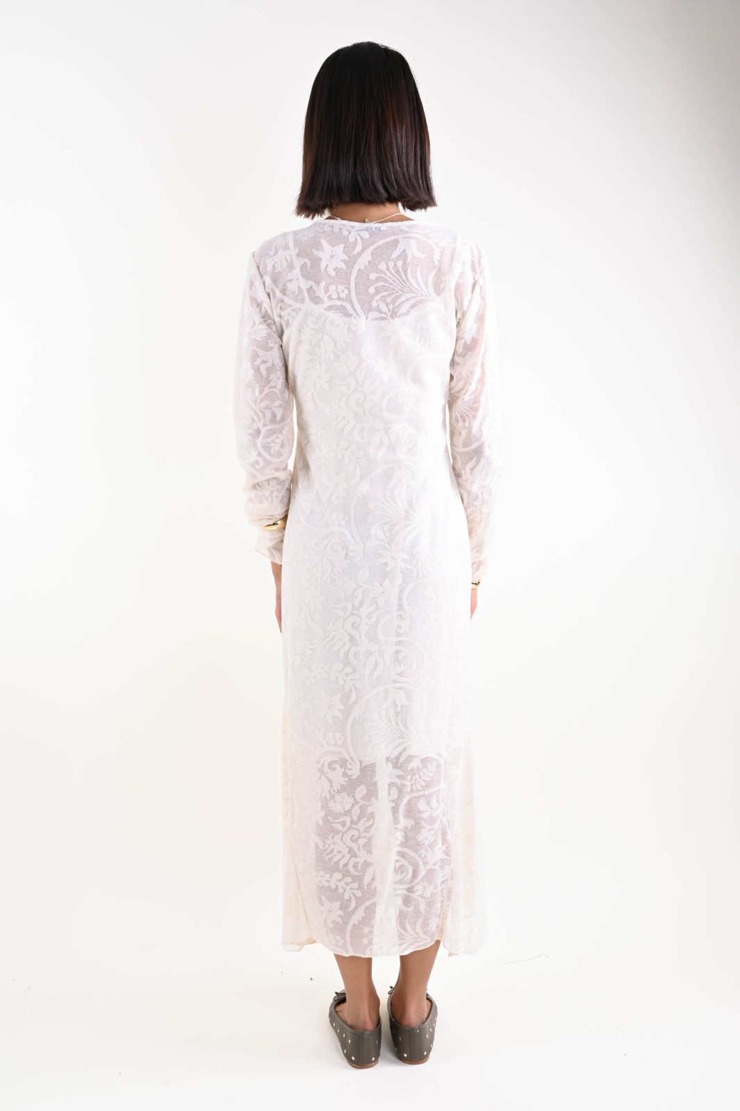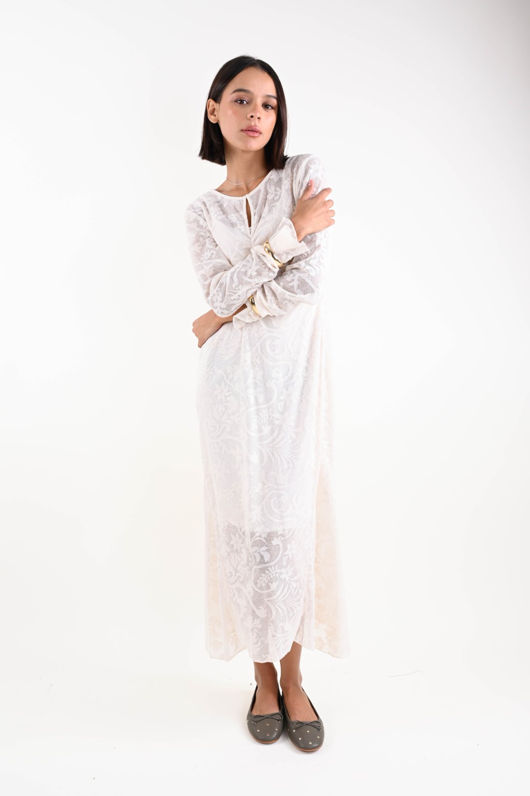 Este vestido de mujer está confeccionado en encaje ligero con un estampado tono sobre tono. Una prenda elegante y refinada que combina feminidad y estilo. El fruncido frontal y el escote redondo realzan la silueta con un toque sofisticado, mientras que las mangas largas le aportan una elegancia atemporal. Perfecto para combinar con accesorios sofisticados en ceremonias, veladas elegantes o eventos especiales, este versátil vestido aporta personalidad y encanto a cualquier look.