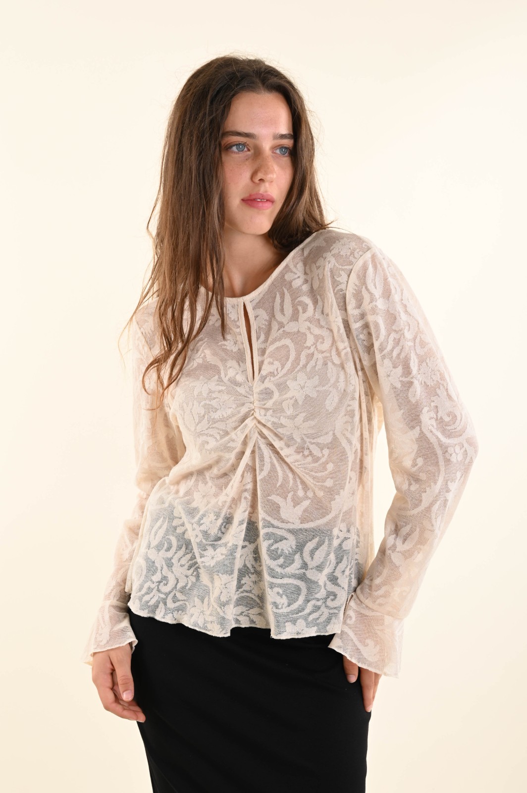 Esta blusa para mujer está confeccionada en encaje ligero con un estampado tono sobre tono. Es una prenda elegante y refinada que combina feminidad y estilo. El fruncido frontal y el escote redondo realzan la silueta con un toque sofisticado, mientras que las mangas largas le aportan una elegancia atemporal. Perfecta para combinar con pantalones o faldas de sastre para looks de oficina o veladas elegantes, es una prenda versátil que aporta personalidad y encanto a cualquier look.