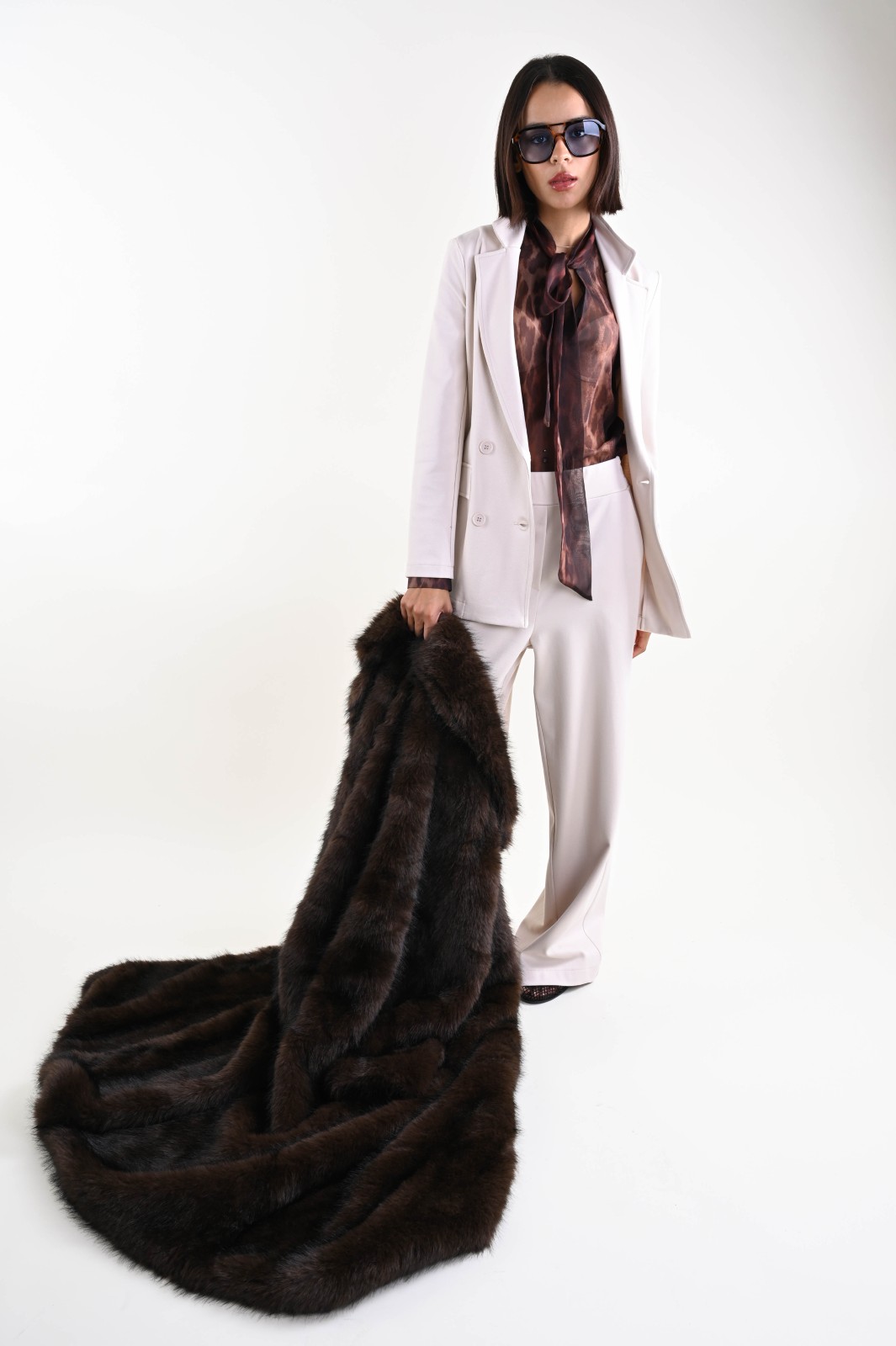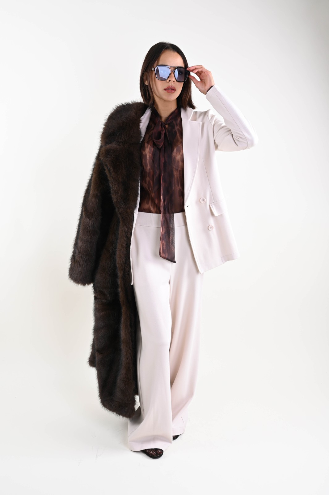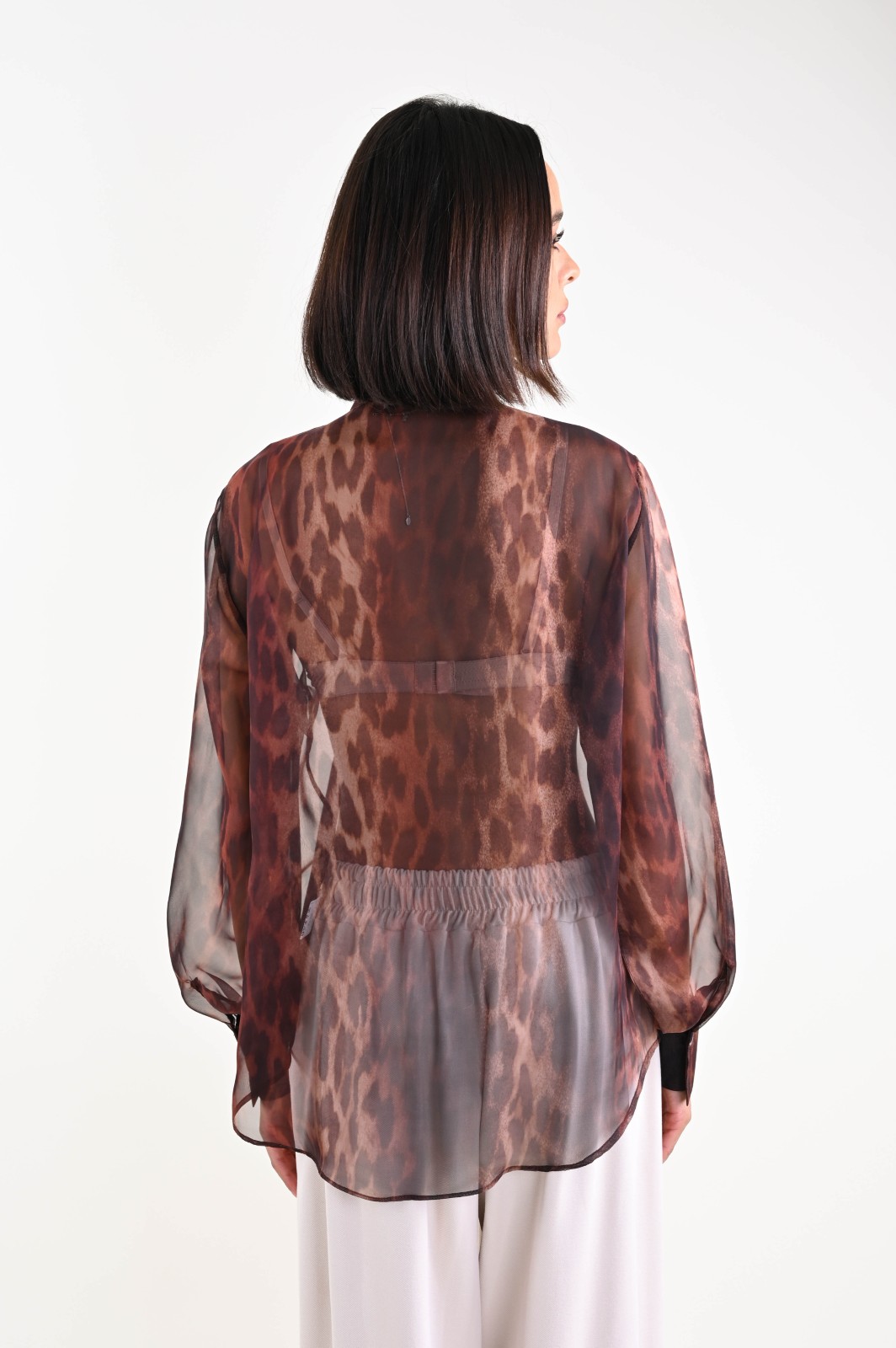 Blusa de mujer en gasa ligera con estampado de leopardo, con mangas transparentes y detalle de lazo en el cuello. Una prenda elegante y versátil, perfecta para combinar con pantalones o faldas y crear conjuntos elegantes y contemporáneos. Imprescindible para boutiques y tiendas de moda que buscan camisas elegantes para mujer, fáciles de combinar tanto para looks profesionales como de noche.