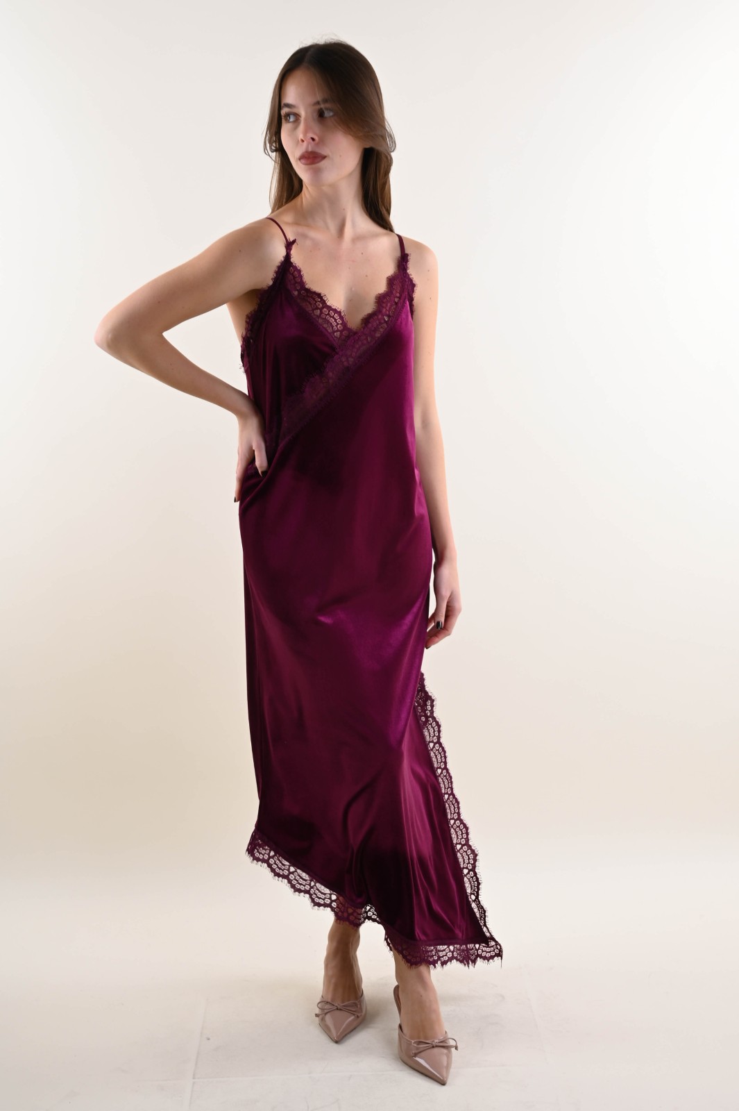 Vestido largo de terciopelo con tirantes finos y detalles de encaje en el escote y la abertura lateral. Su corte fluido y la suavidad de su tejido realzan la feminidad con elegancia y sensualidad. Una prenda refinada y contemporánea, ideal para ocasiones especiales.