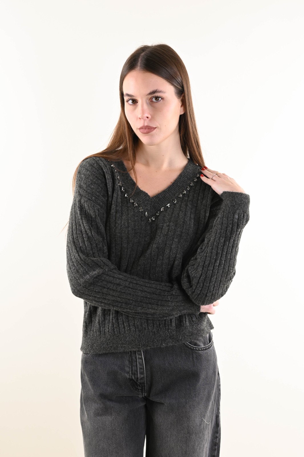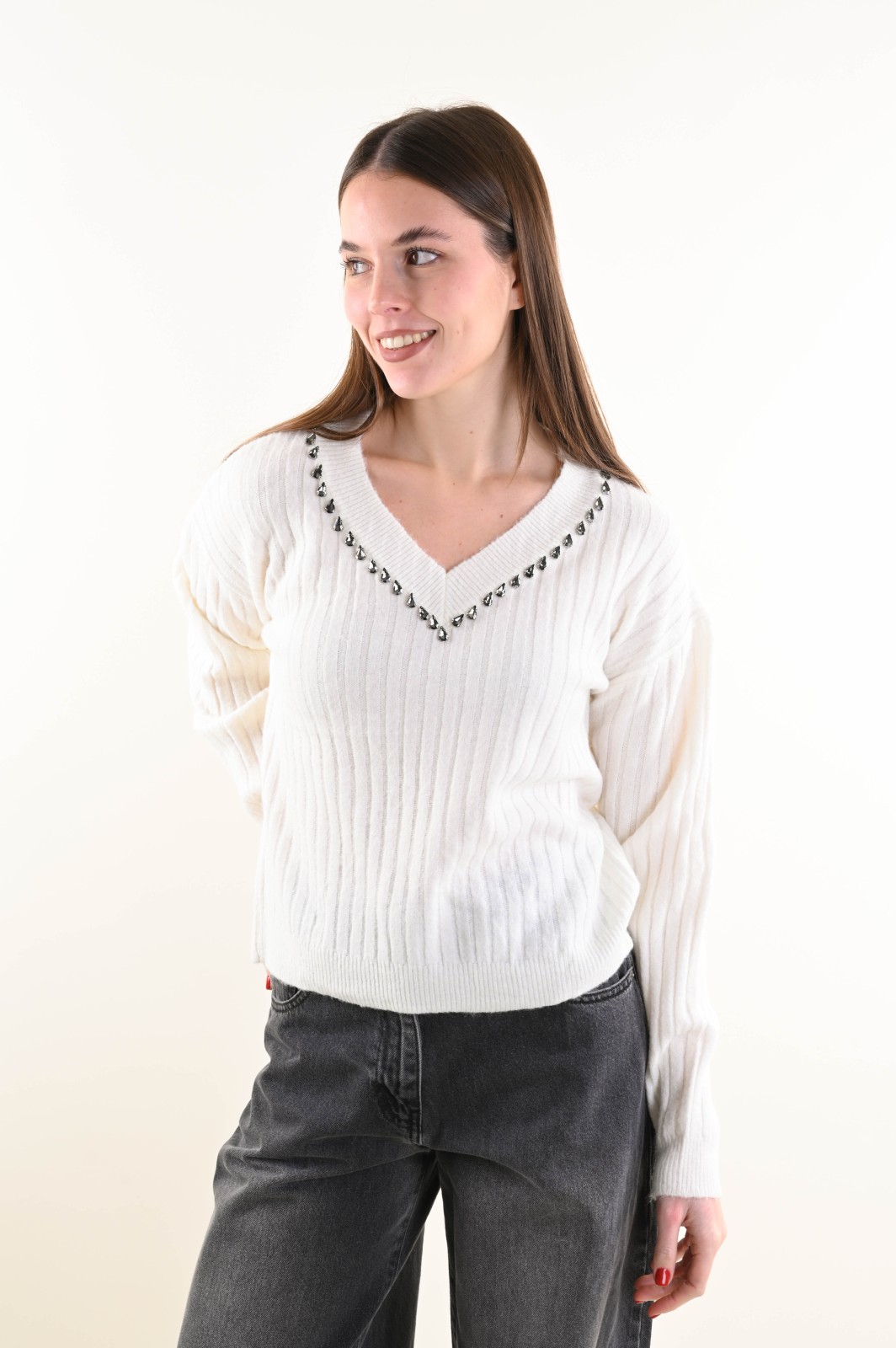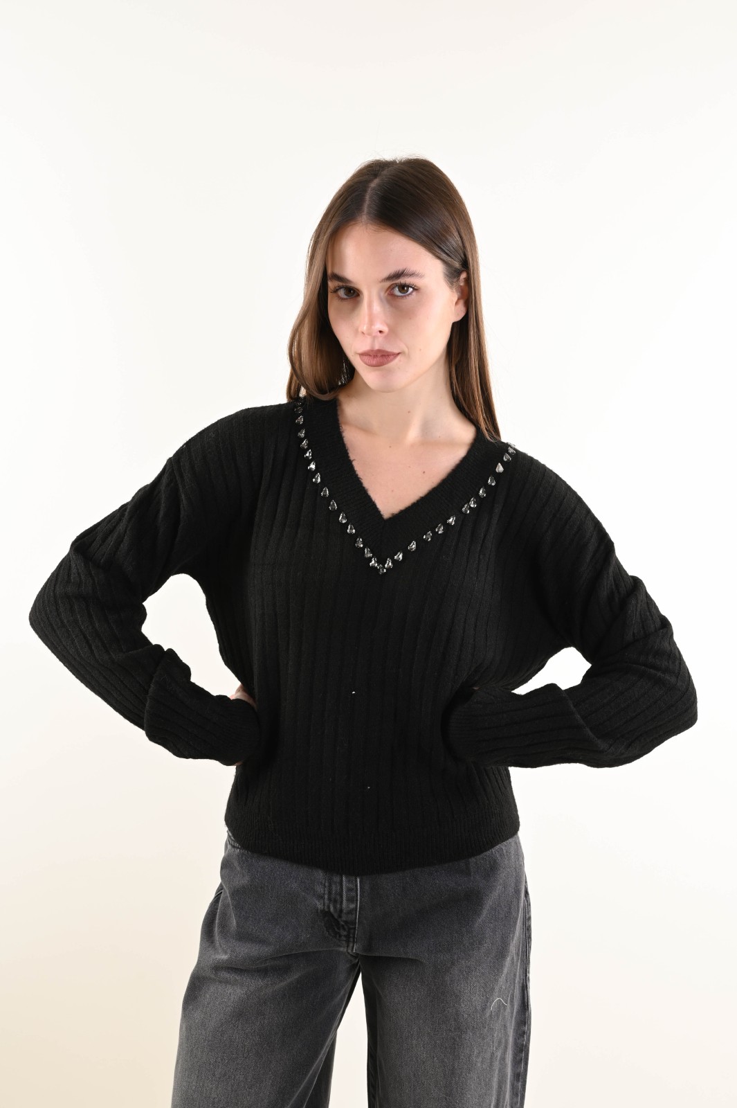 Suéter holgado de canalé con escote en V y un elegante detalle de joya. El estilo presenta puños y bajo de canalé para un ajuste cómodo y femenino. Una prenda versátil que combina comodidad y sofisticación, ideal para completar looks de diario y conjuntos más refinados.