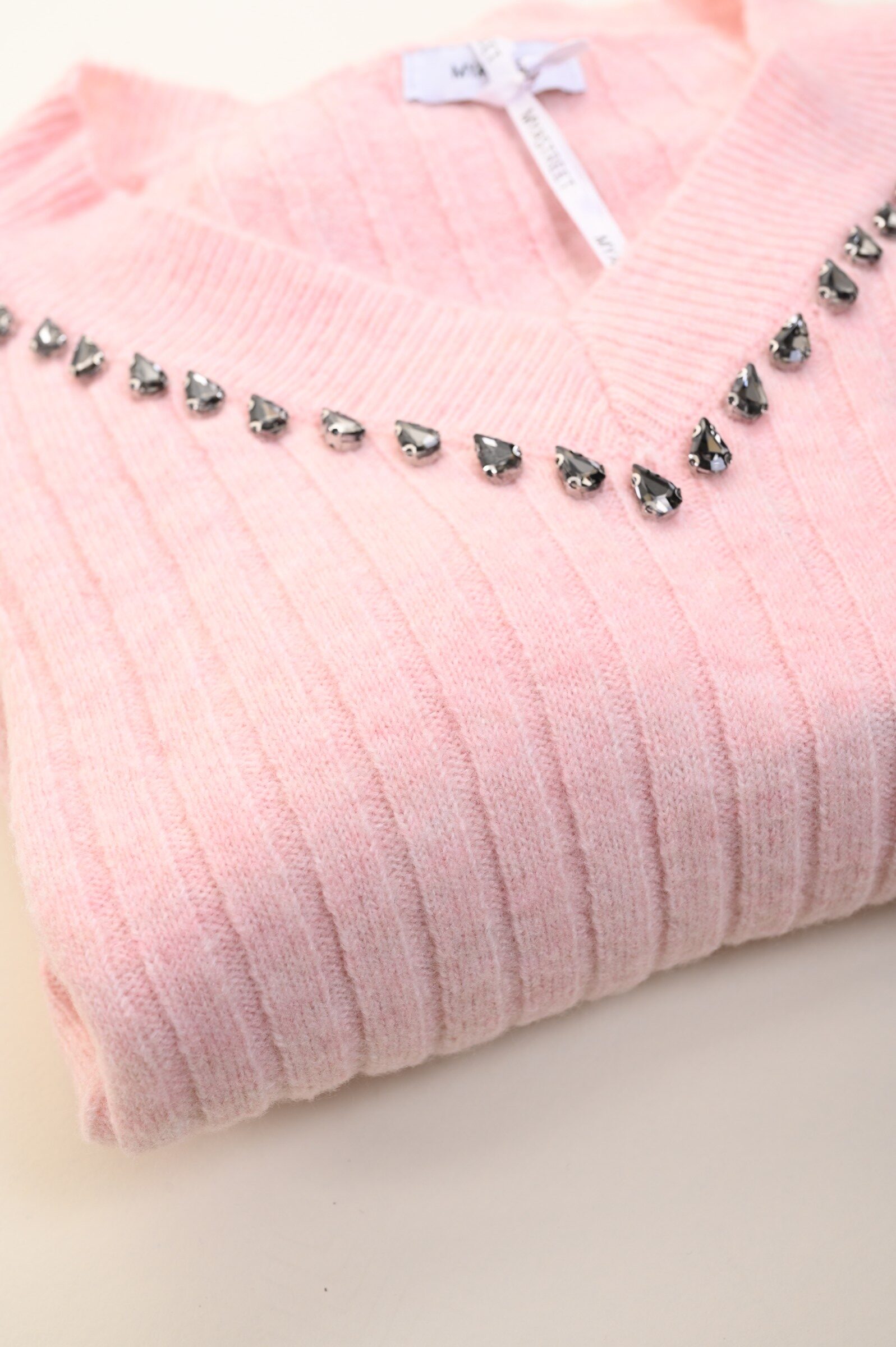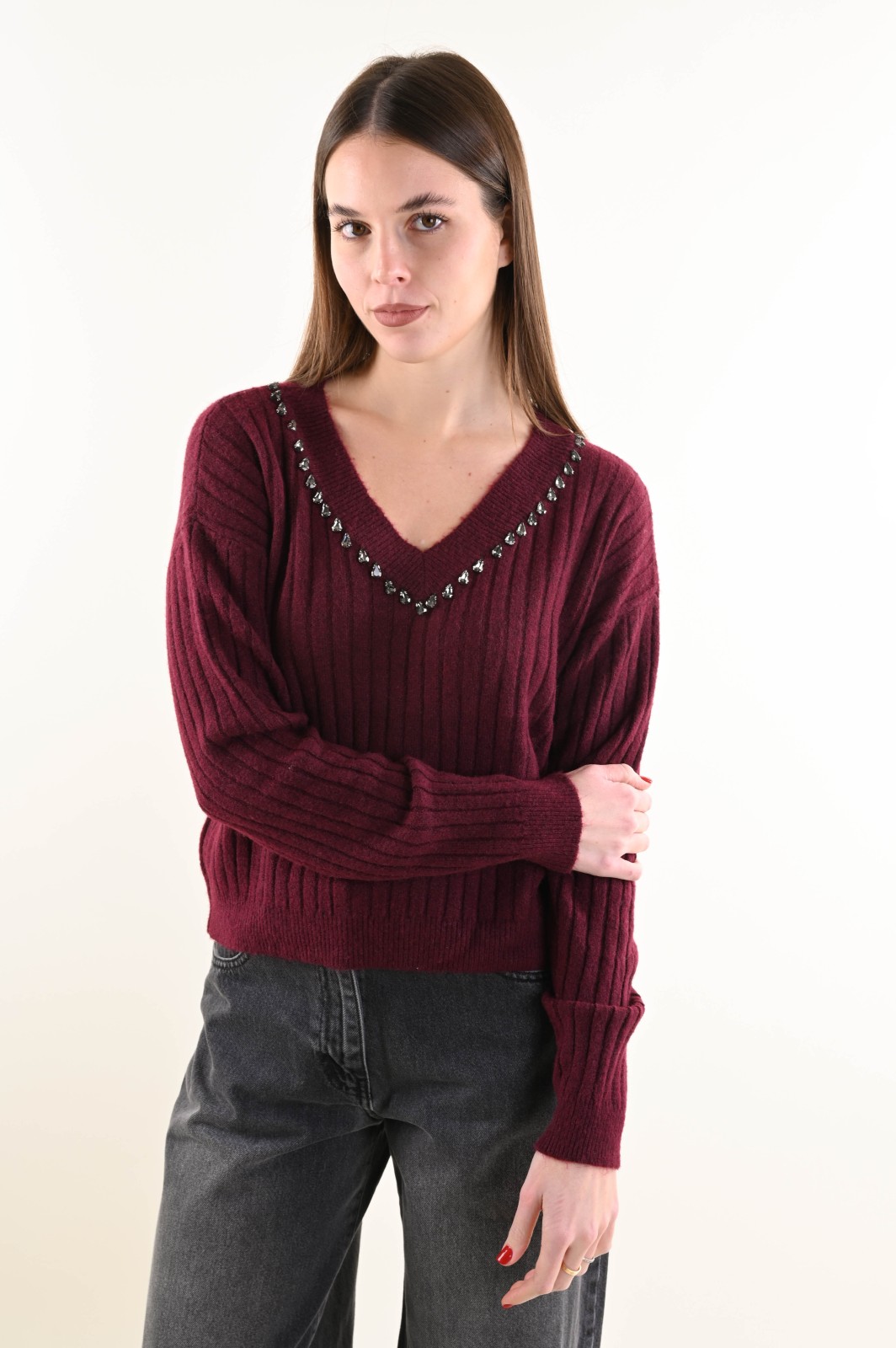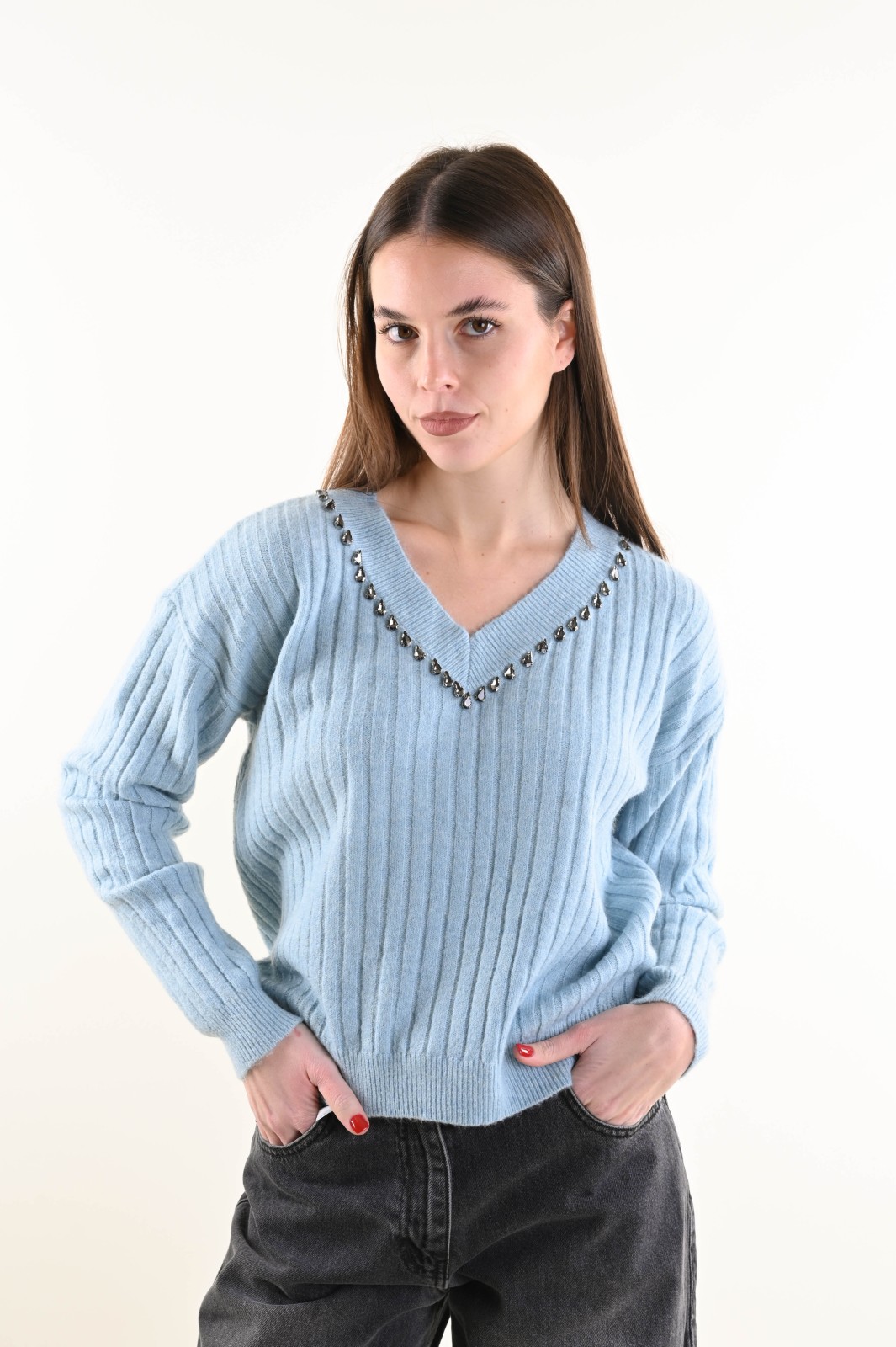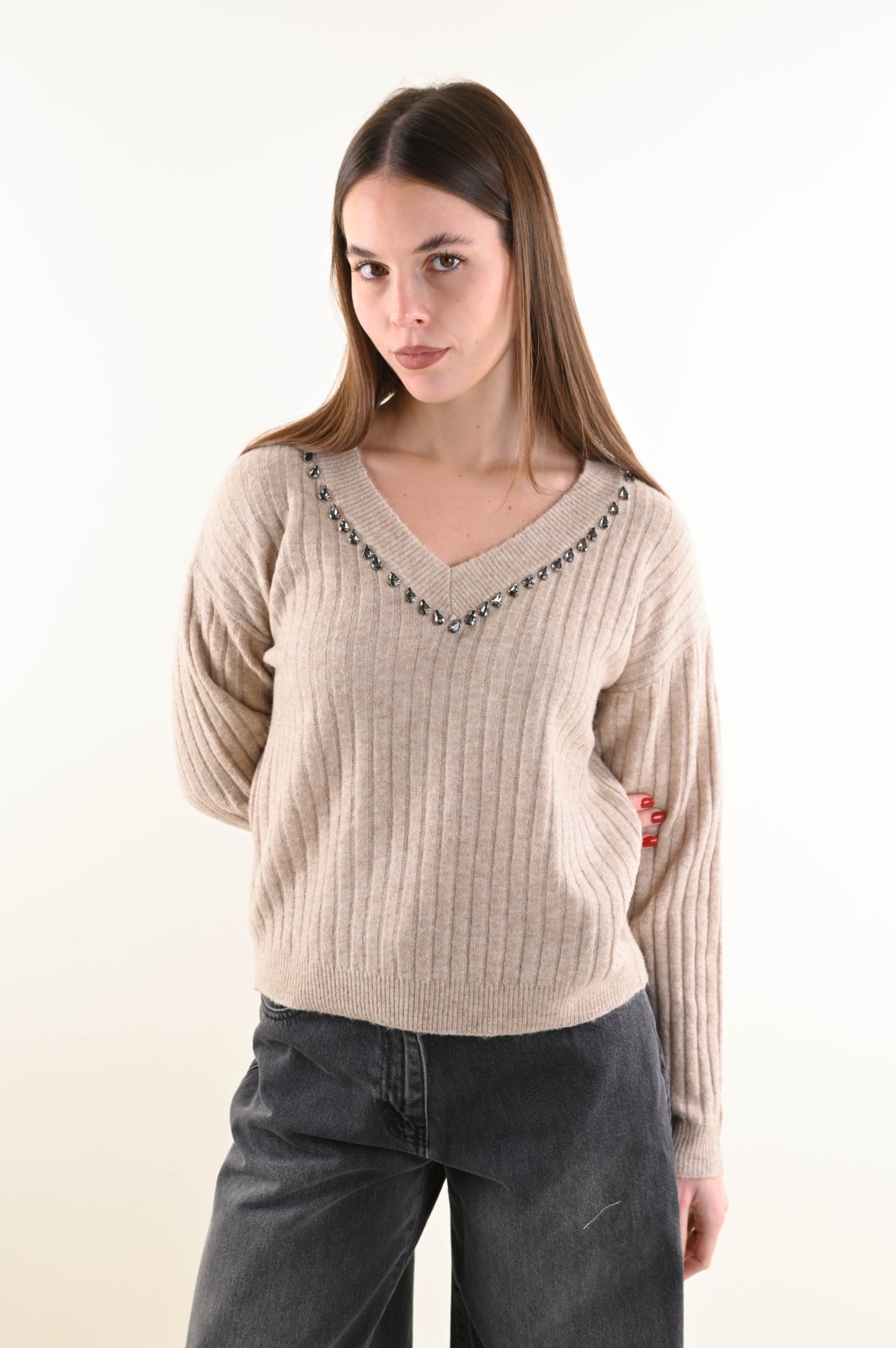 Suéter holgado de canalé con escote en V y un elegante detalle de joya. El estilo presenta puños y bajo de canalé para un ajuste cómodo y femenino. Una prenda versátil que combina comodidad y sofisticación, ideal para completar looks de diario y conjuntos más refinados.