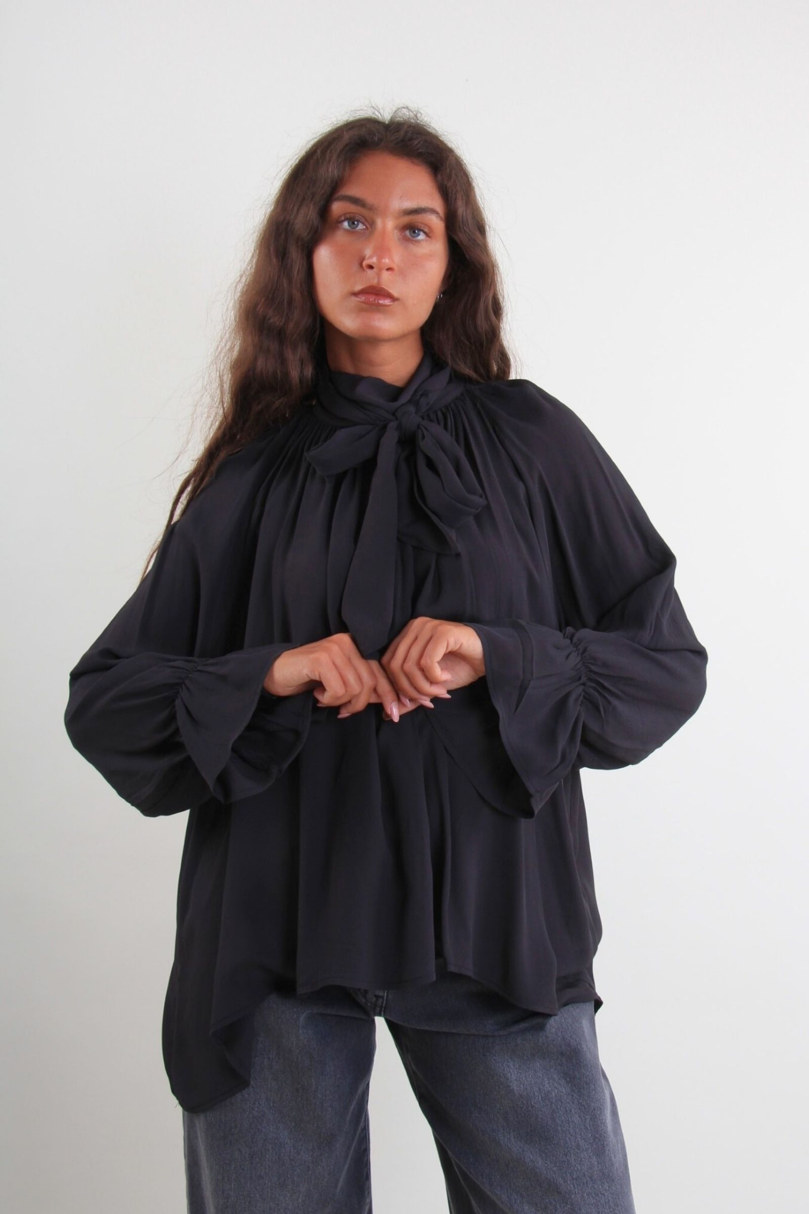 Camisa de mujer con lazo en el cuello y mangas largas fruncidas, una prenda icónica y refinada, perfecta para looks femeninos y sofisticados. Su diseño fluido y ligero se adapta suavemente al cuerpo, ofreciendo un ajuste cómodo y una elegancia atemporal. El detalle del lazo le da un toque romántico, mientras que las mangas y puños fruncidos completan el look con estilo. Ideal para combinar con pantalones de vestir, faldas midi o vaqueros para un look chic y natural.