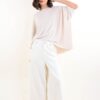 Maglia donna dal design contemporaneo, caratterizzata da una vestibilità oversize e da una linea fluida che garantisce comfort e libertà di movimento. Il modello presenta scollo girocollo, maniche ampie e una lunghezza irregolare sul fondo che dona dinamismo e modernità al capo.