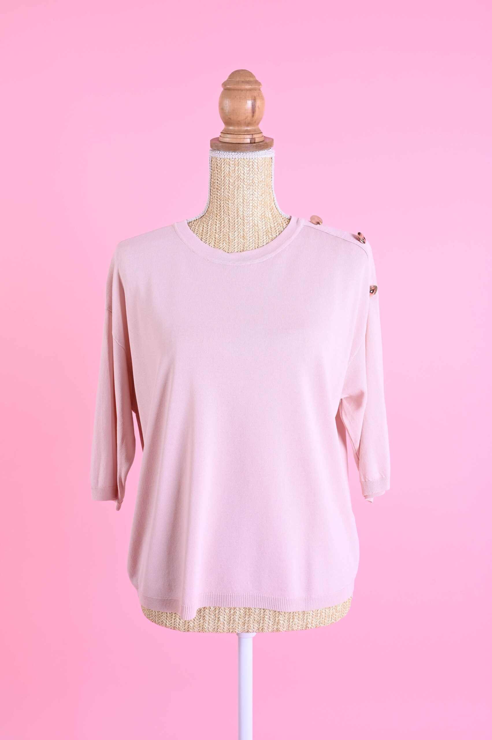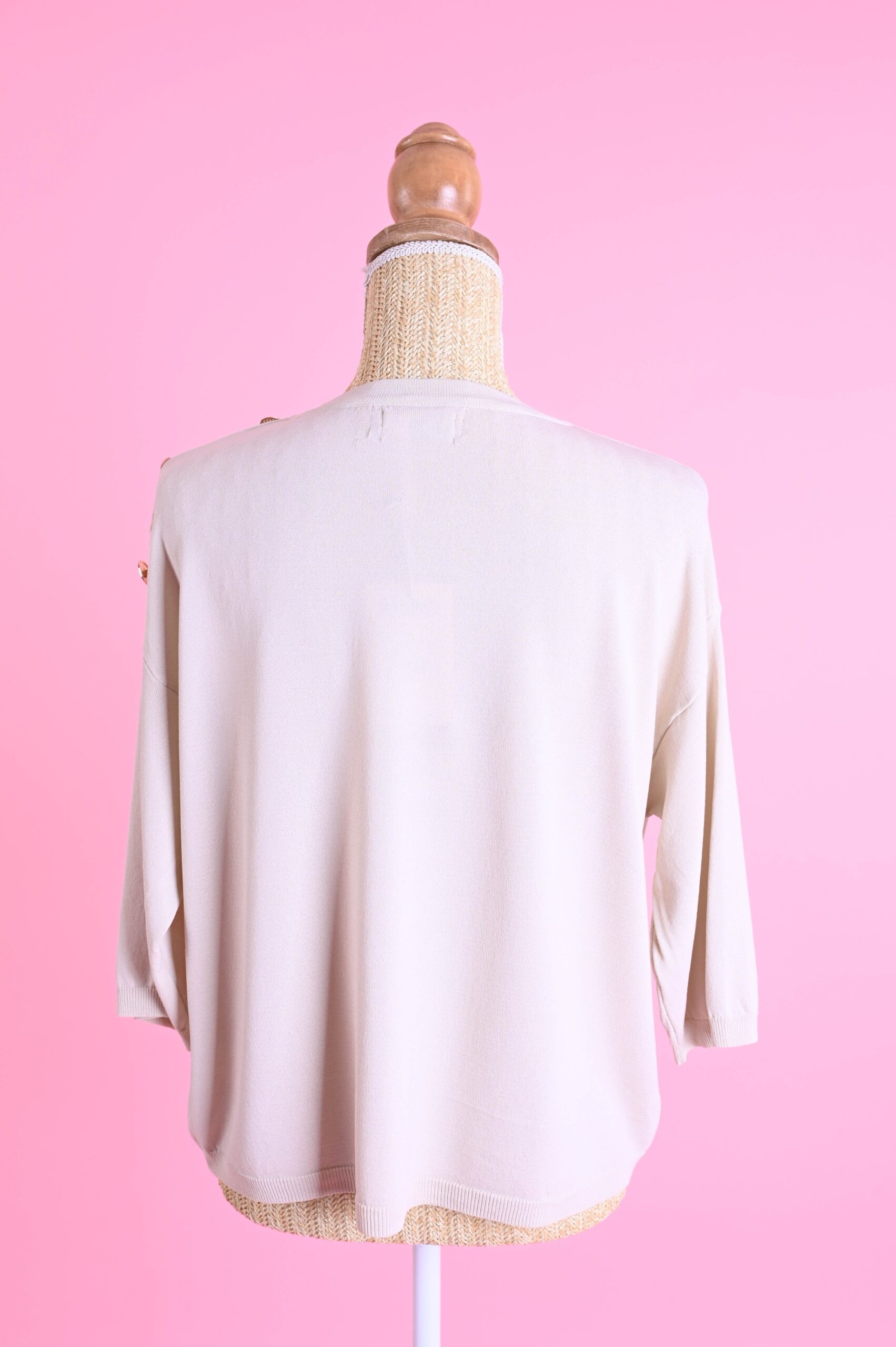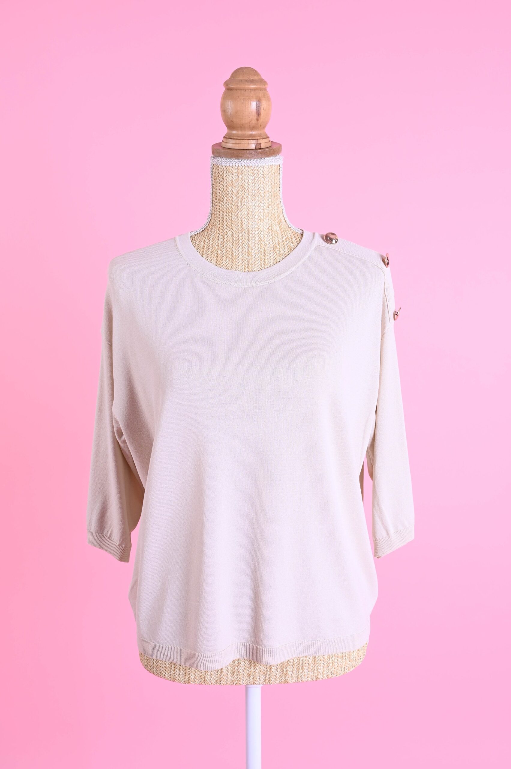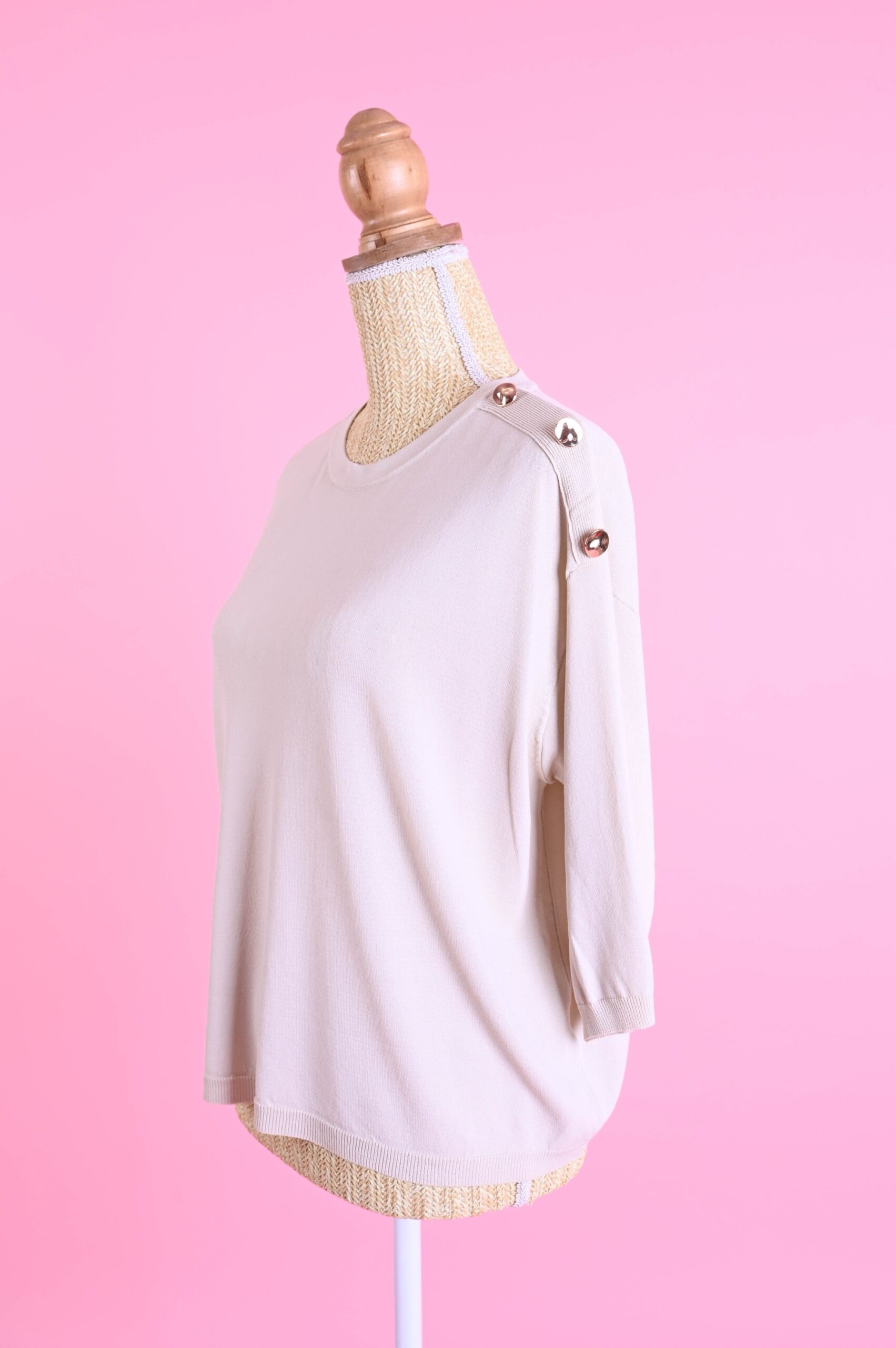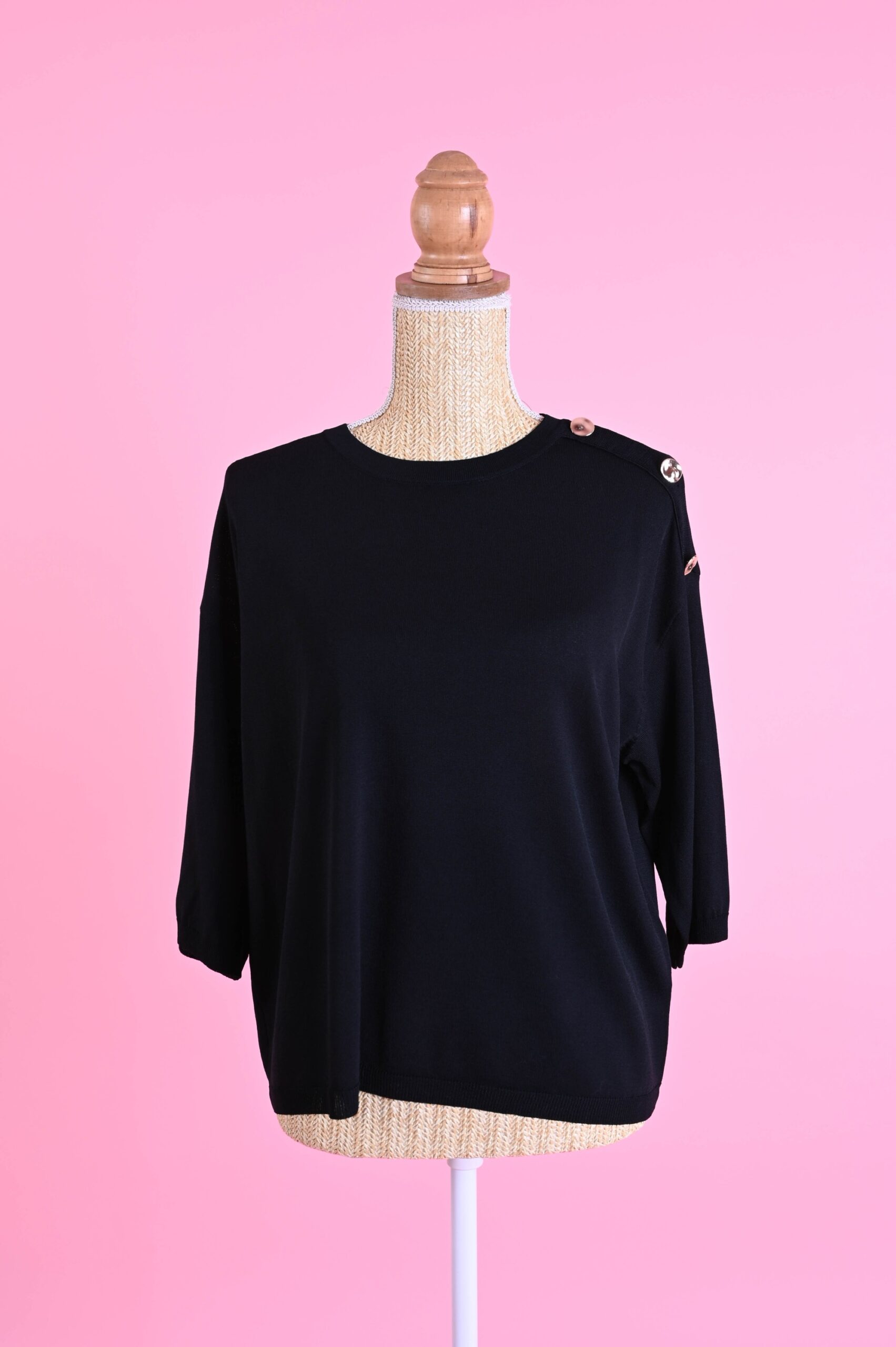 I bottoni sulla spalla valorizzano il design della maglia e conferiscono un tocco ricercato, rendendola facilmente abbinabile sia a look casual che più curati. Le maniche a ¾ la rendono perfetta per la mezza stagione e per creare outfit equilibrati e moderni.