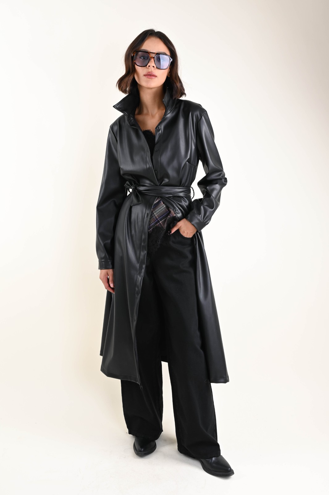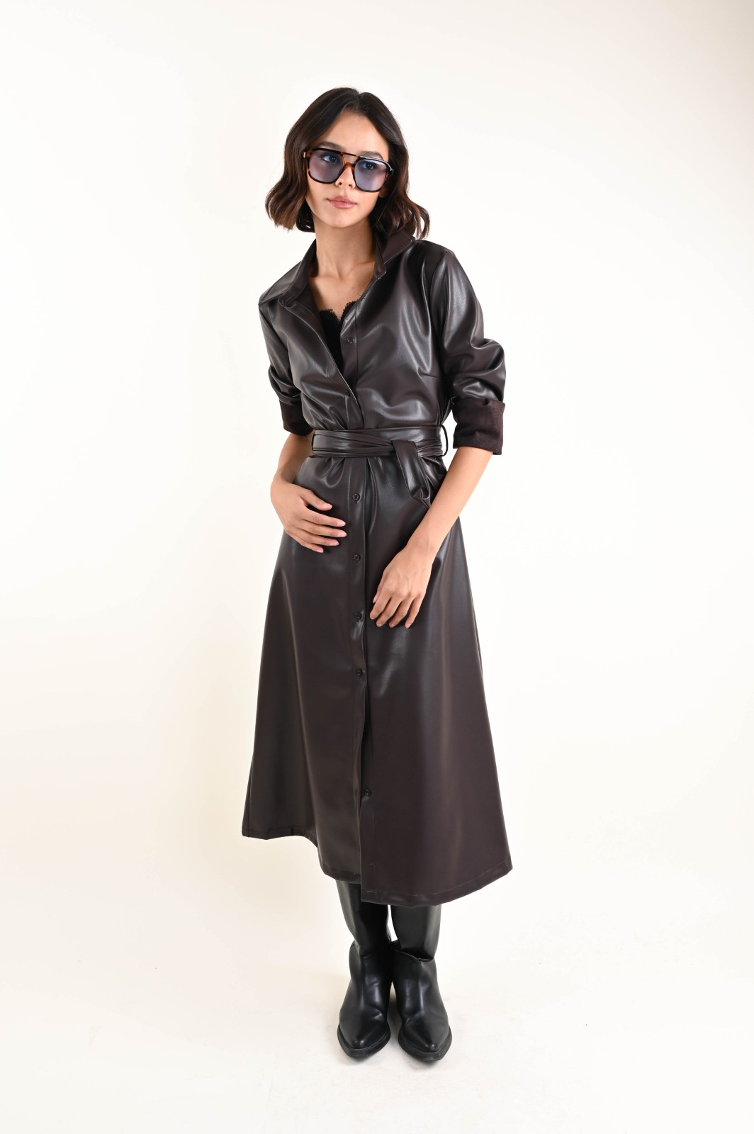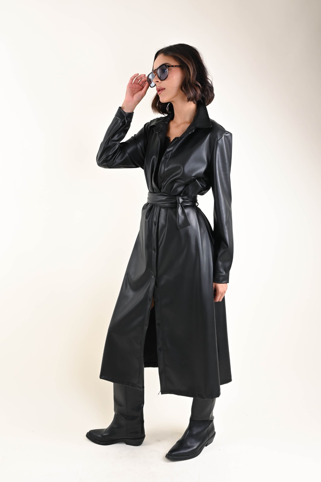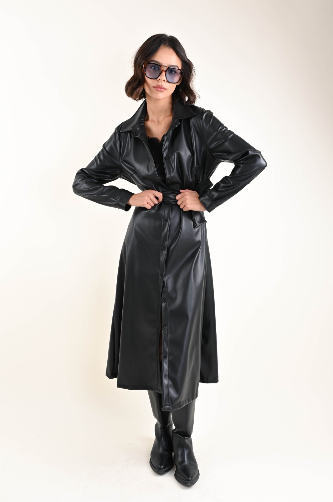 Abito chemisier a maniche lunghe in ecopelle, dal design moderno e sofisticato. Un capo grintoso e versatile, perfetto per creare look decisi ma sempre femminili. La linea chemisier valorizza la silhouette, mentre il tessuto in ecopelle aggiunge carattere e stile. Ideale da indossare con stivali o décolleté per un outfit elegante e contemporaneo.