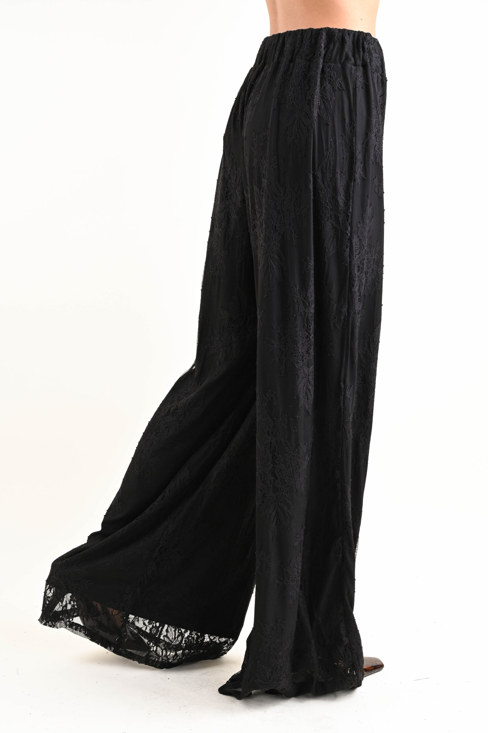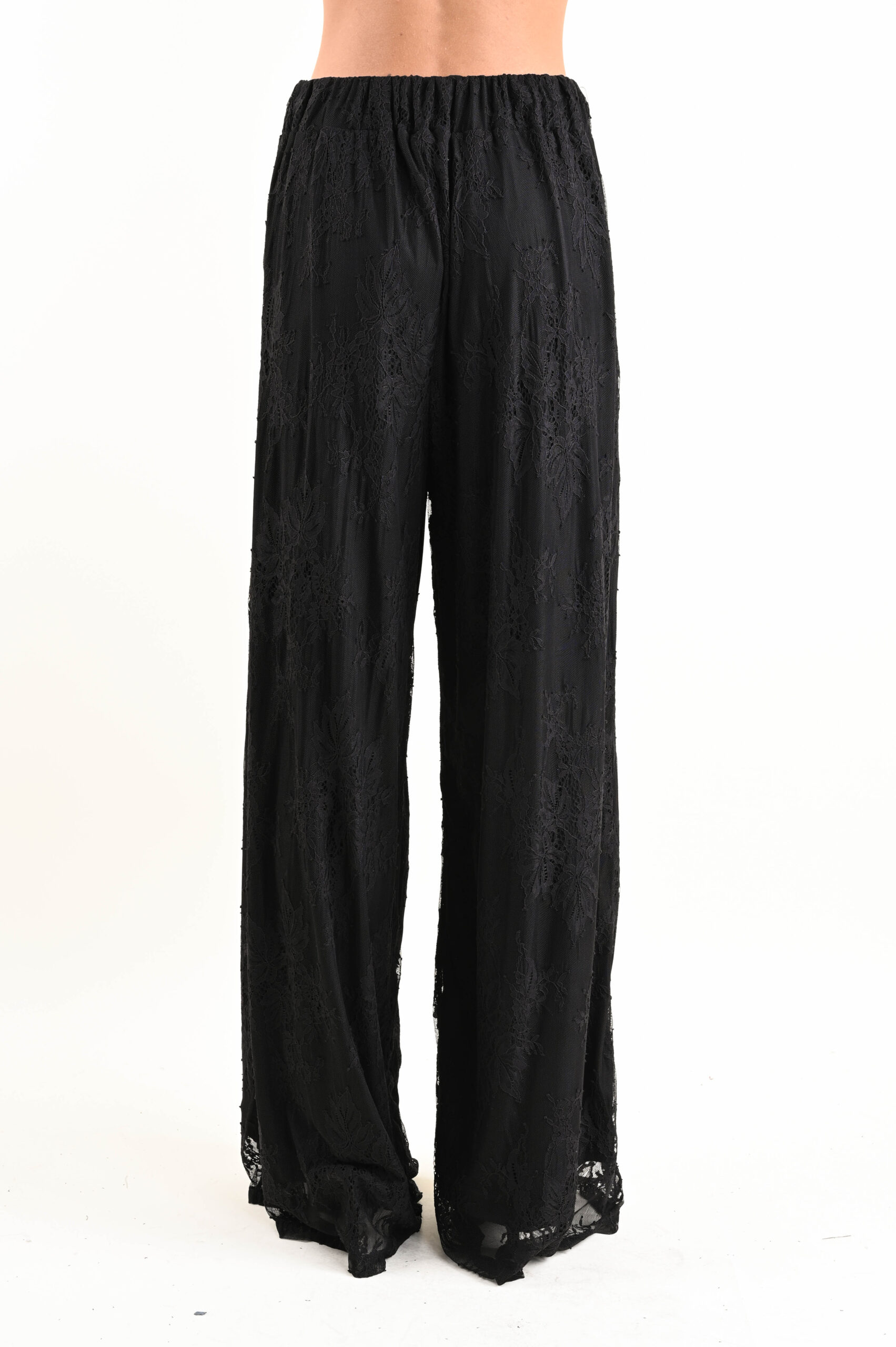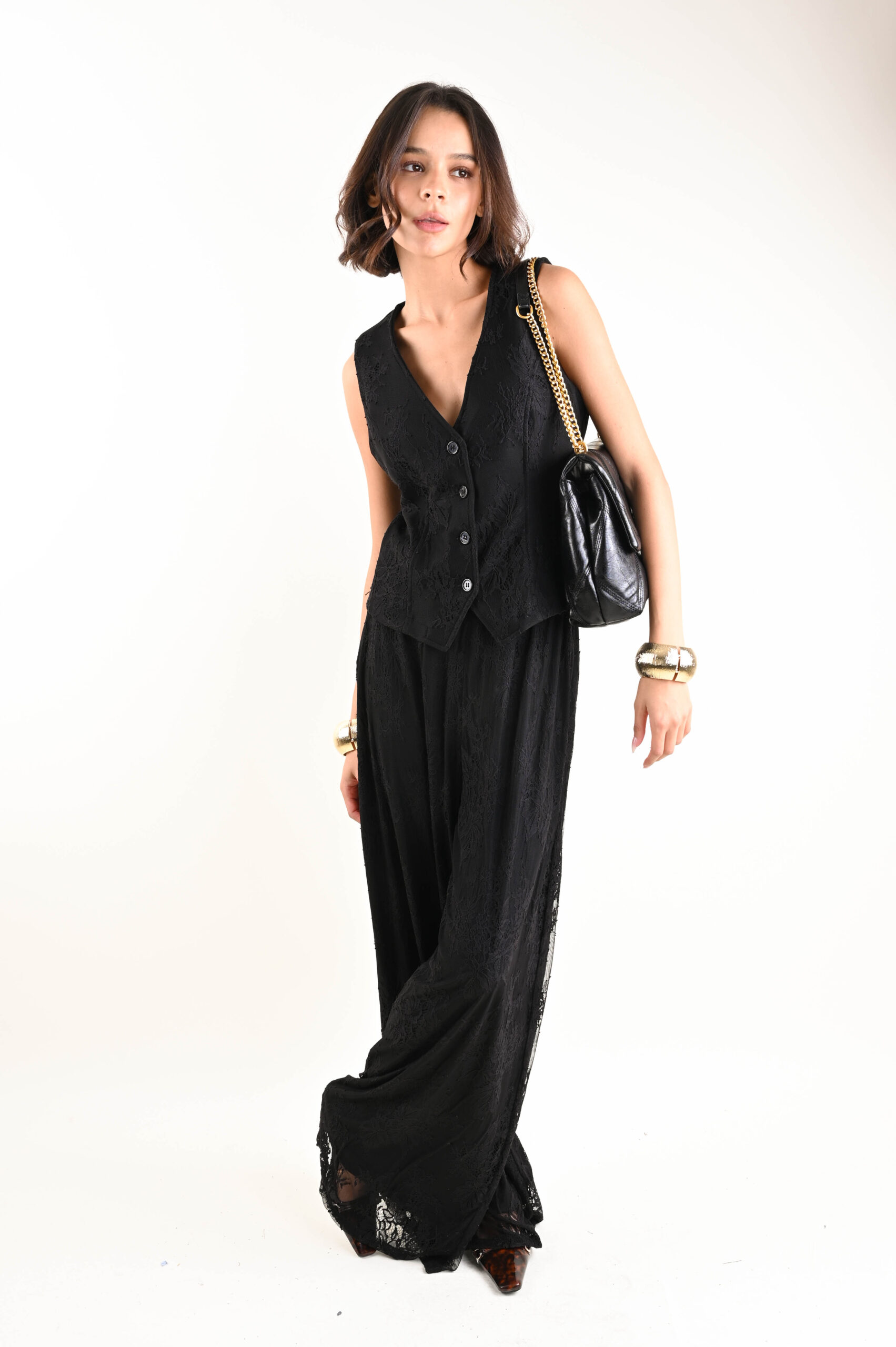 Pantalone ampio realizzato in pizzo floreale tono su tono, leggero e raffinato. La linea fluida scivola morbida lungo la gamba, mentre la vita elasticata garantisce comfort e vestibilità perfetta. Il gioco di trasparenze e la texture ricercata rendono questo modello ideale per look eleganti e contemporanei, da indossare con il suo gilet coordinato o con capi basici per un effetto più disinvolto. Una proposta che esprime pienamente la femminilità sofisticata di Myastreet.