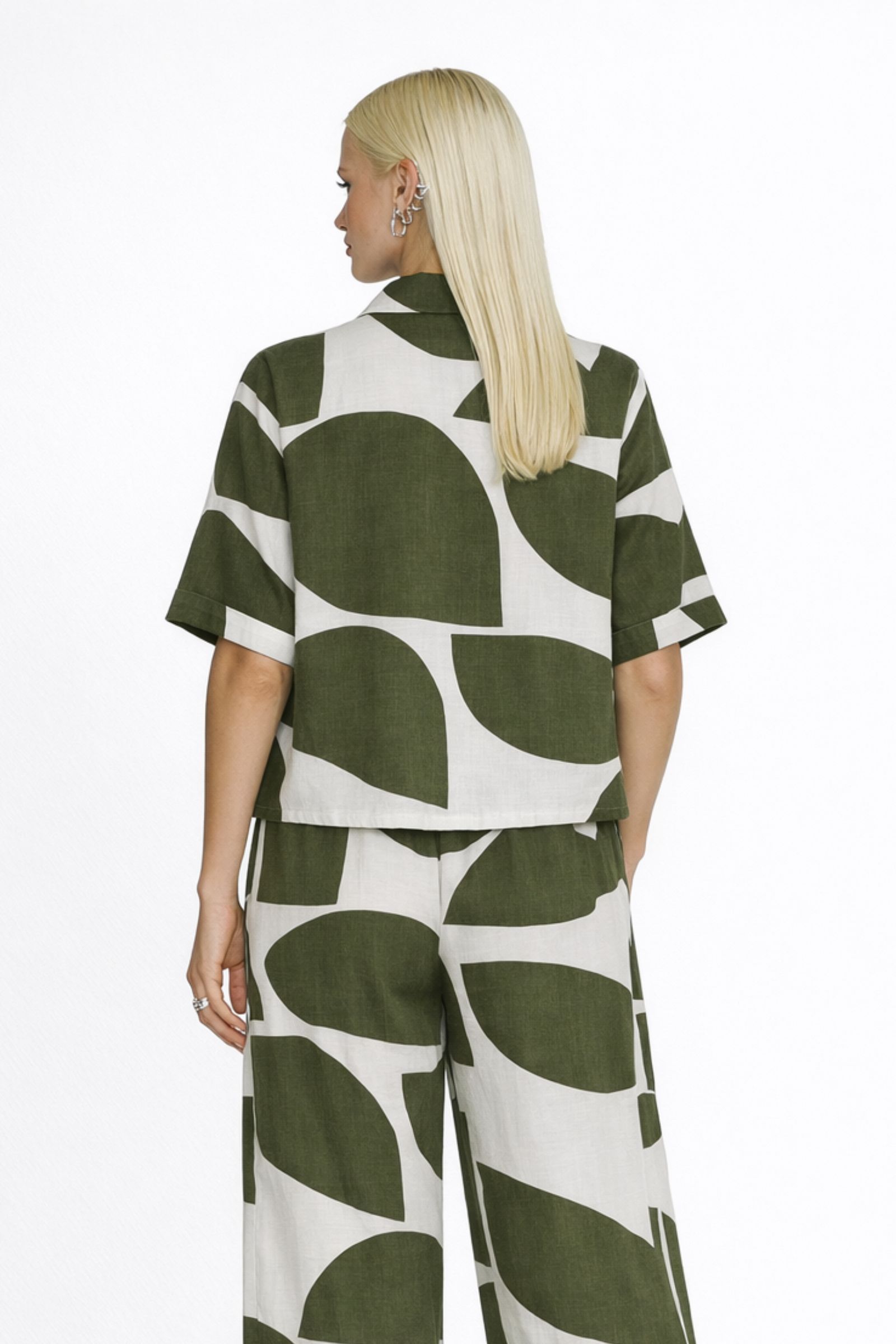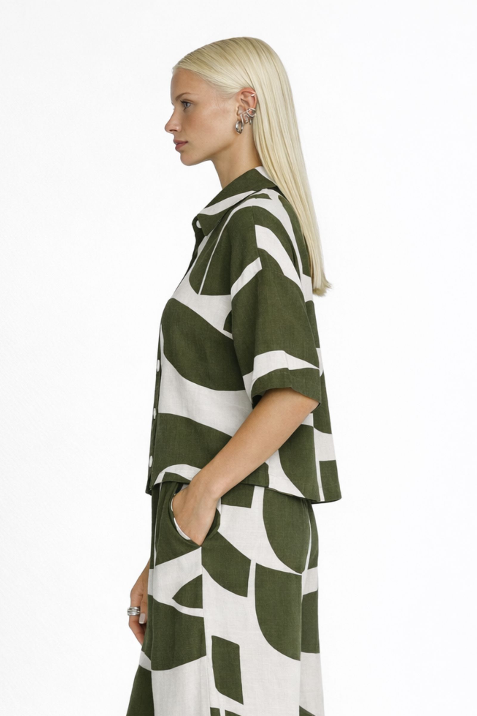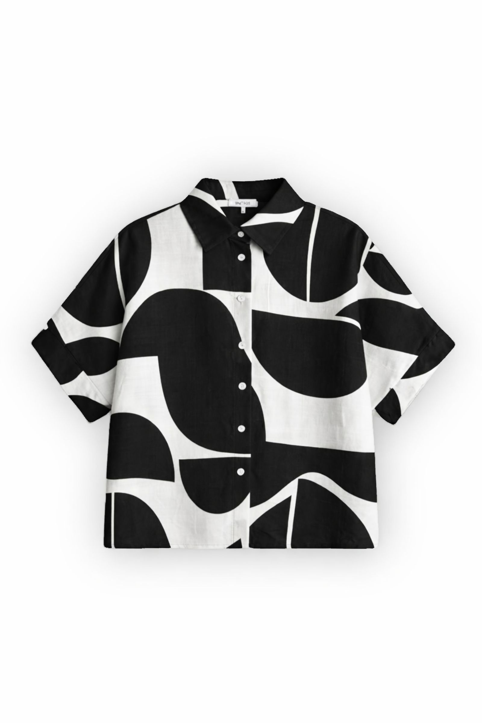 Camicia a maniche corte in fantasia astratta, pensata per una donna che ama uno stile contemporaneo e distintivo. La linea fluida e la vestibilità confortevole la rendono perfetta per affrontare la stagione con leggerezza e personalità.