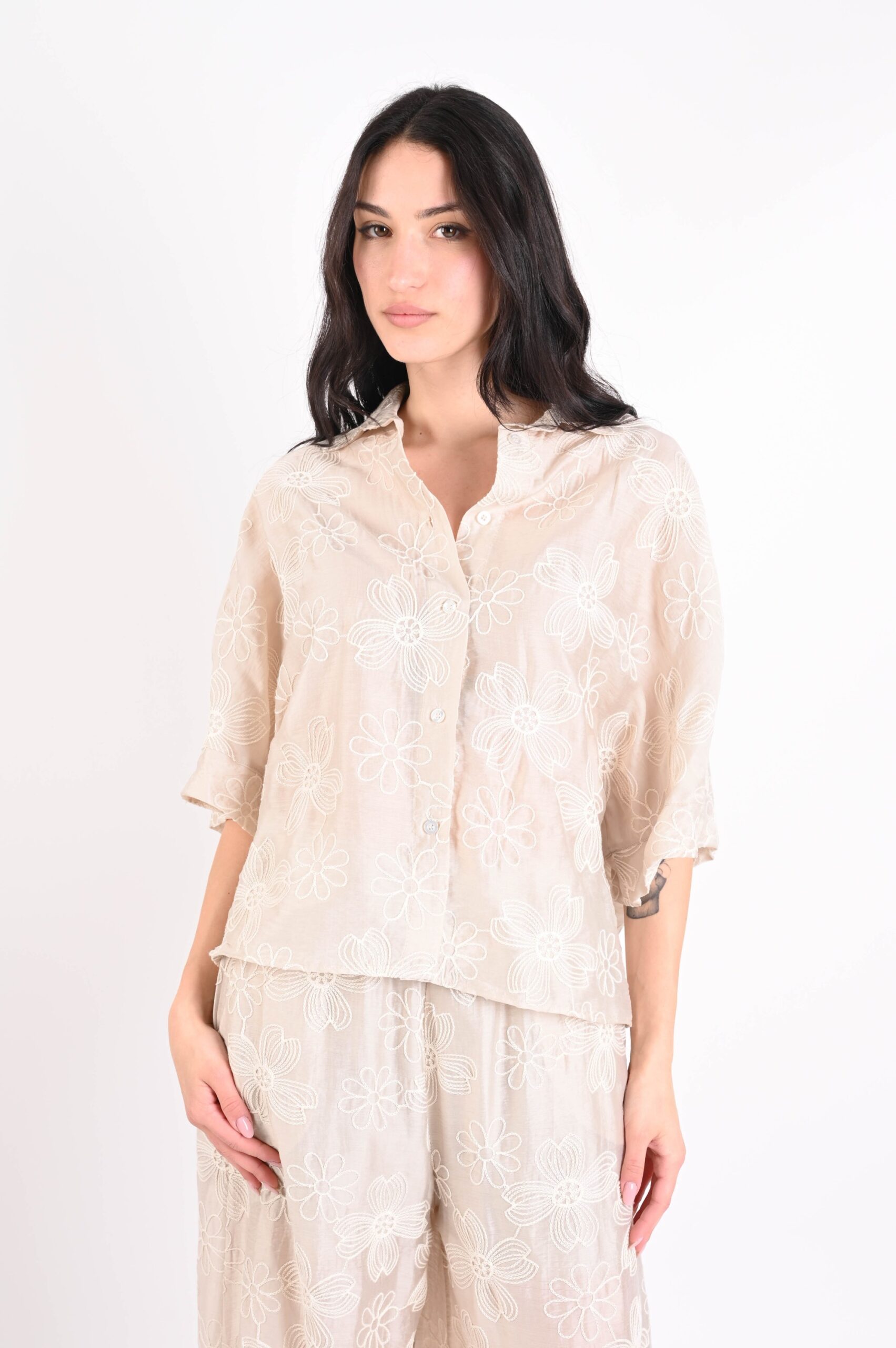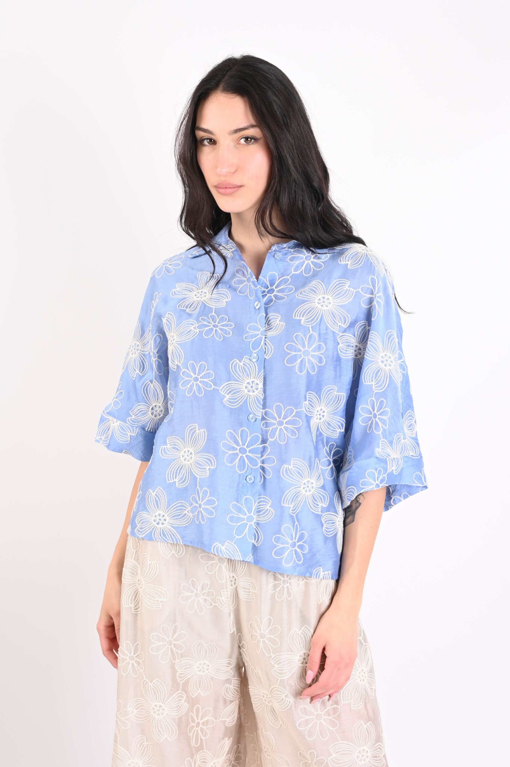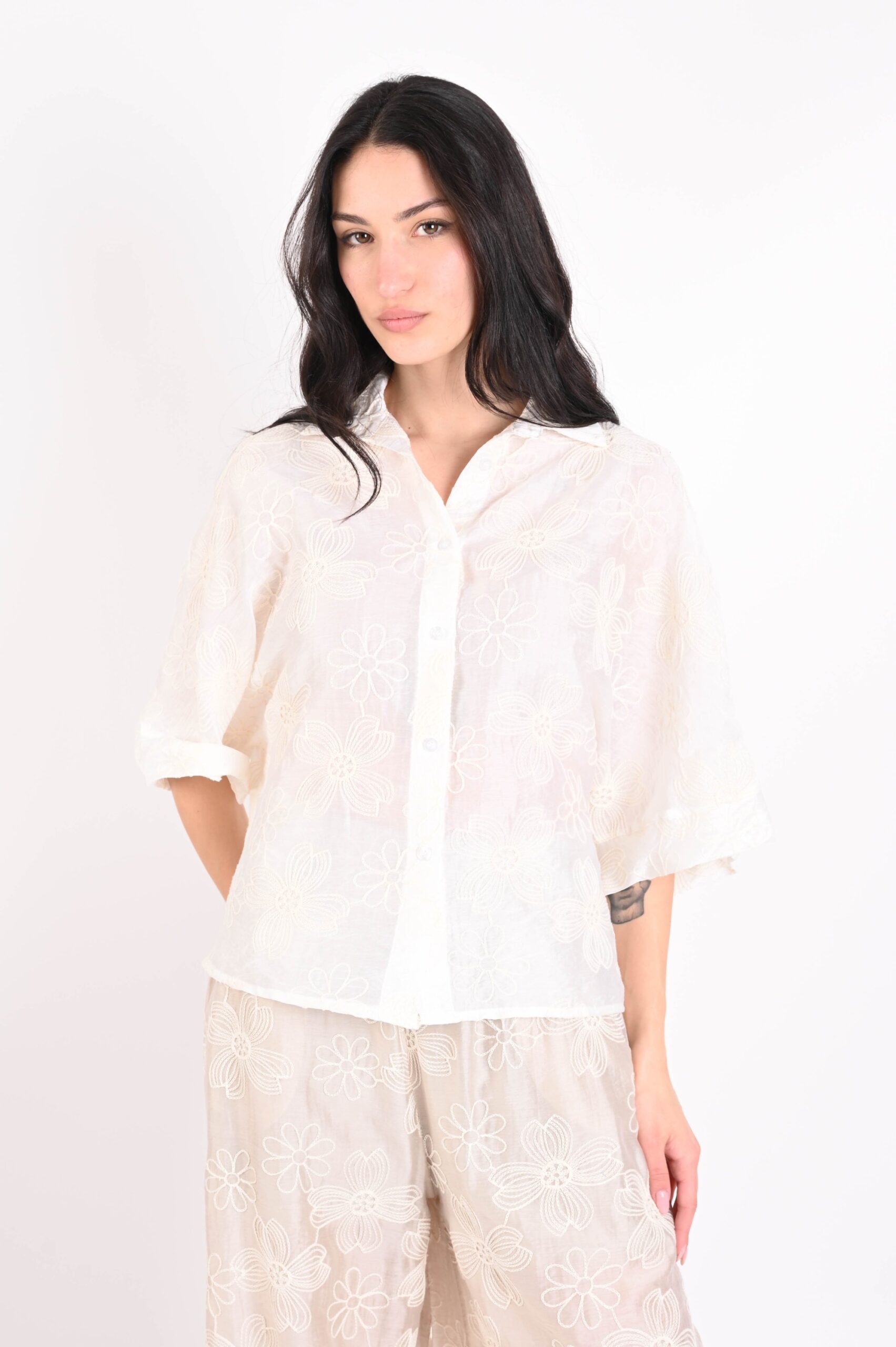 CAMICIA IN TENCEL CON RICAMI FLOREALI A MANICHE CORTE