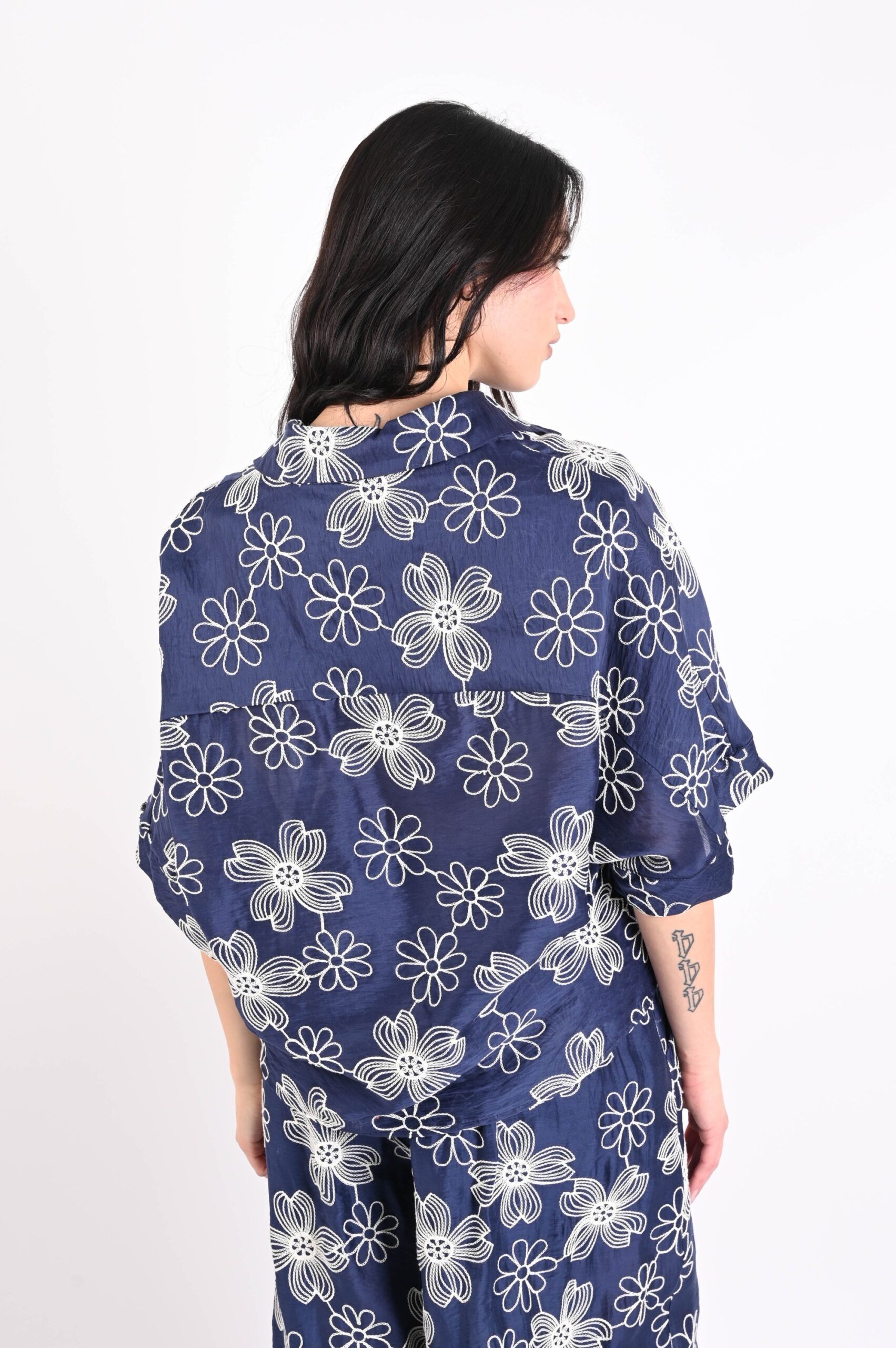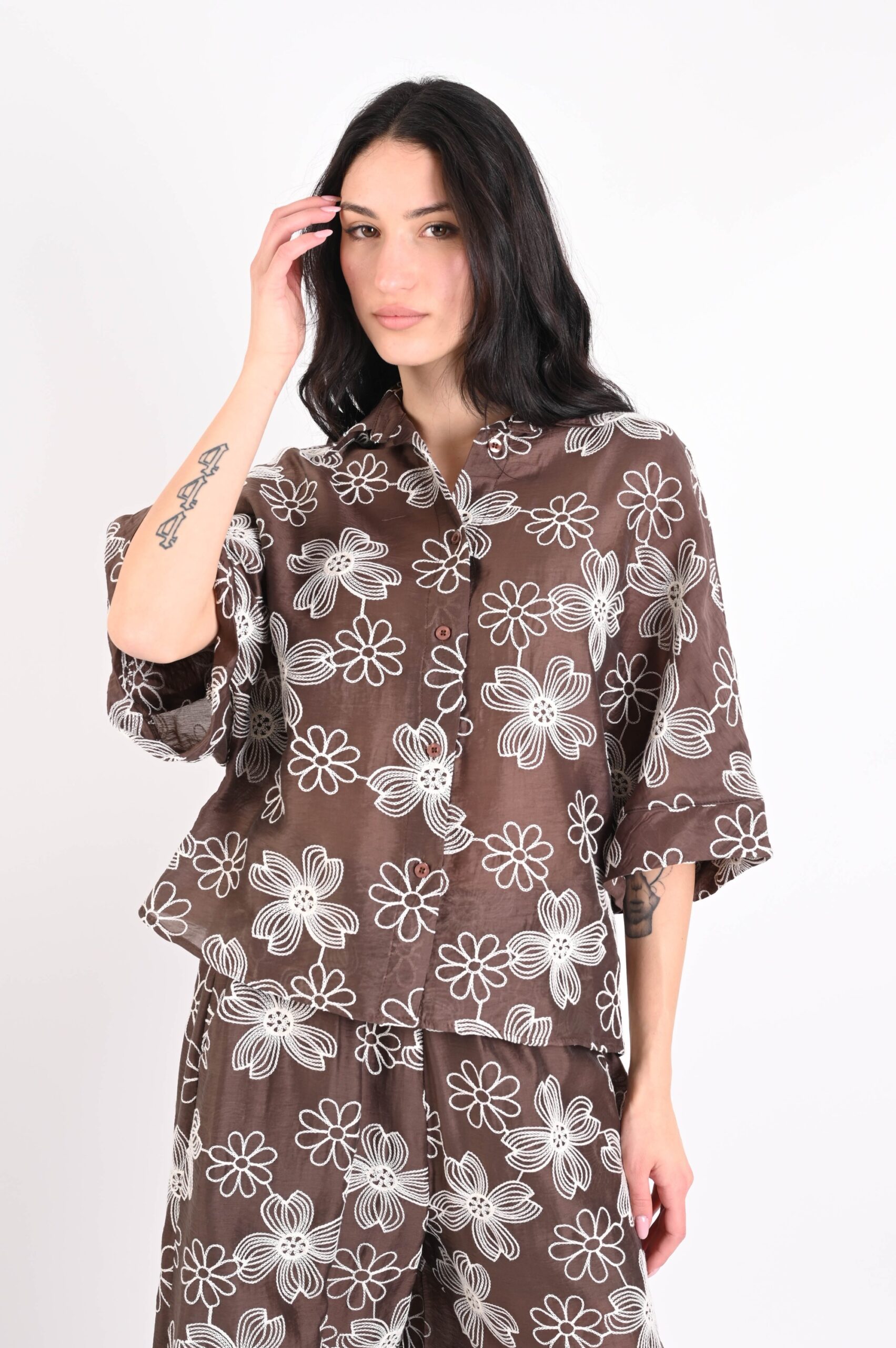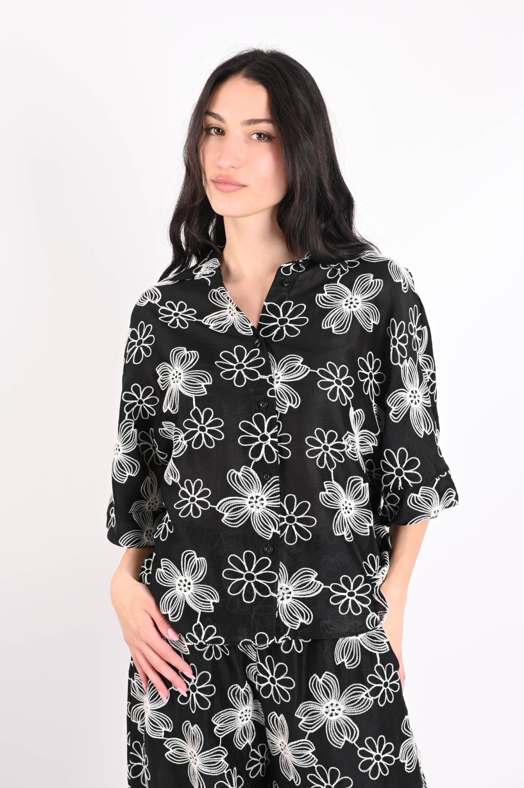 CAMICIA IN TENCEL CON RICAMI FLOREALI A MANICHE CORTE