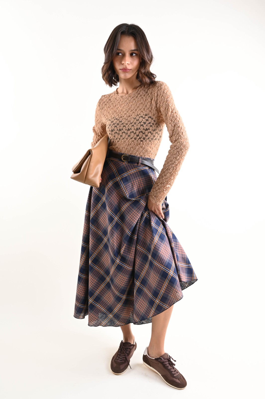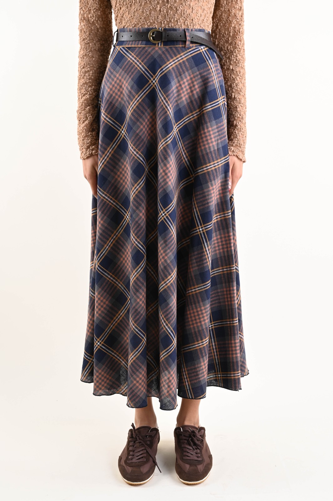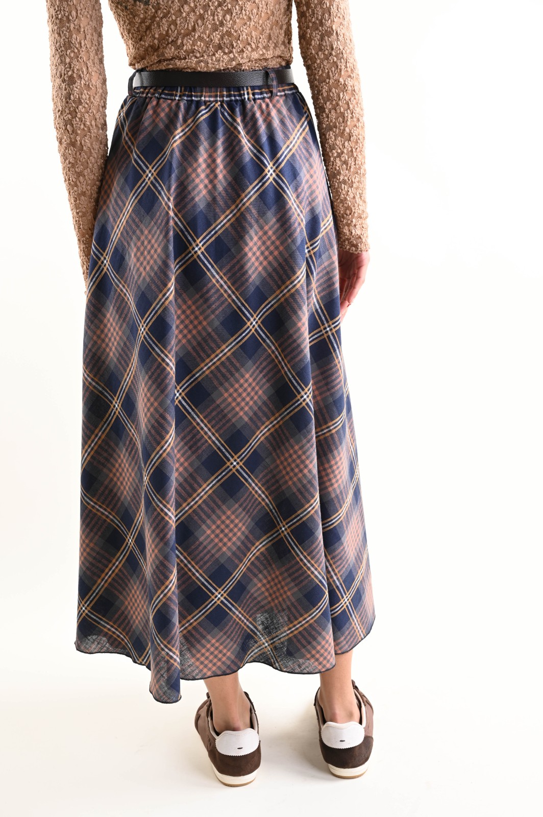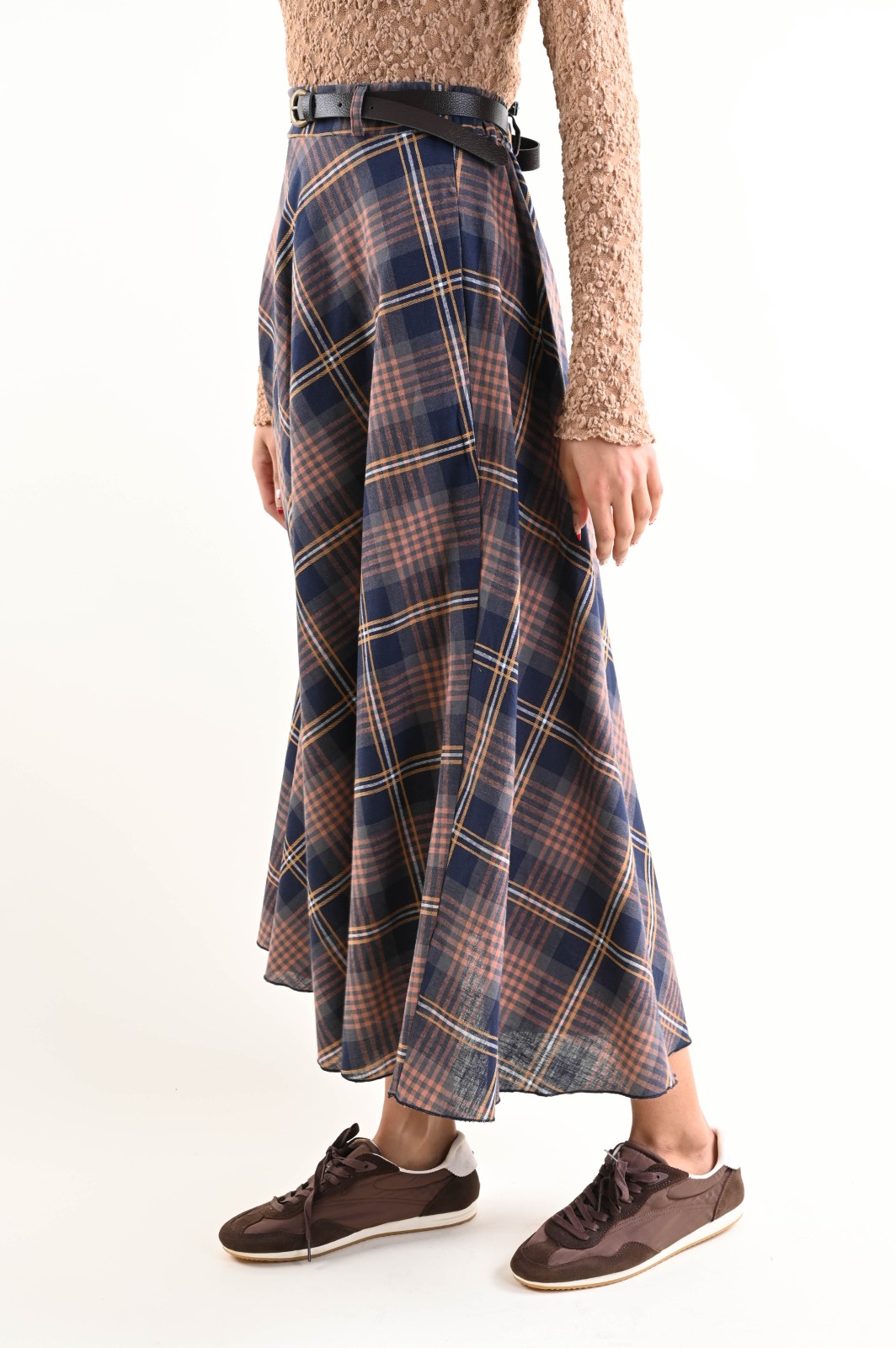 Gonna a quadri con vita regolare e cintura abbinata in similpelle, pensata per valorizzare la silhouette. Ideale per l’uso quotidiano, perfetta da abbinare a blazer, camicie e maglie.