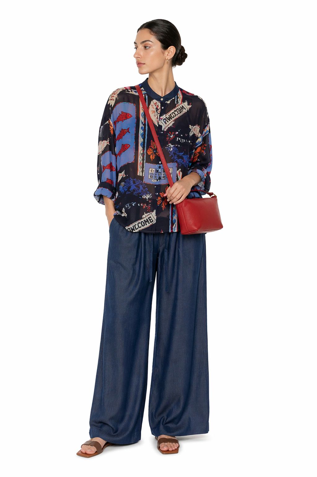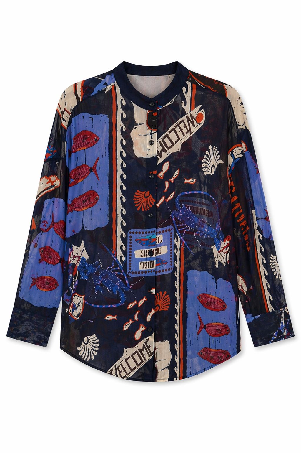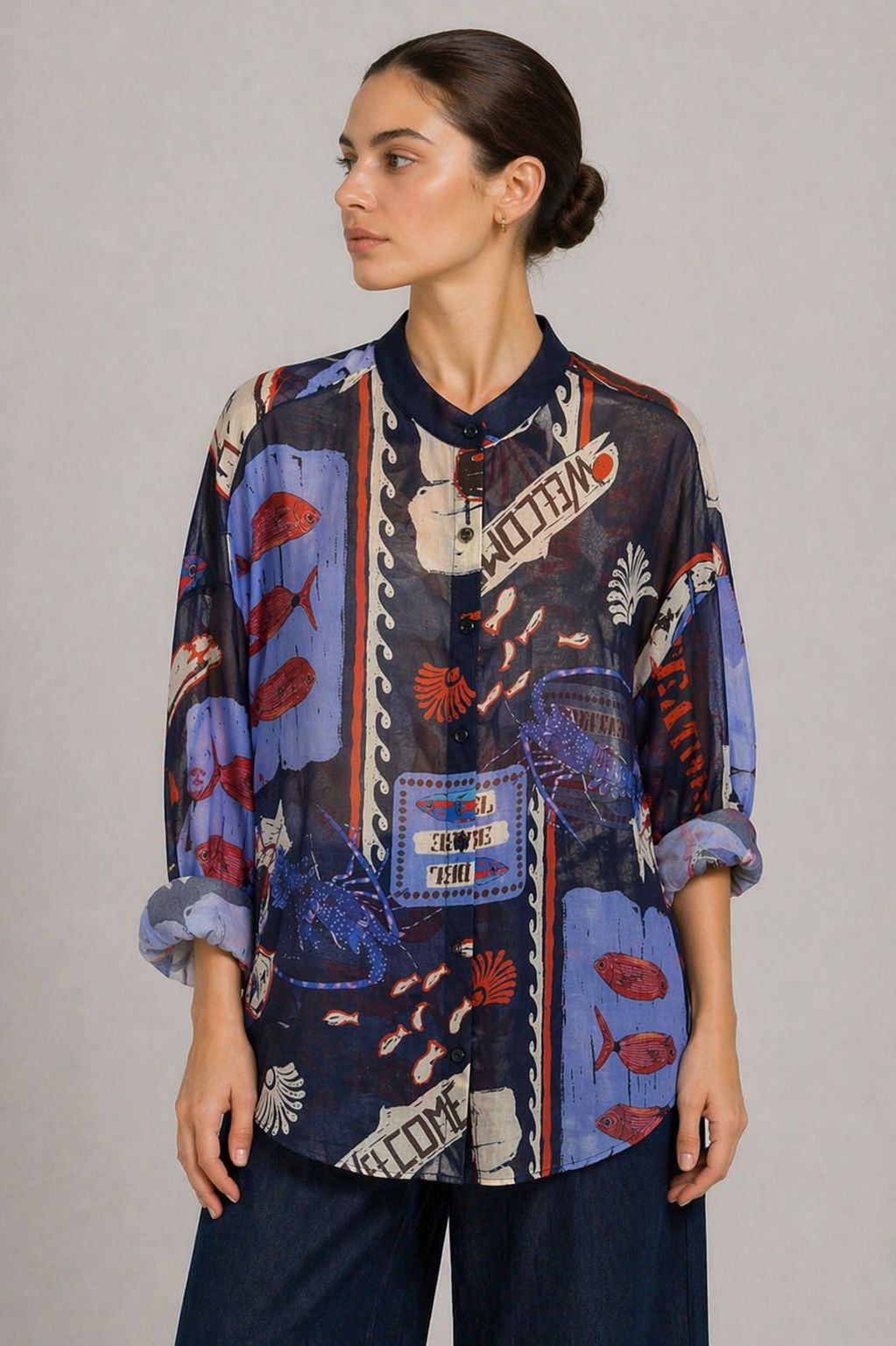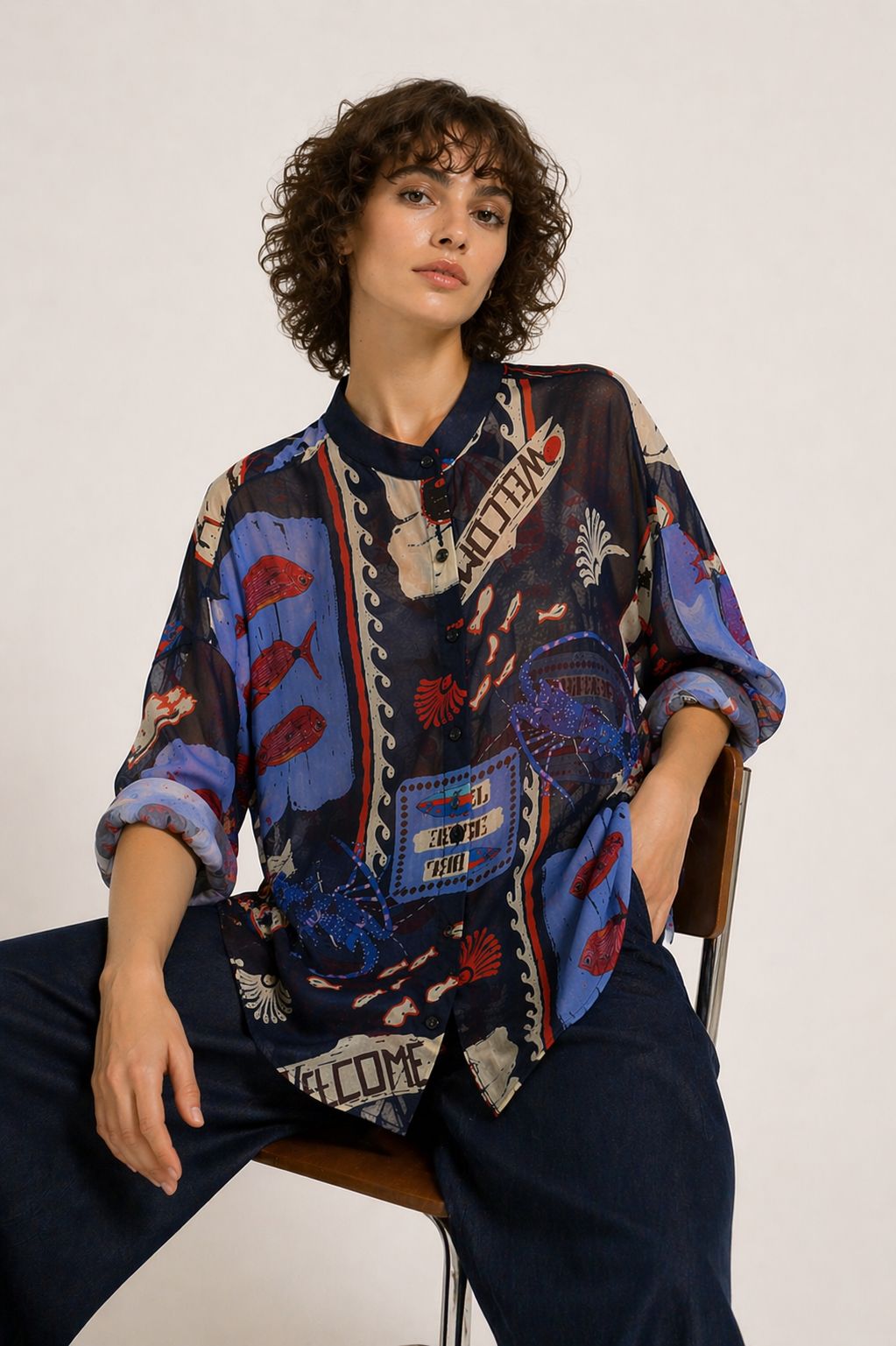 Scopri la camicia fantasia marina con colletto alla coreana, un capo versatile e di tendenza perfetto per la stagione estiva. Realizzata in 100% cotone, garantisce traspirabilità e comfort durante tutta la giornata.