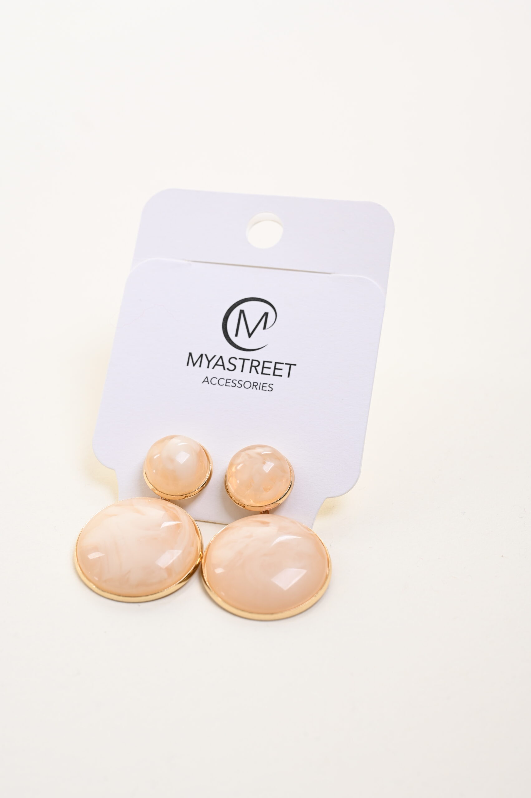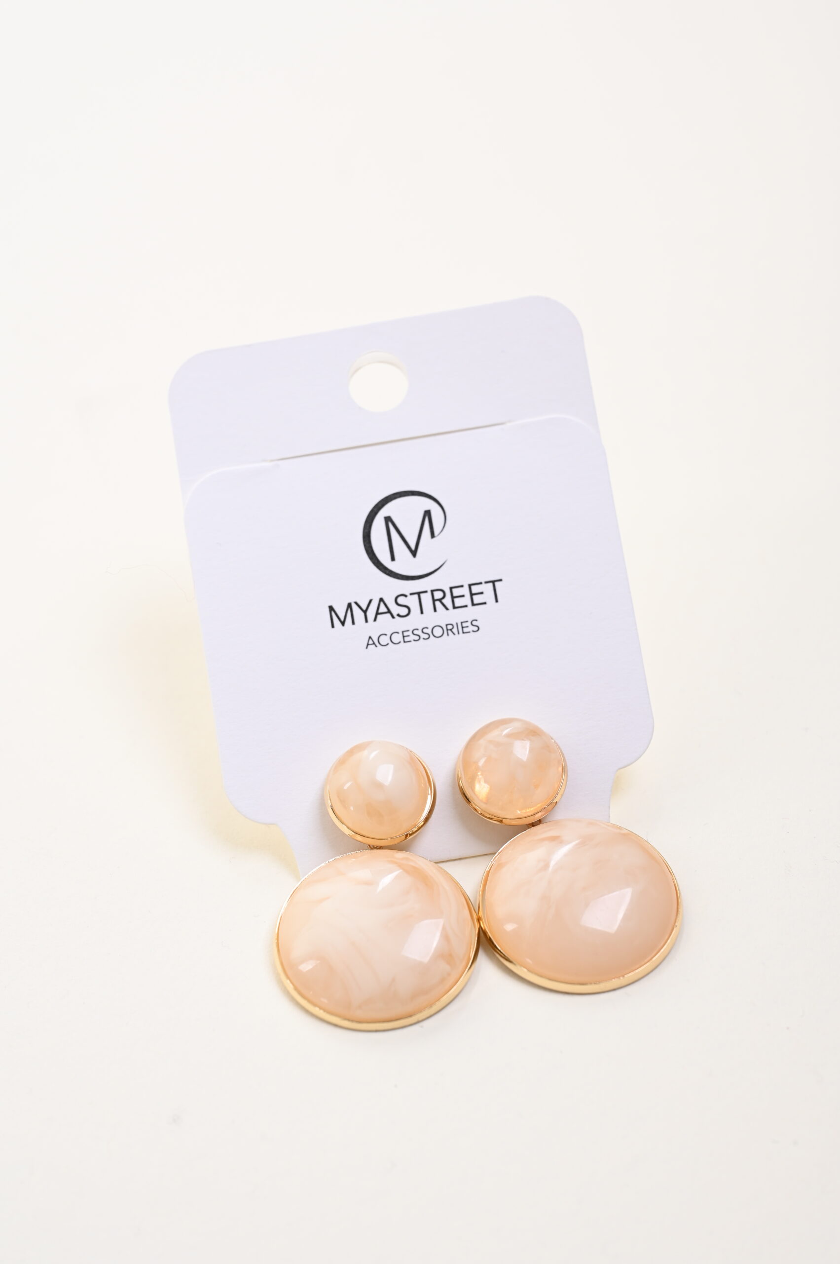 Orecchini composti da due elementi rotondi con finitura effetto madreperla incastonati in una cornice dorata. Un accessorio raffinato e versatile, perfetto per valorizzare qualsiasi look con un tocco di luce ed eleganza.