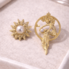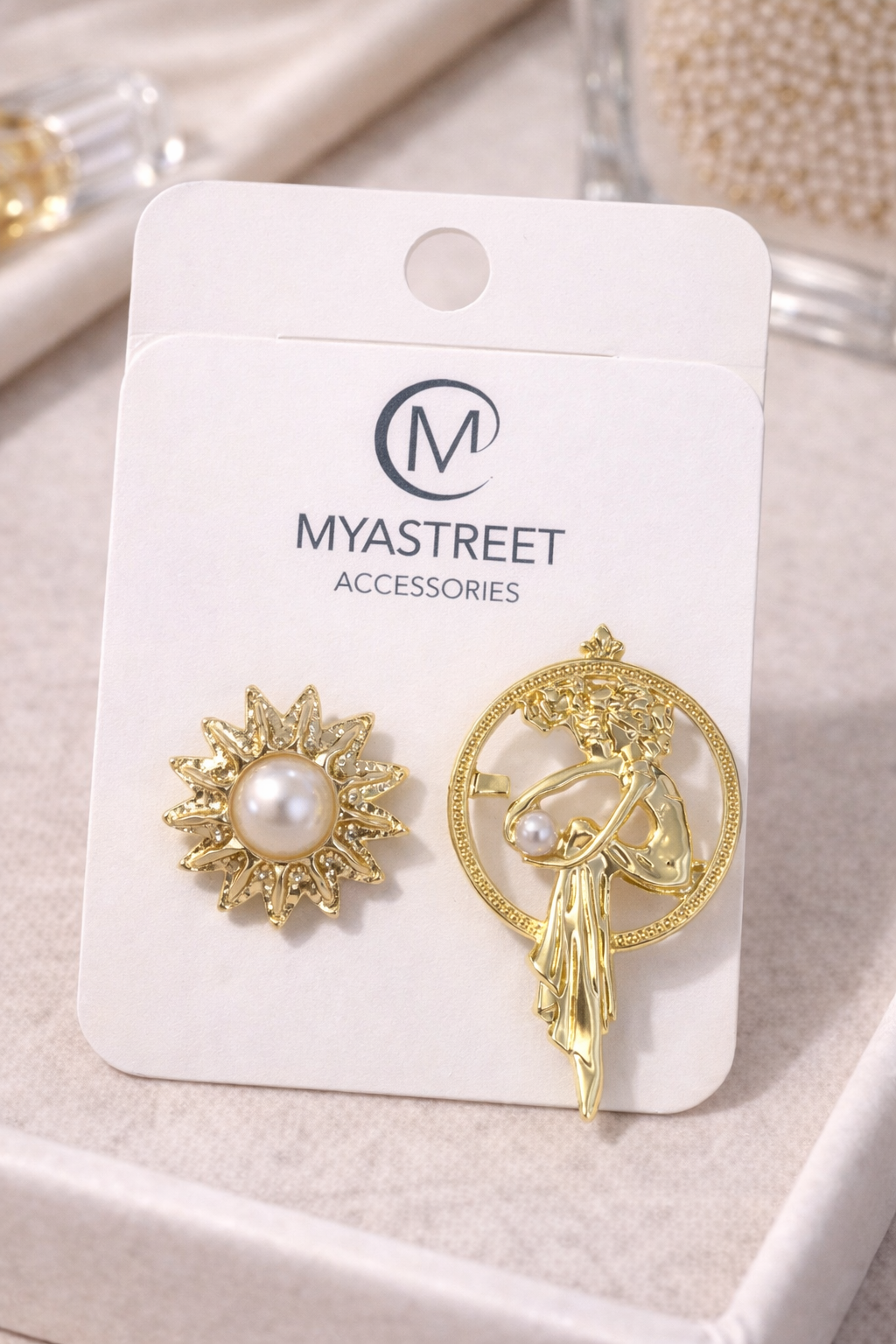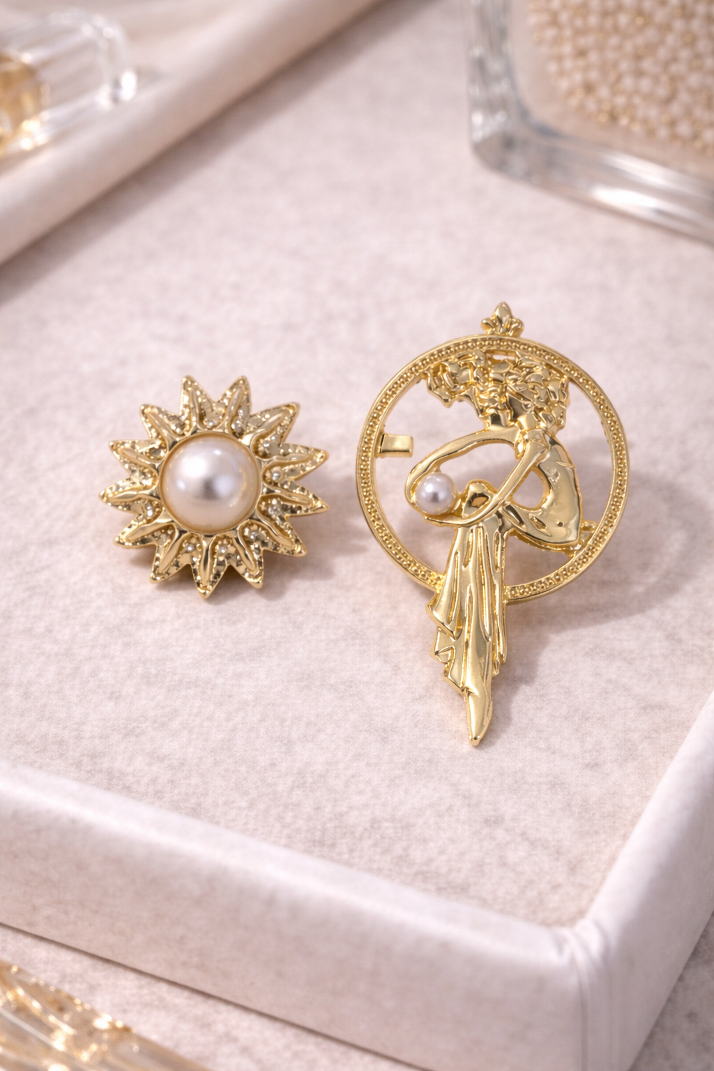 Set composto da due spille donna eleganti, caratterizzate da un design raffinato e femminile: una spilla a forma di sole con perla centrale e una spilla con figura cameo racchiusa in una cornice circolare decorativa con dettaglio perla.