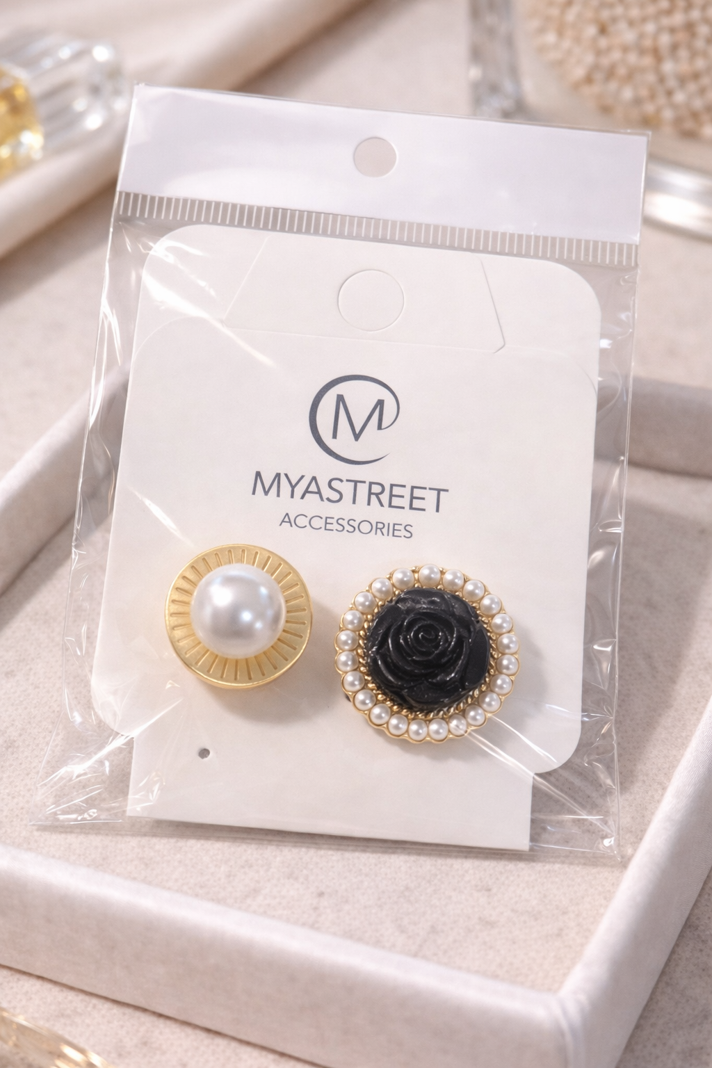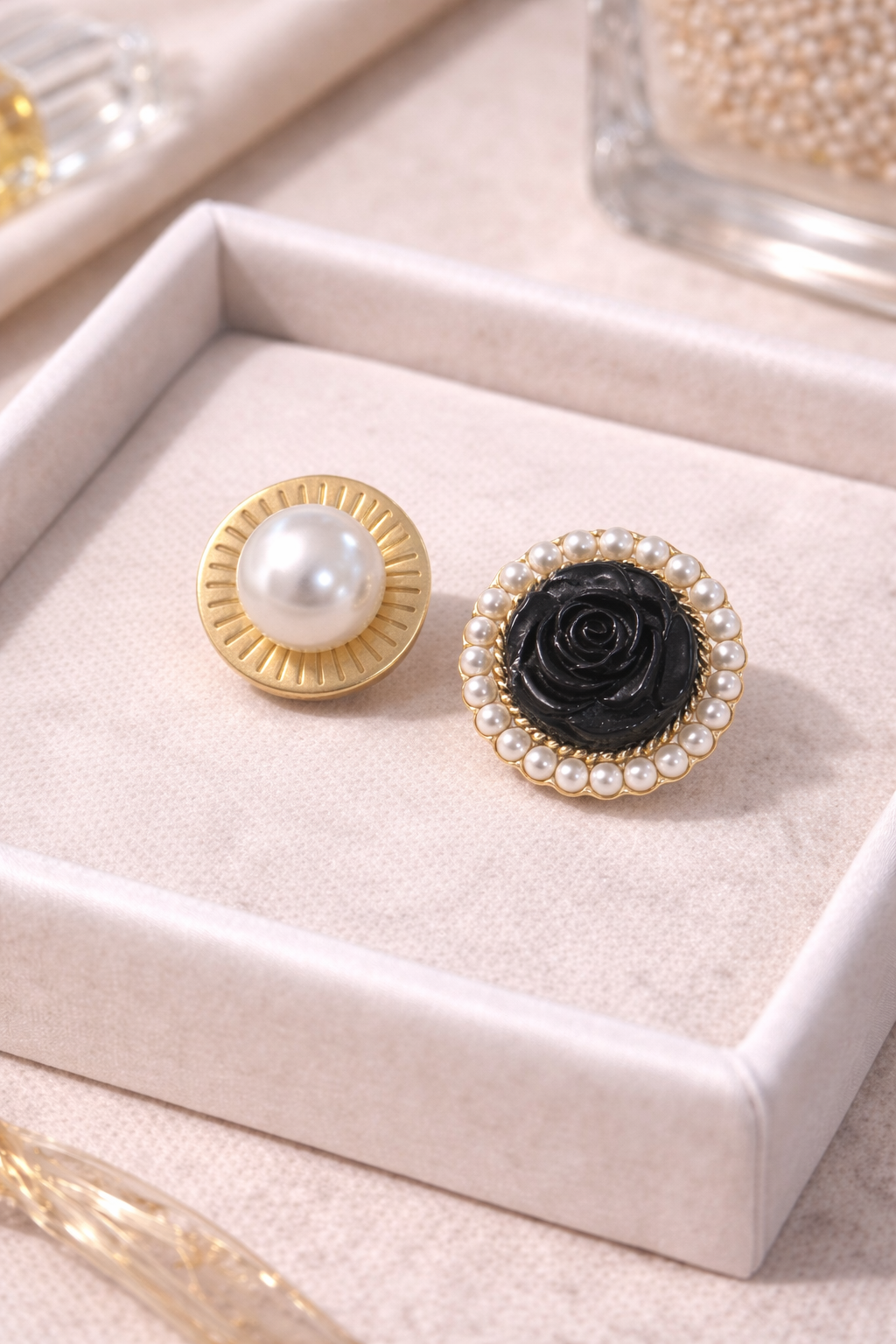 Gemelli da donna dal design raffinato, caratterizzati da una luminosa perla decorativa abbinata a una rosa nera dal fascino sofisticato. Un accessorio distintivo pensato per impreziosire camicie con polsino doppio e look sartoriali.