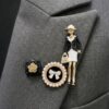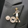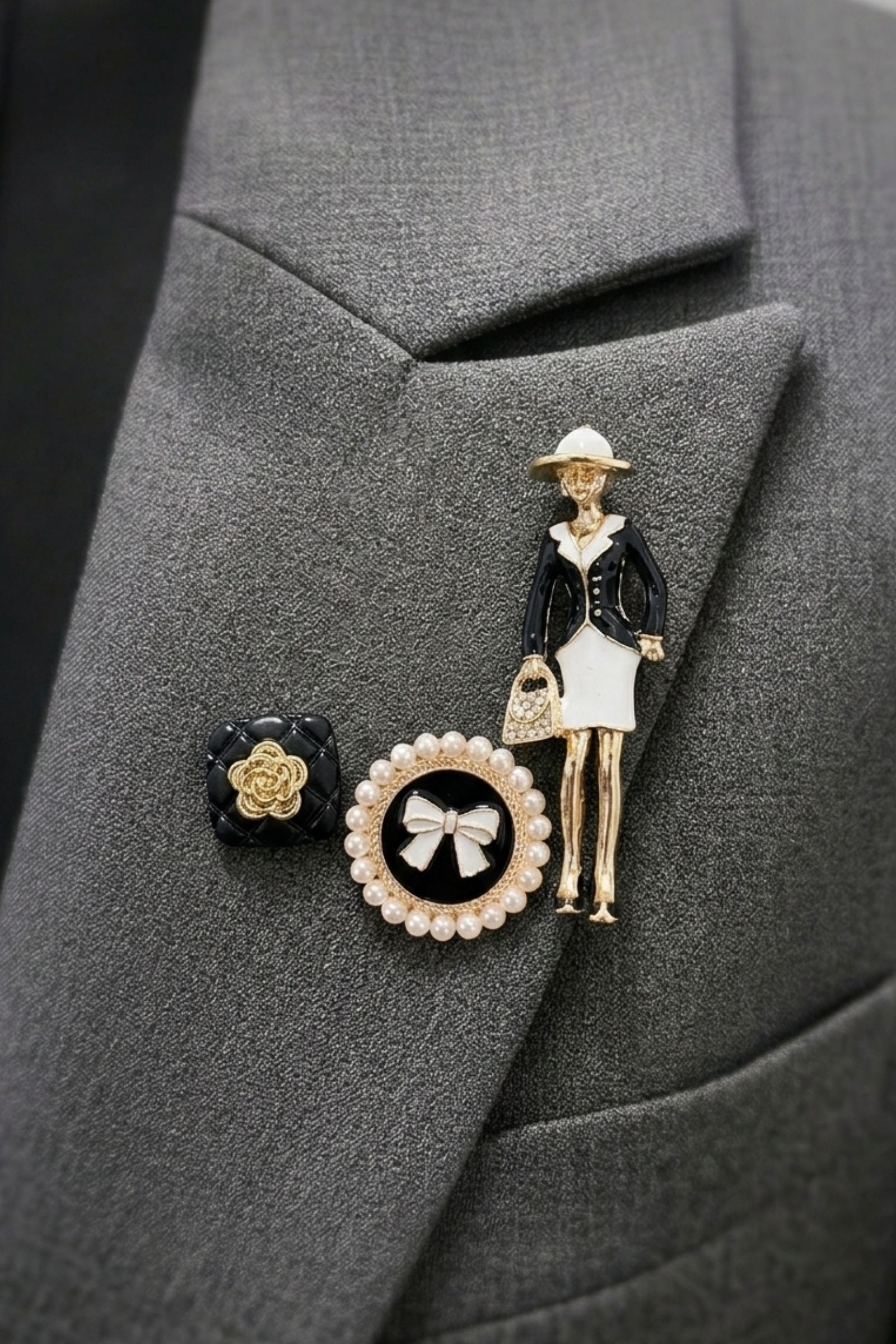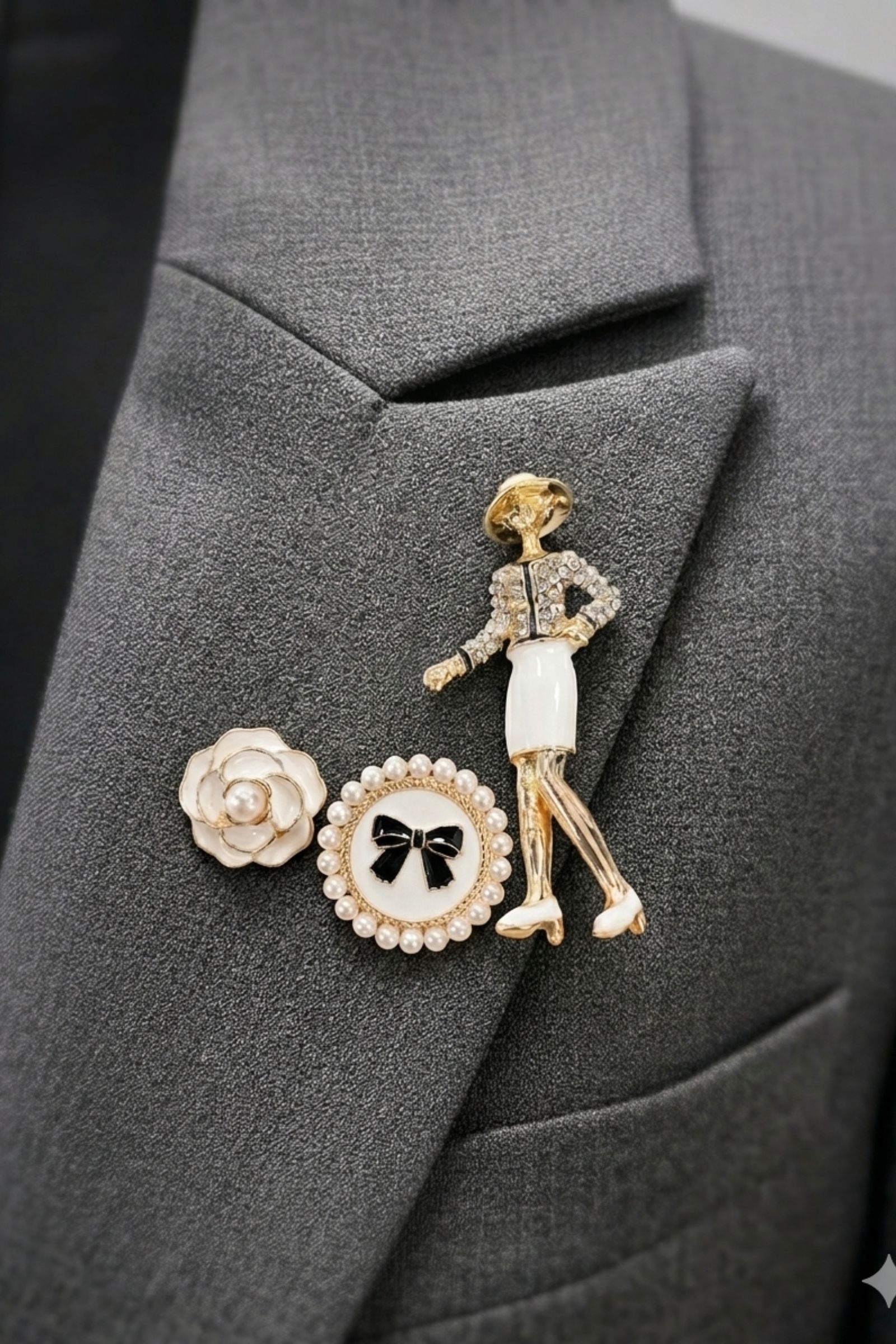 Il set include una spilla a forma di fiore con dettagli metallici, una spilla circolare con perle decorative e fiocco centrale, e una spilla figurativa raffigurante una donna stilizzata con dettagli raffinati. L’insieme crea un mix armonioso tra elementi classici e stile contemporaneo.