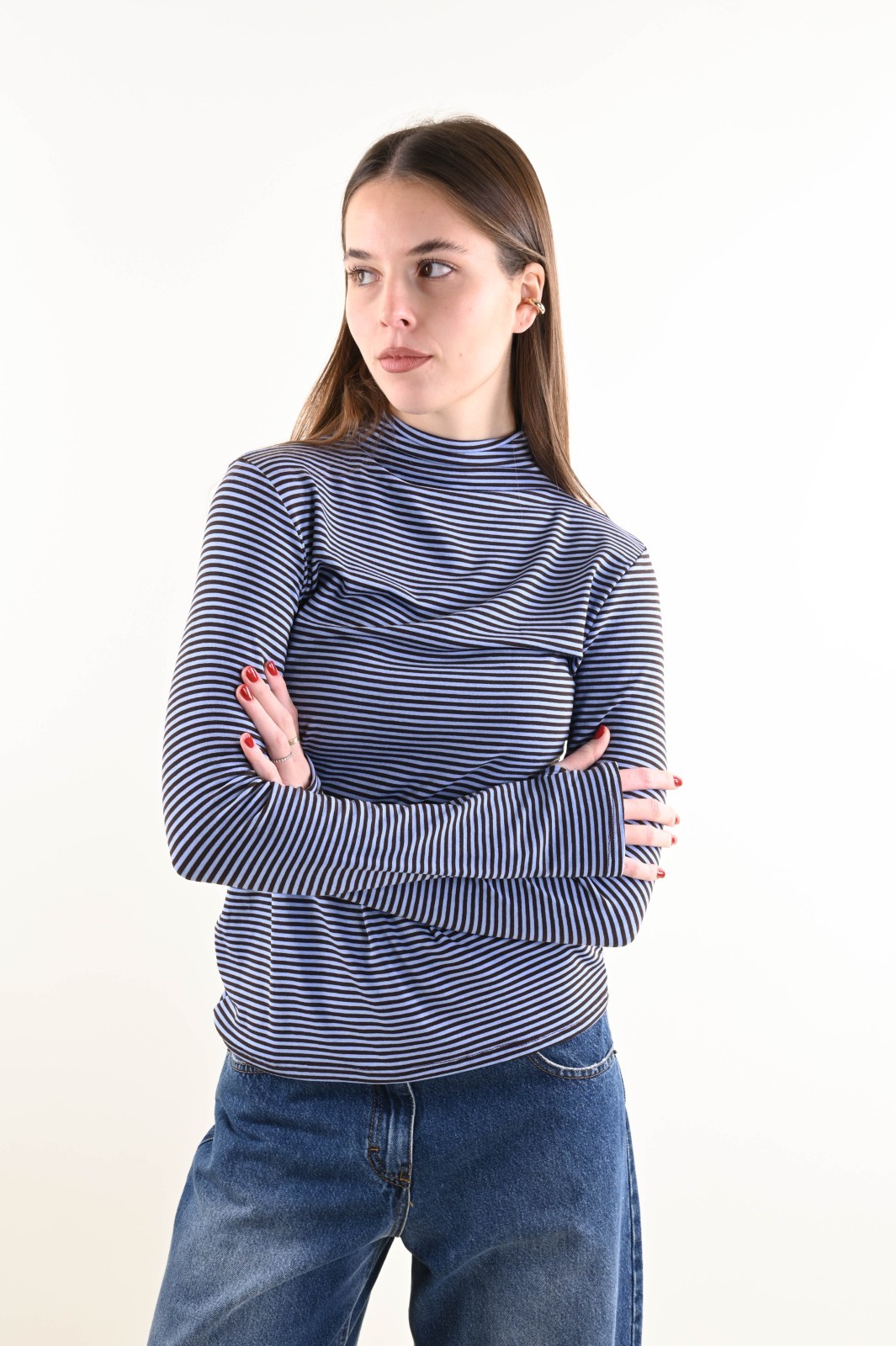 Maglia a righe felpata con collo alto morbido e silhouette confortevole. Un capo versatile, ideale per creare layer leggeri o per completare look casual e contemporanei. La linea essenziale e il tessuto piacevole lo rendono un’ottima proposta per arricchire l’assortimento della tua boutique durante la stagione.