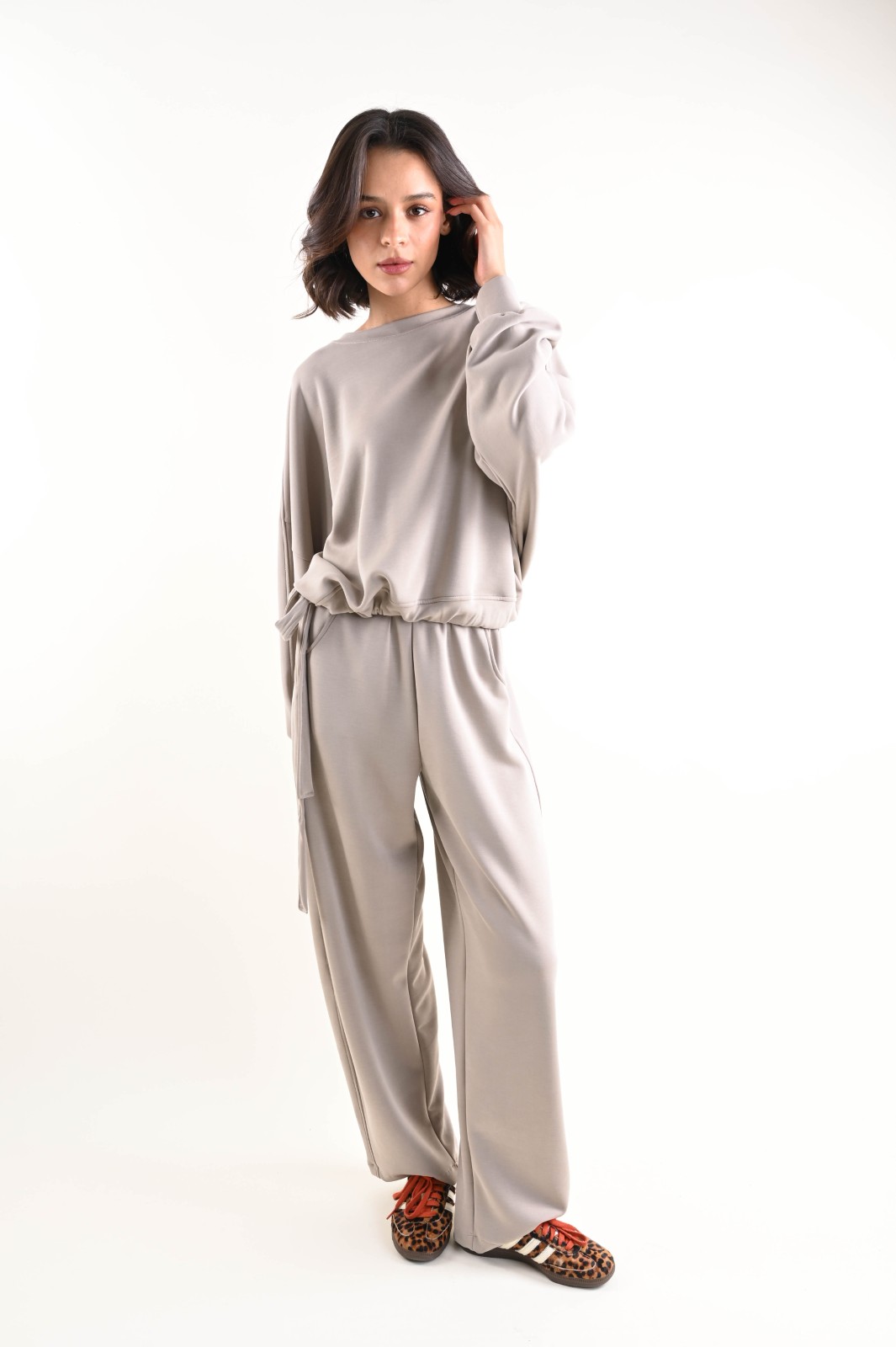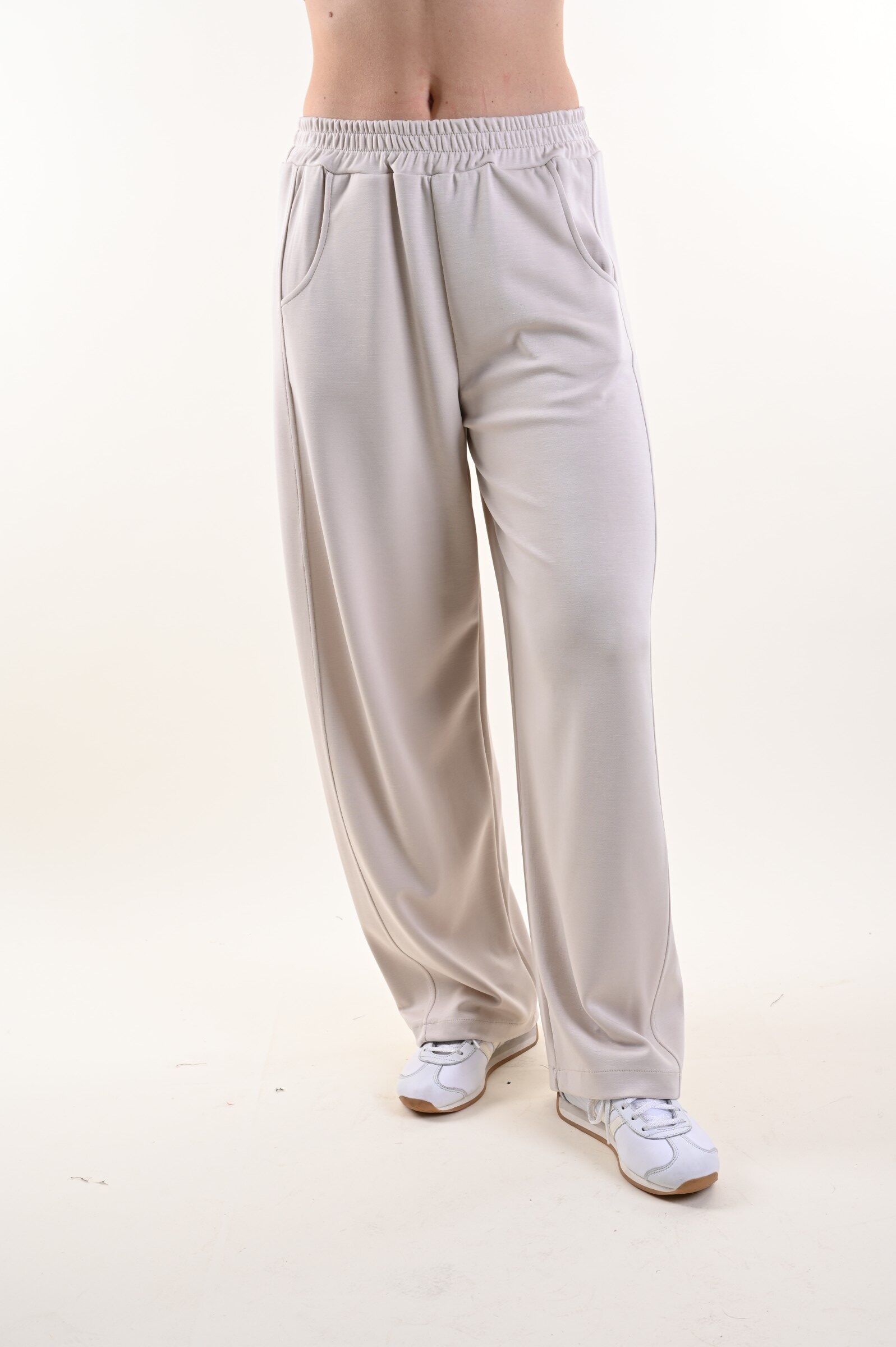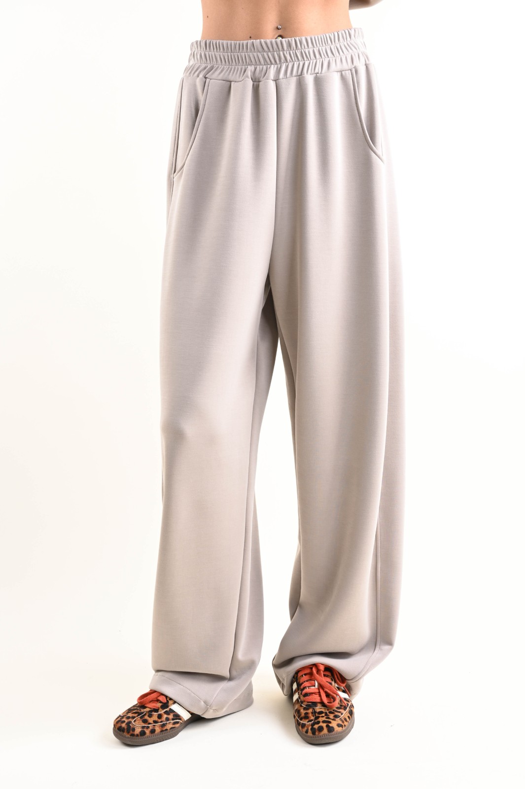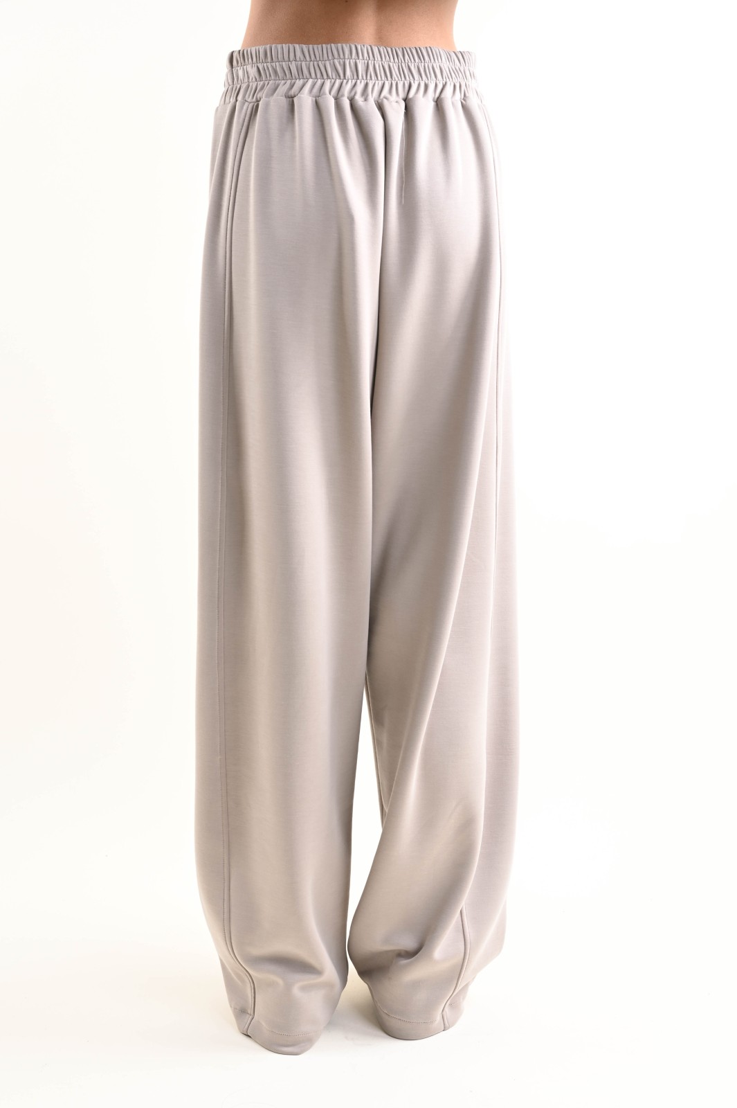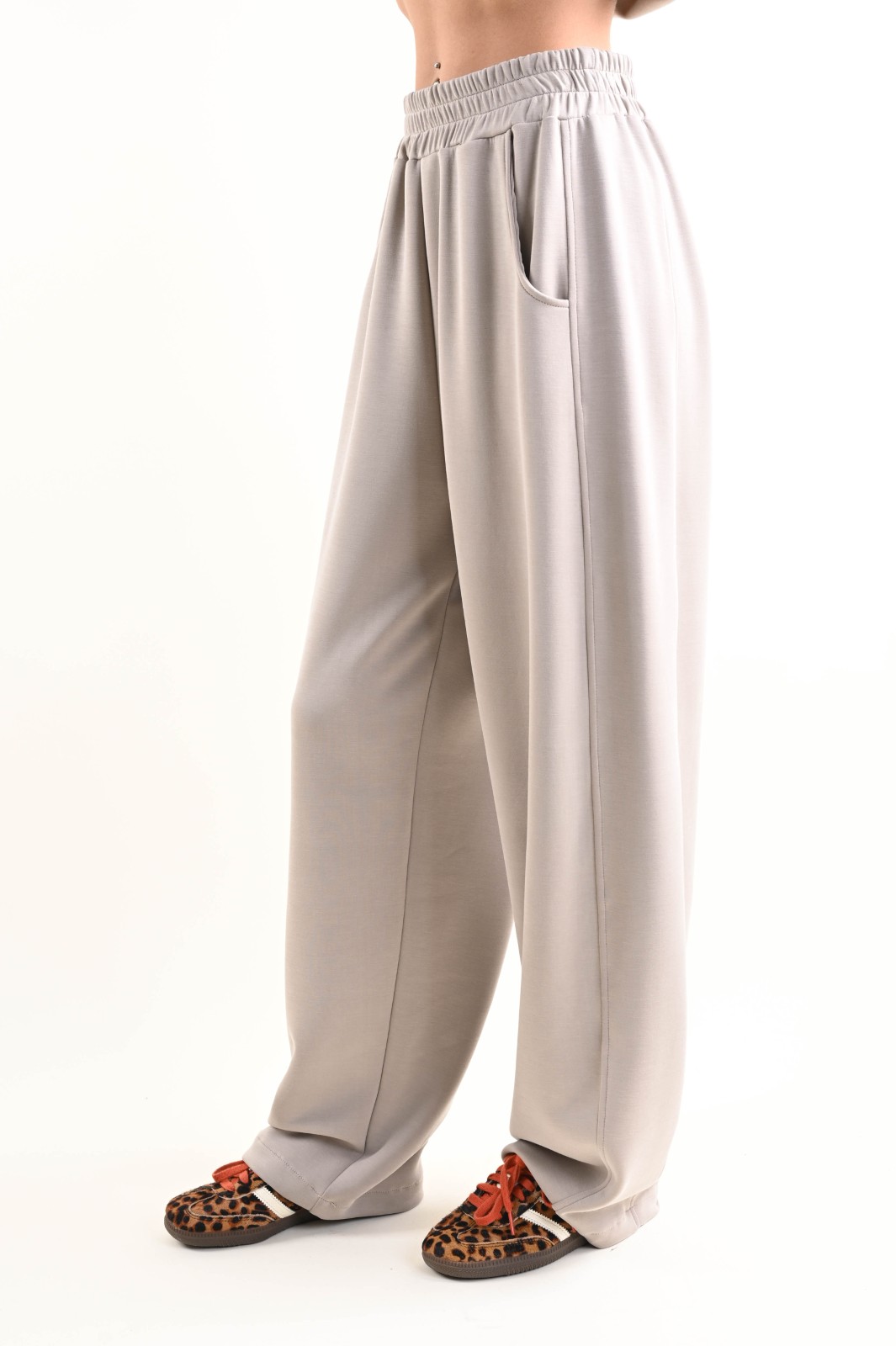 Pantaloni sportivi morbidi a palazzo con elastico in vita, progettati per garantire comfort e stile contemporaneo in un unico capo. Il volume fluido e la vestibilità rilassata valorizzano la silhouette offrendo libertà di movimento, rendendoli ideali per look casual, athleisure e per il tempo libero. Il design essenziale e versatile consente abbinamenti facili con felpe, t-shirt o maglieria, adattandosi a diverse stagioni.