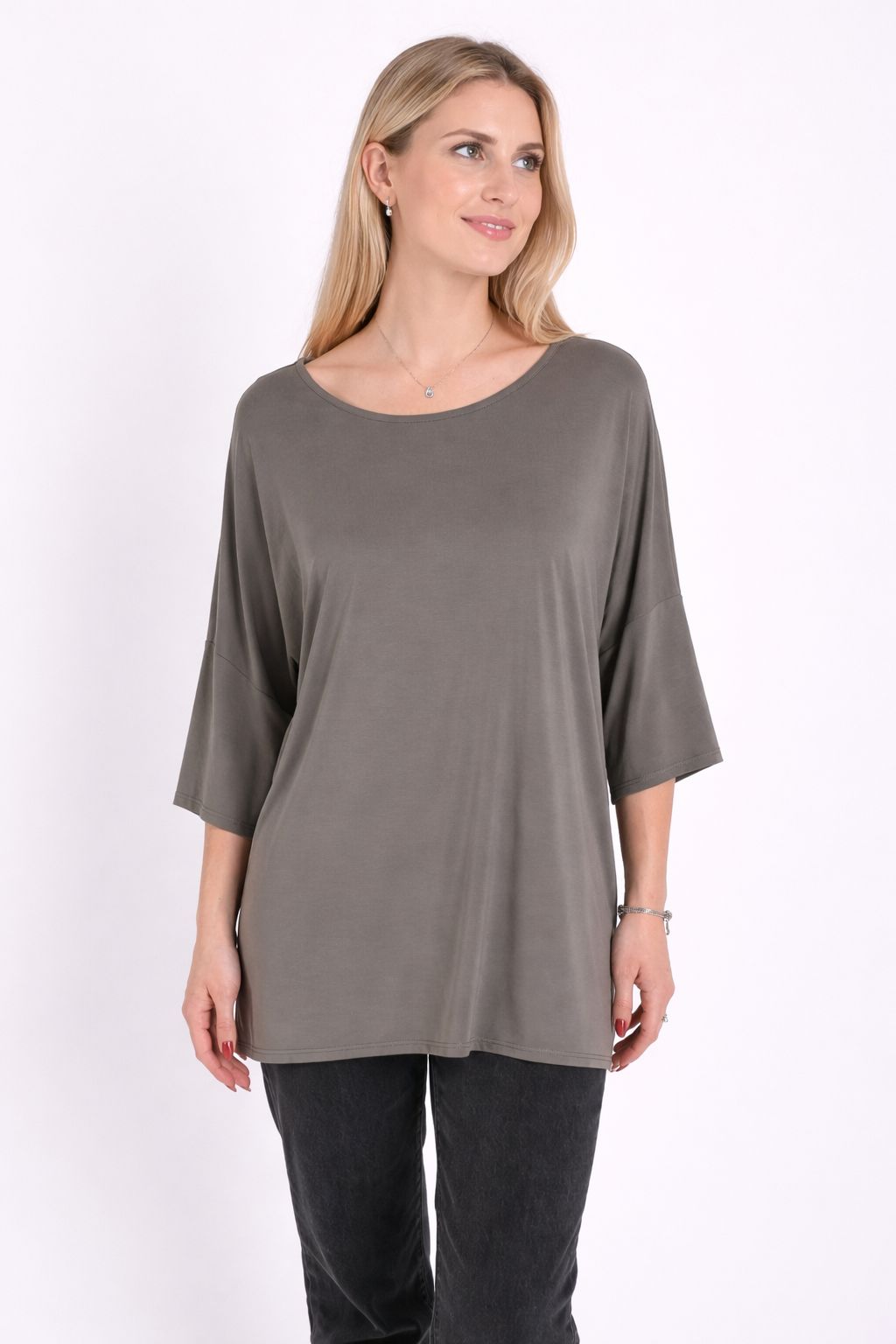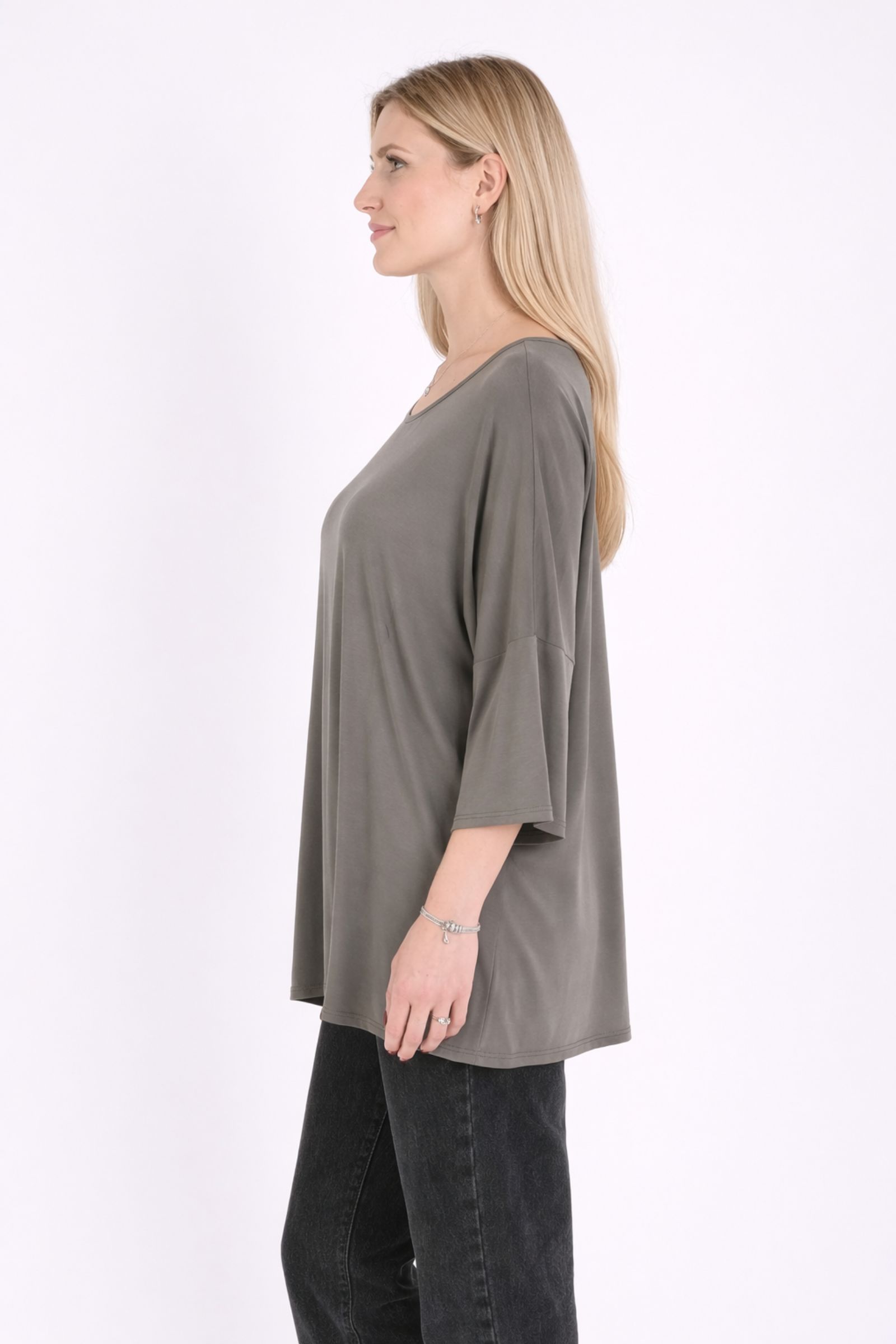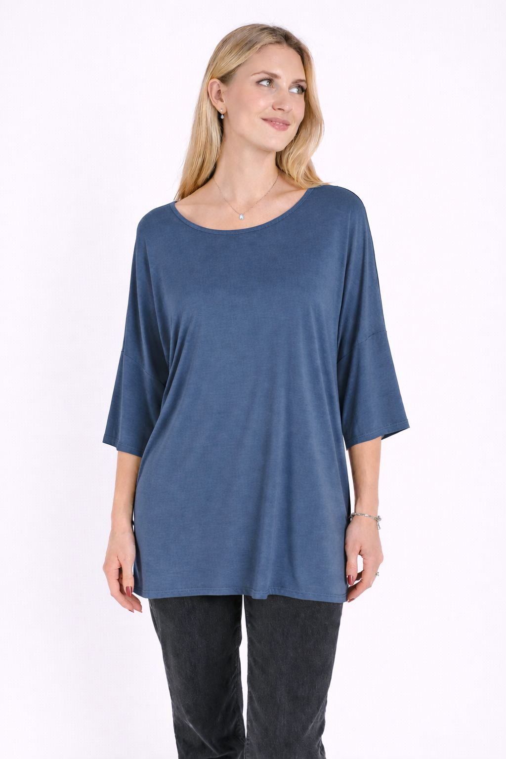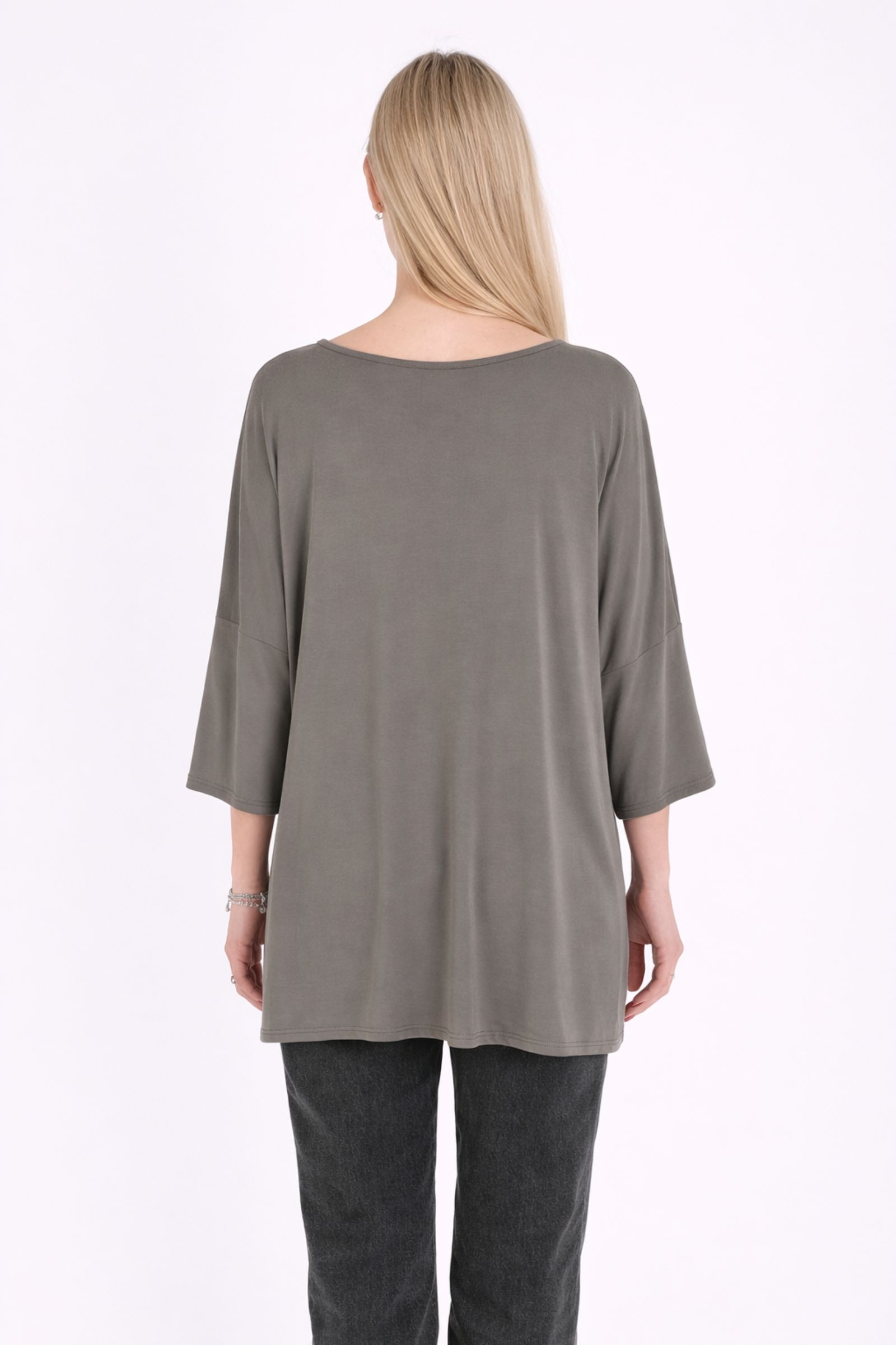 Il girocollo delicato e le maniche ampie a lunghezza tre quarti donano al capo un carattere moderno e raffinato, perfetto per creare look quotidiani eleganti e rilassati. Il tessuto in modal offre una piacevole sensazione sulla pelle e una caduta fluida che valorizza la linea del capo.