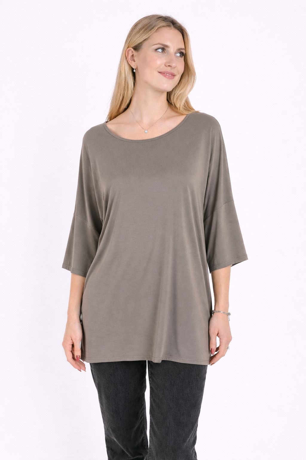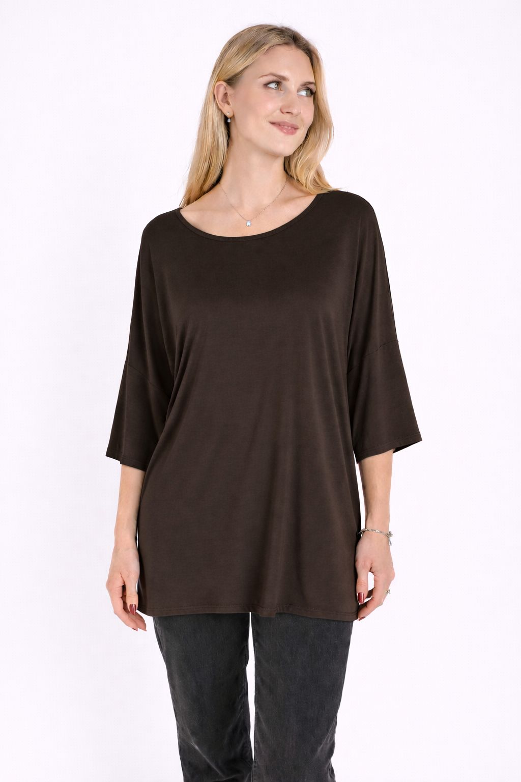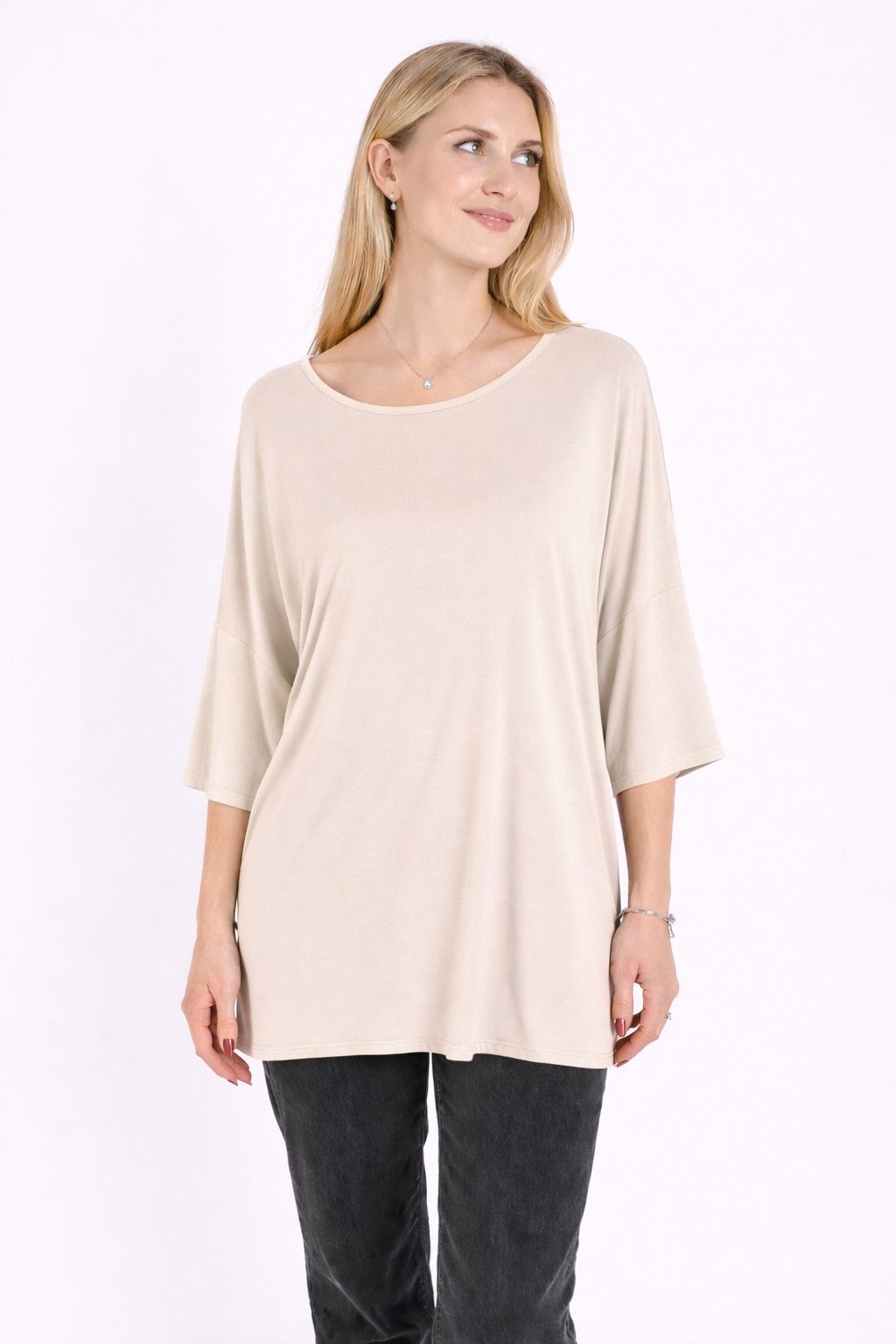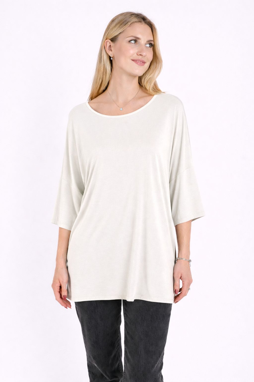 Il girocollo delicato e le maniche ampie a lunghezza tre quarti donano al capo un carattere moderno e raffinato, perfetto per creare look quotidiani eleganti e rilassati. Il tessuto in modal offre una piacevole sensazione sulla pelle e una caduta fluida che valorizza la linea del capo.