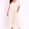 Abito tunica dal design essenziale e contemporaneo, pensato per una donna sofisticata e dinamica. Lo scollo a V valorizza il décolleté con eleganza, mentre le maniche corte donano leggerezza e comfort, rendendolo ideale per la stagione più calda.