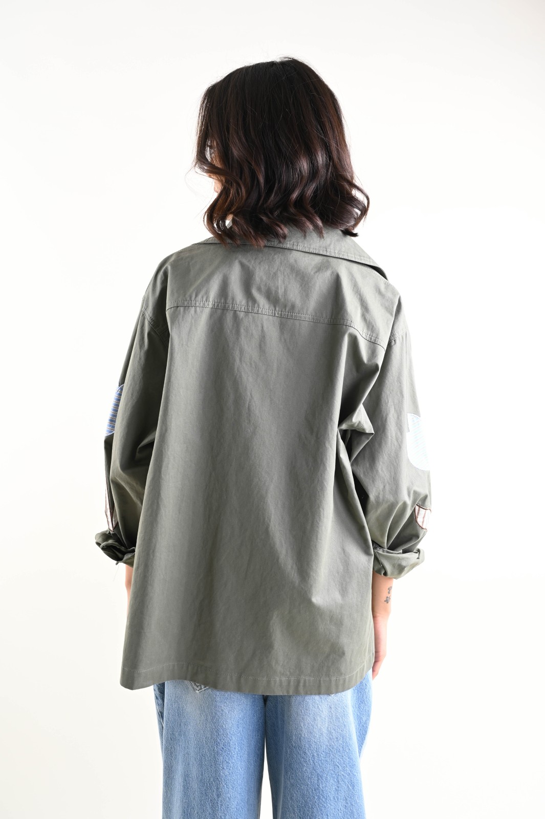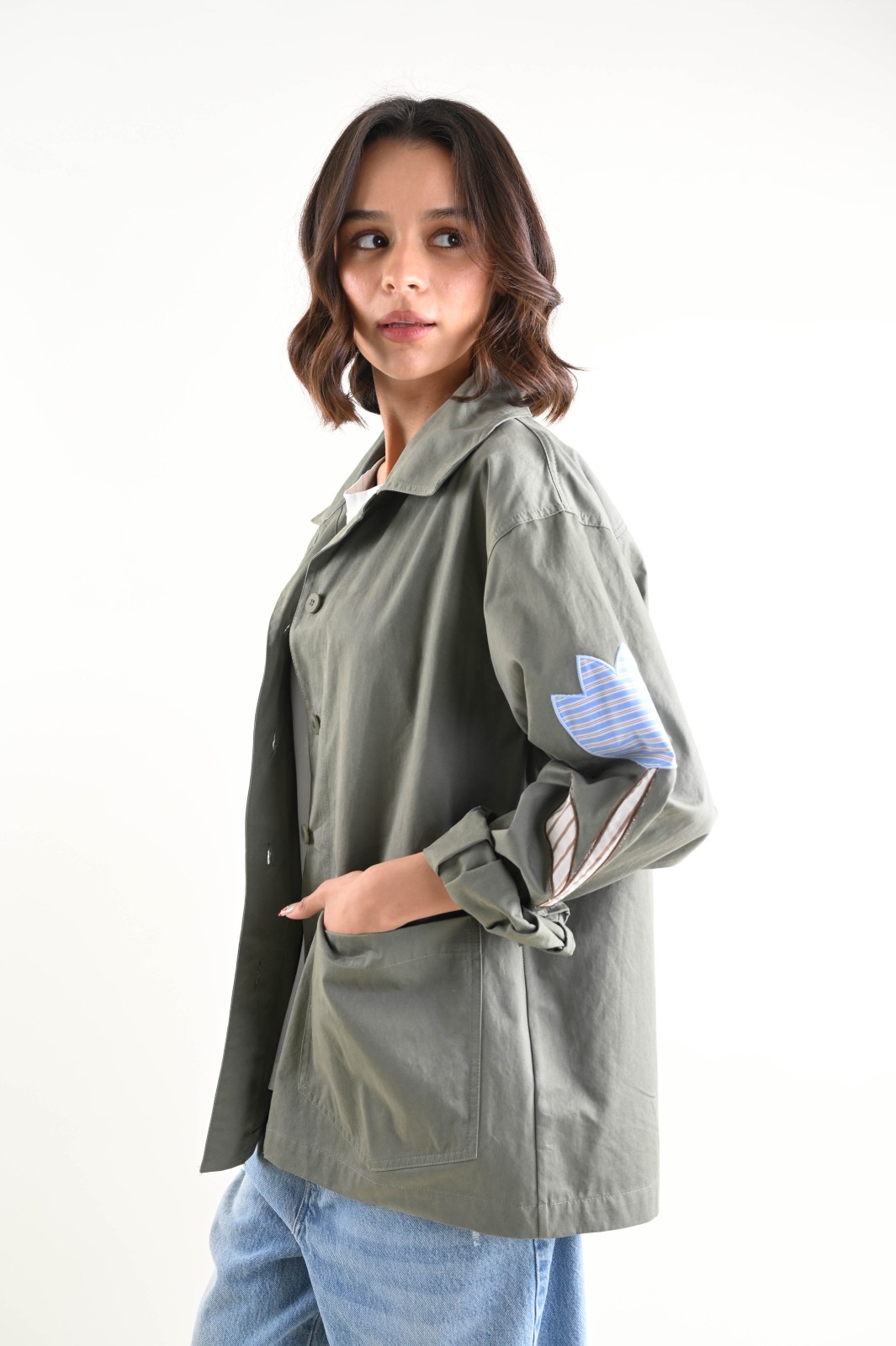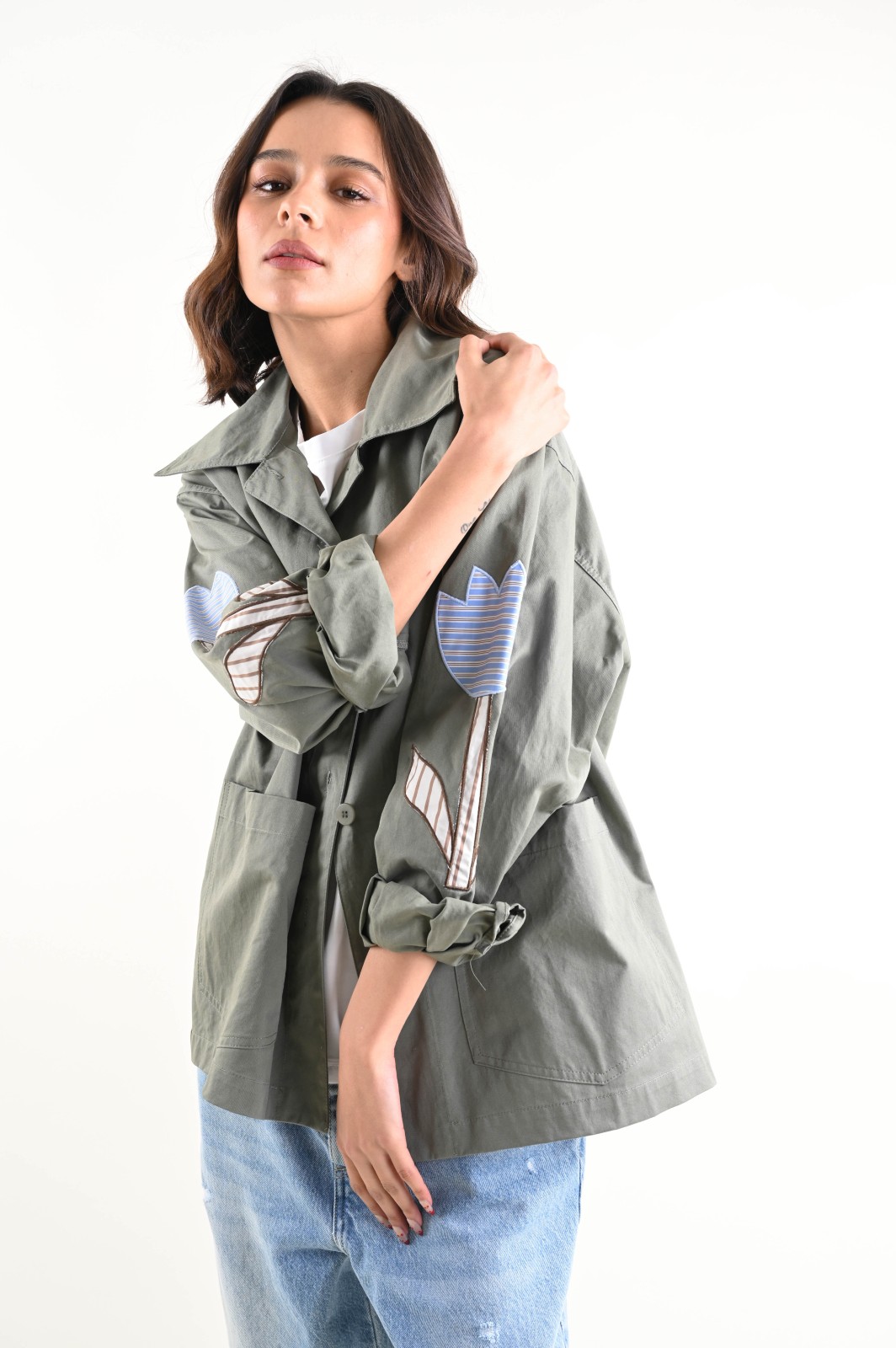Camicia donna dallo stile utility contemporaneo, pensata per un look deciso ma femminile. Il modello presenta colletto classico, abbottonatura frontale e tasche applicate, elementi che uniscono funzionalità ed estetica. Le patch decorative applicate sulle maniche aggiungono un dettaglio distintivo e ricercato, rendendo ogni capo originale e riconoscibile.
