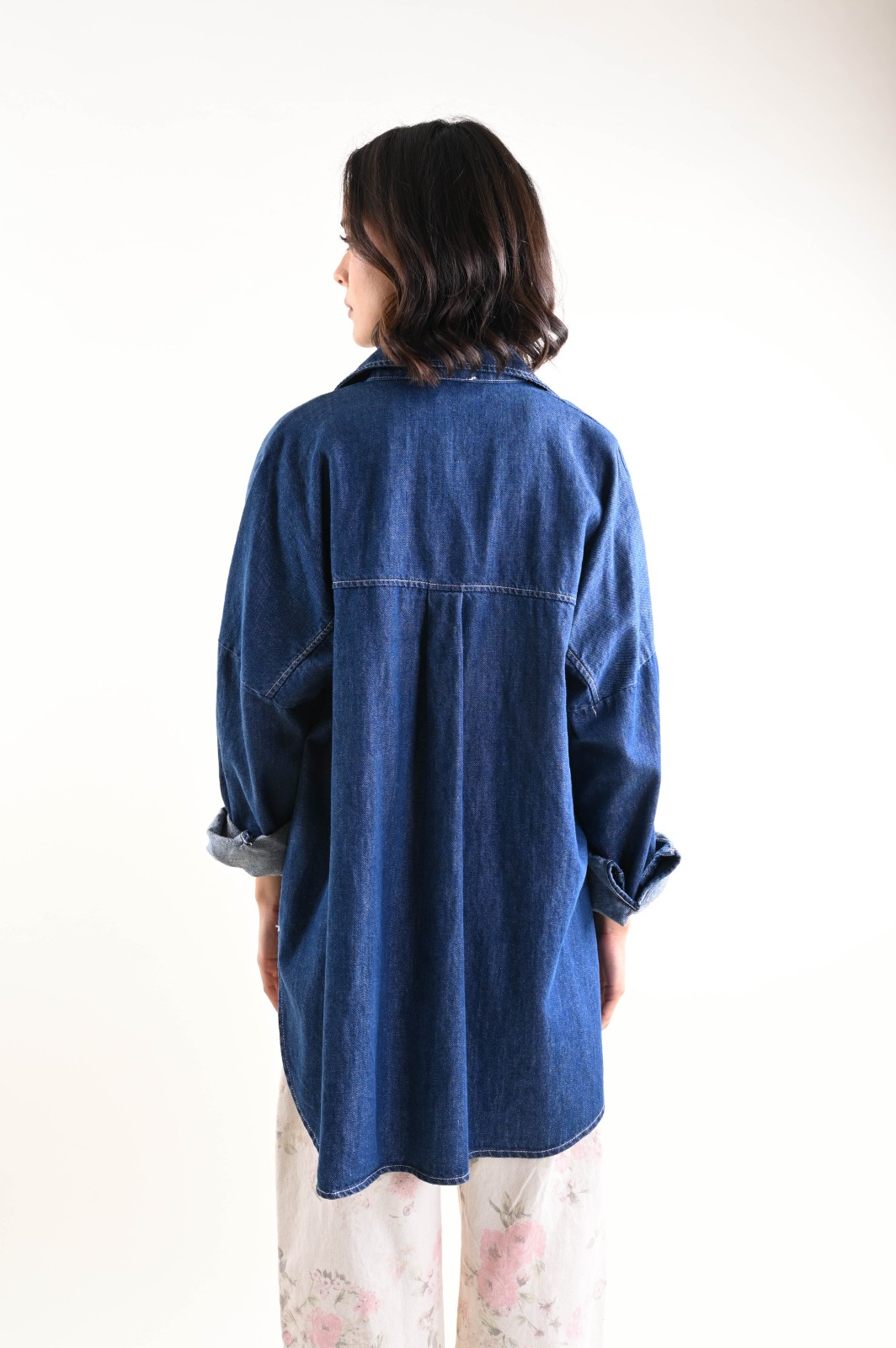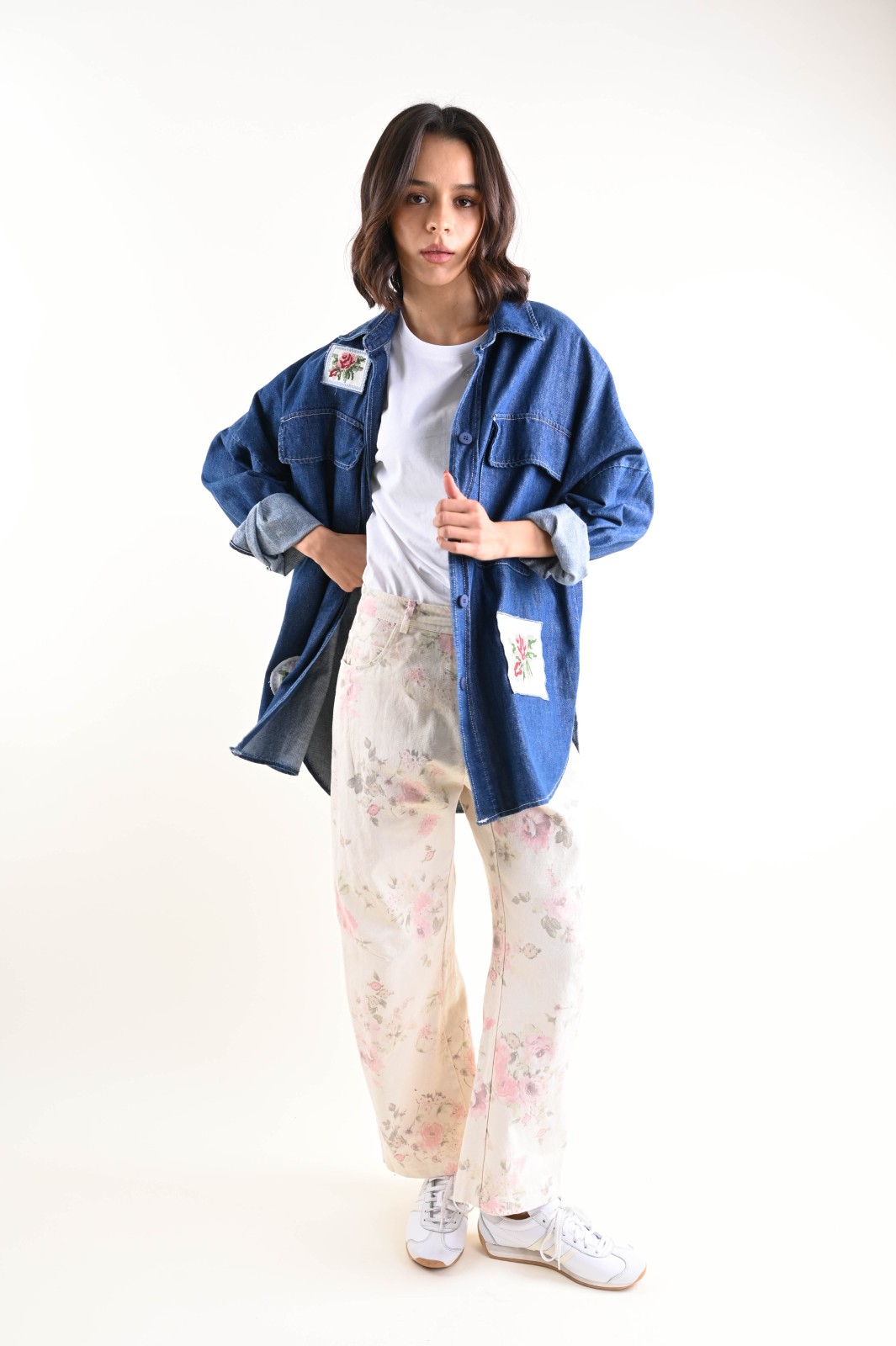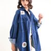 Camicia giacca donna in denim, pensata per un look casual ma ricercato. Il modello presenta una linea morbida e confortevole, con collo classico e chiusura frontale con bottoni. Le tasche applicate sul petto aggiungono funzionalità, mentre i patch decorativi ricamati donano personalità e un tocco distintivo al capo. Le maniche lunghe con risvolto completano il design, rendendo la camicia giacca ideale da indossare sia aperta che chiusa. Un capo versatile, perfetto per completare outfit quotidiani e proposte più creative, ideale per il negozio che cerca un articolo di carattere facile da abbinare.