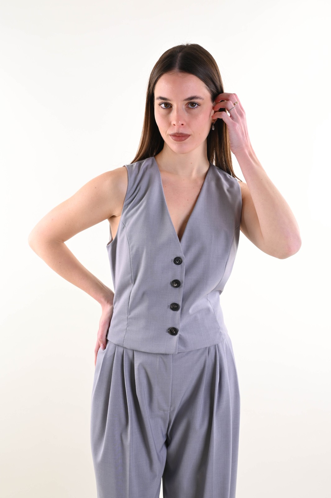 Gilet da donna dal taglio sartoriale e dal design essenziale, caratterizzato da uno scollo a V profondo e da una chiusura frontale con bottoni che valorizza la silhouette in modo naturale. La linea pulita e la vestibilità strutturata lo rendono un capo estremamente versatile, ideale da indossare sia come pezzo protagonista sia in coordinato con blazer e pantaloni per look completi e contemporanei.