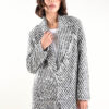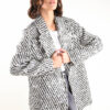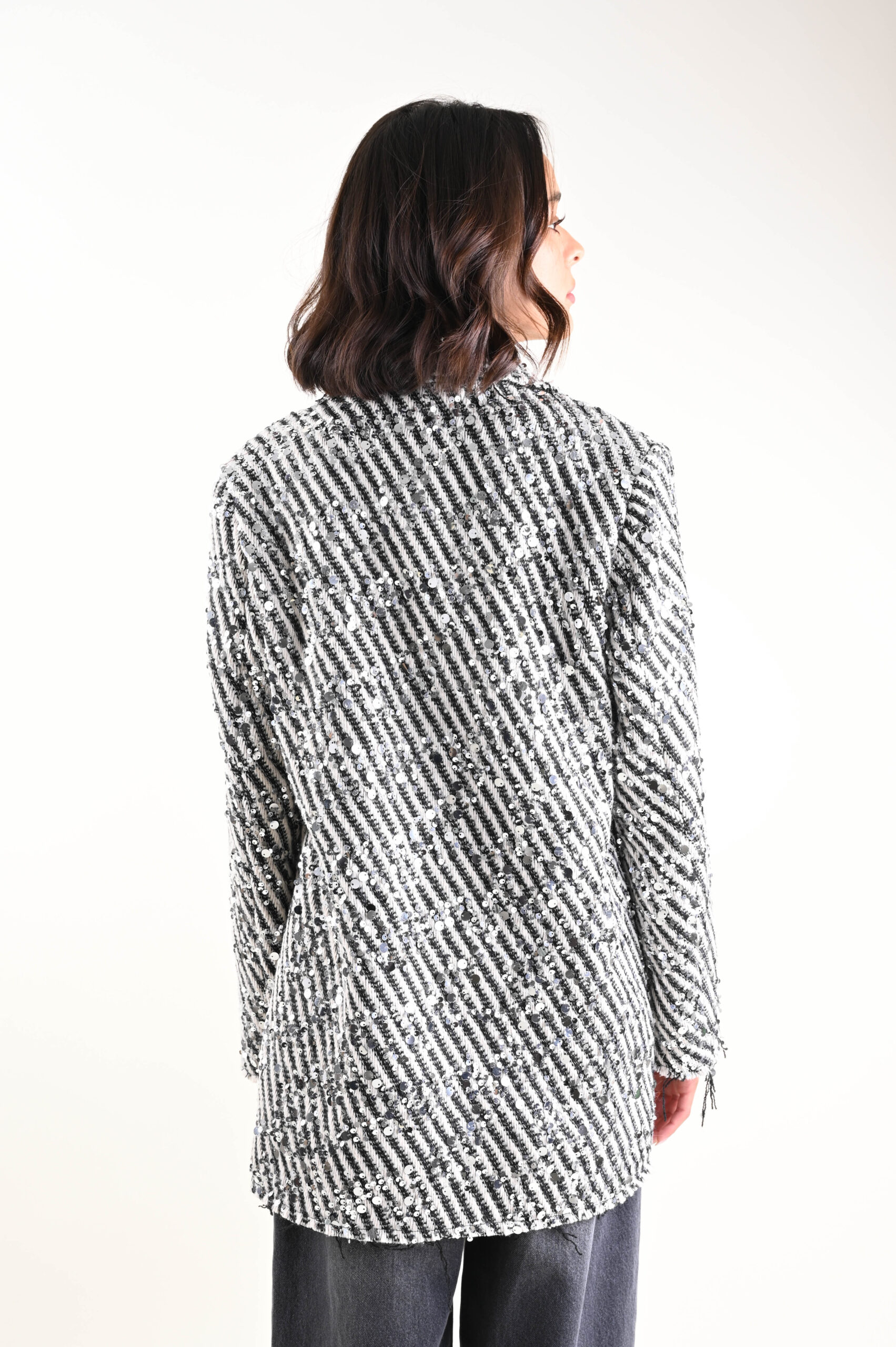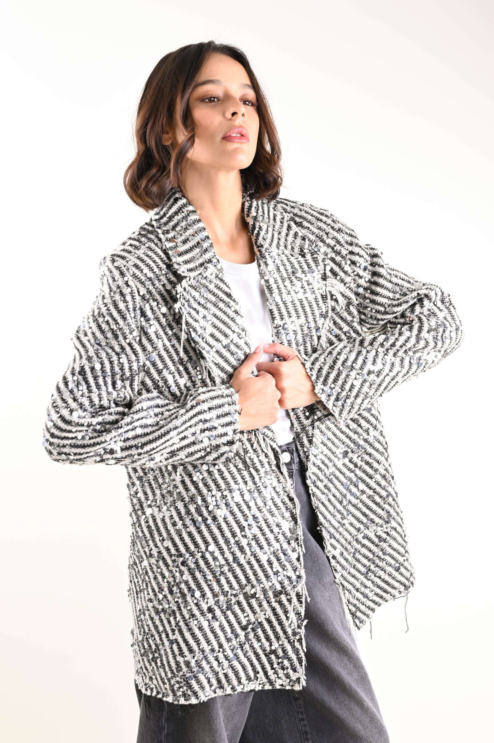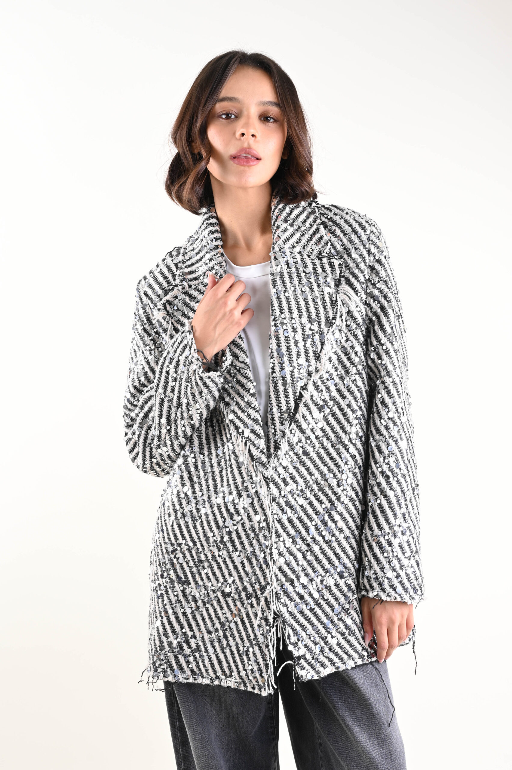 Blazer in tweed arricchito da micro paillettes che illuminano la texture del tessuto. Il taglio dritto e la chiusura monopetto valorizzano la silhouette con eleganza e modernità. Un capo dal carattere deciso e sofisticato, ideale per completare look sia formali che casual-chic.