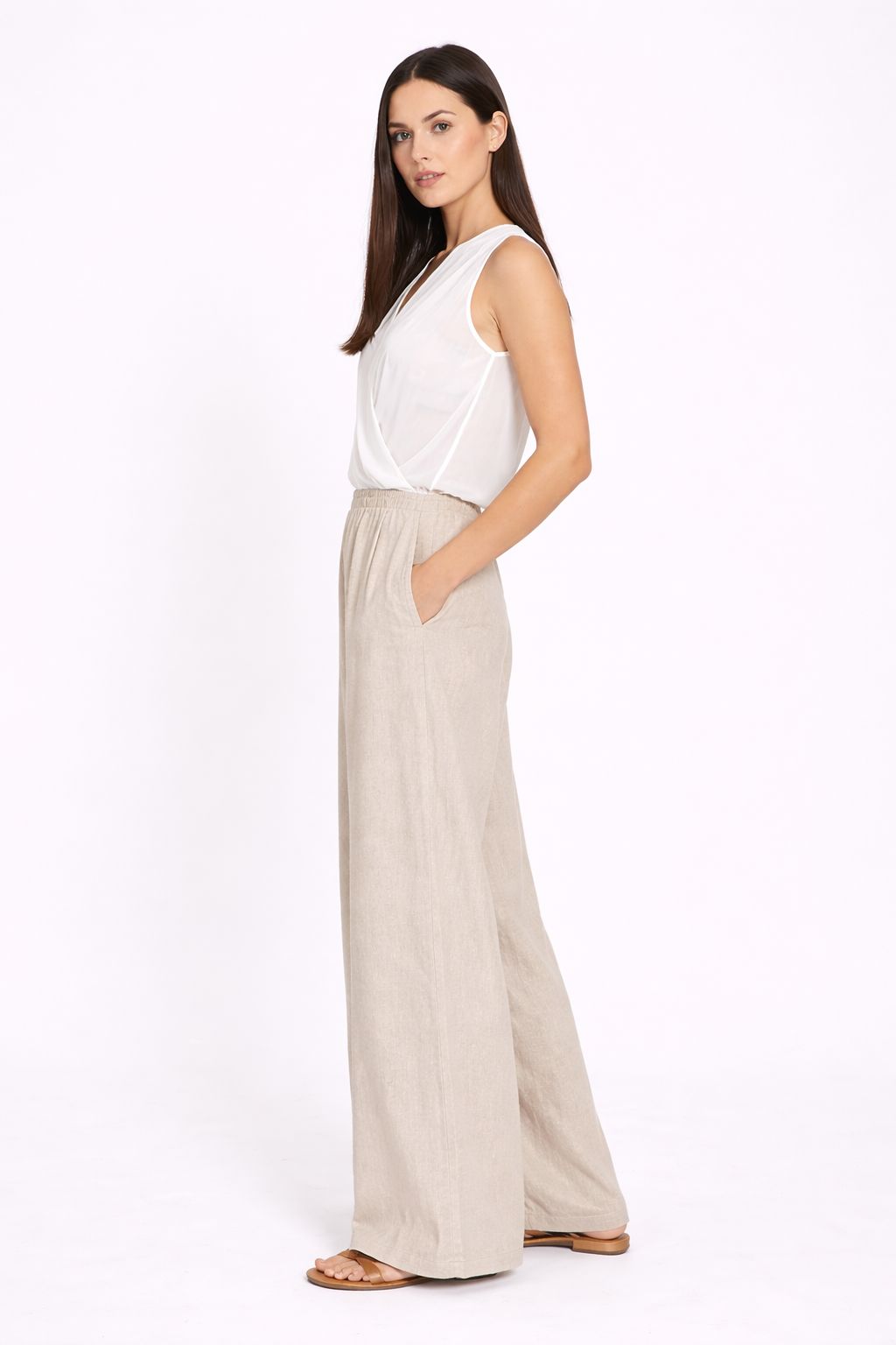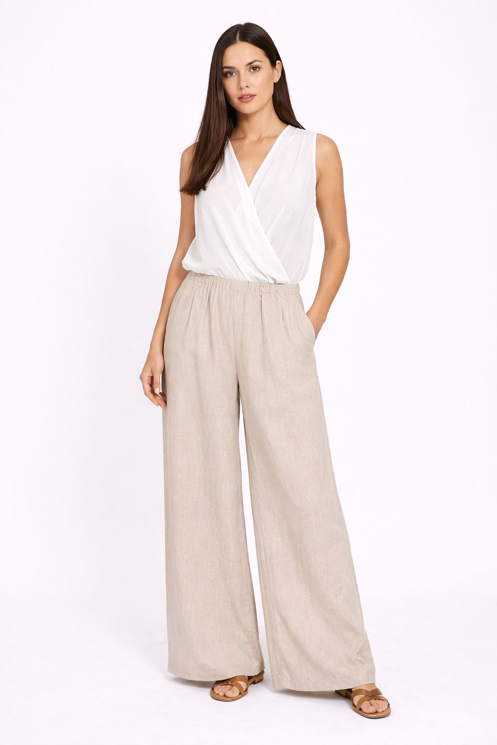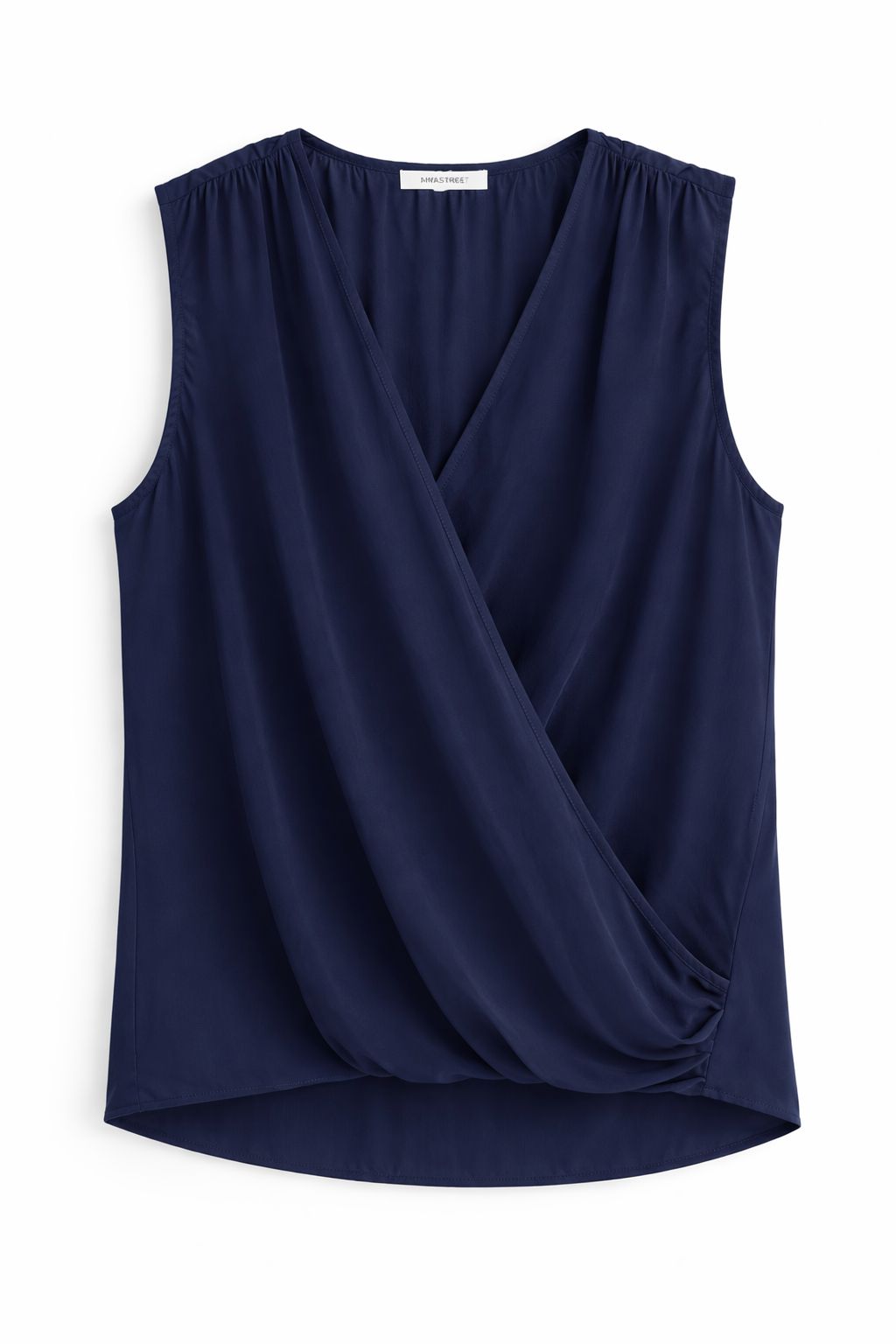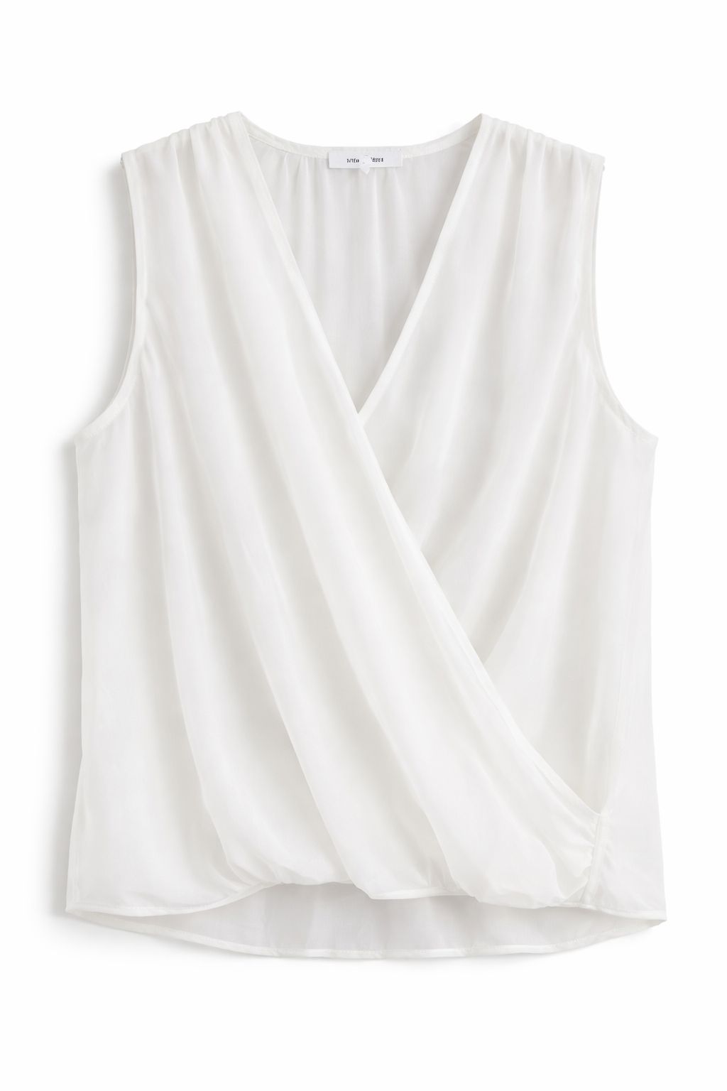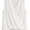 Blusa smanicata da donna dal design sofisticato e contemporaneo, caratterizzata da un elegante incrocio sul davanti che valorizza la silhouette con naturalezza. Realizzata in tessuto leggero e semi-trasparente, questa blusa offre una vestibilità fluida e confortevole, ideale per la stagione estiva e per look freschi ma raffinati.