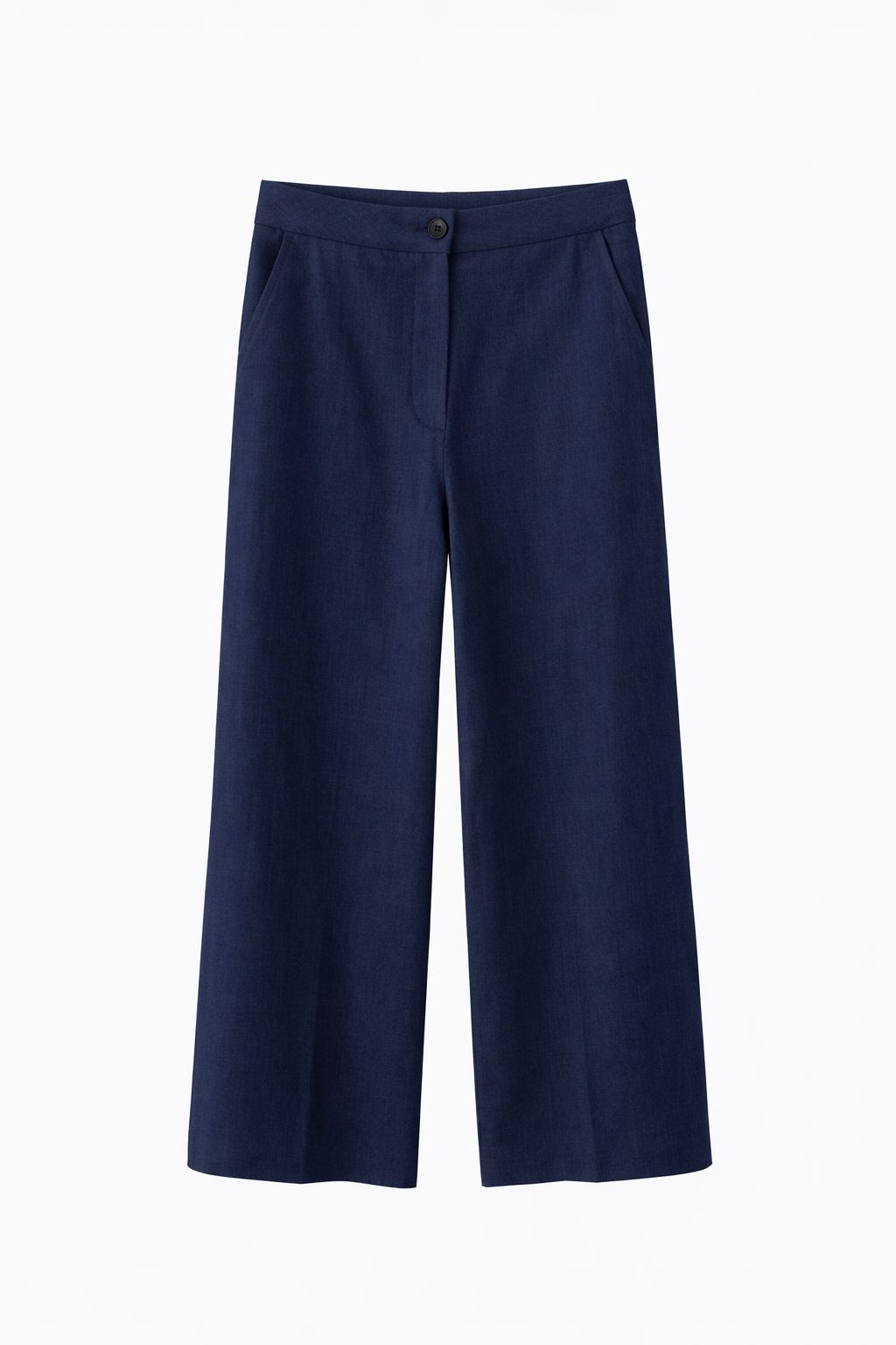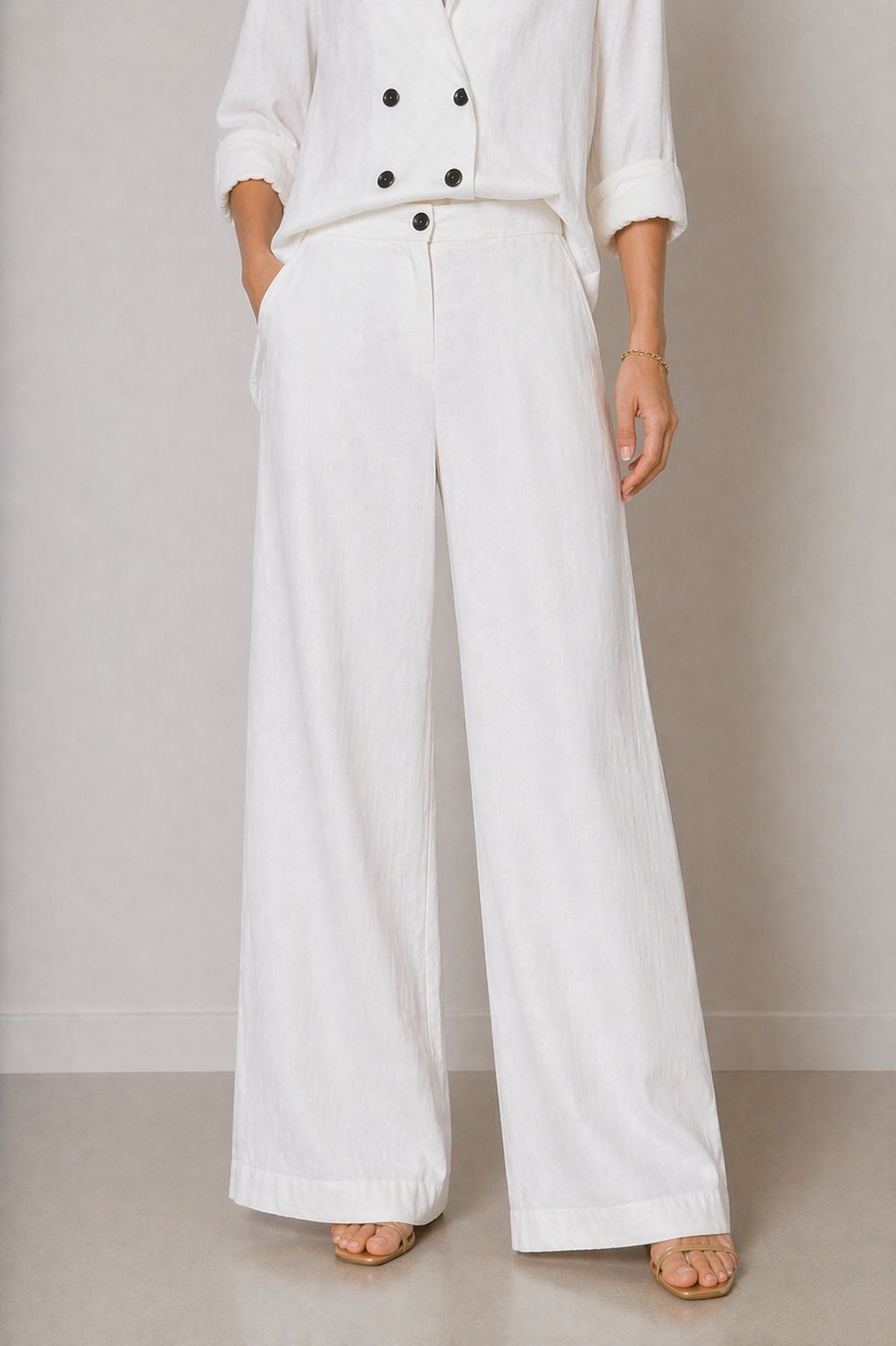 Pantaloni a palazzo da donna in misto lino, pensati per completare look eleganti e contemporanei. Dotati di chiusura con bottone e zip, presentano pratiche tasche laterali e un elastico sul retro che assicura una vestibilità comoda e adattabile. Il tessuto in misto lino, leggero e traspirante, li rende ideali per la stagione primavera estate, garantendo freschezza e comfort per tutto il giorno. La linea ampia e fluida slancia la figura, rendendoli perfetti sia per outfit da ufficio che per occasioni più casual chic. Un capo versatile da abbinare facilmente a giacche coordinate o top leggeri.
