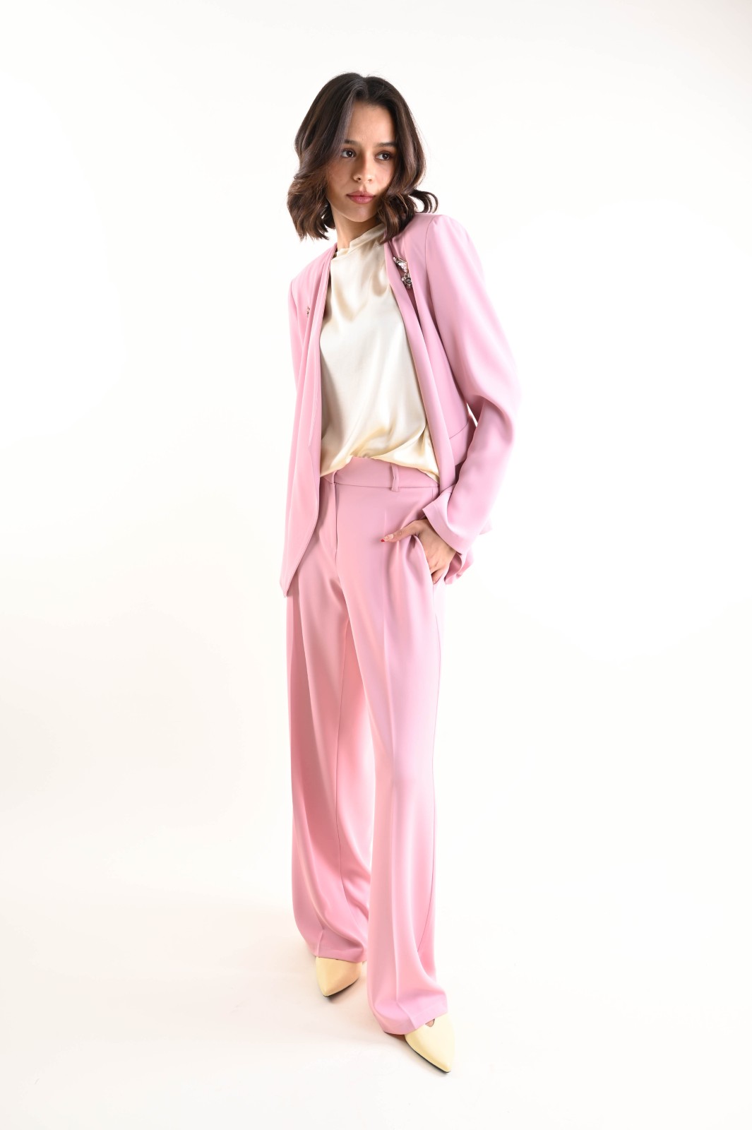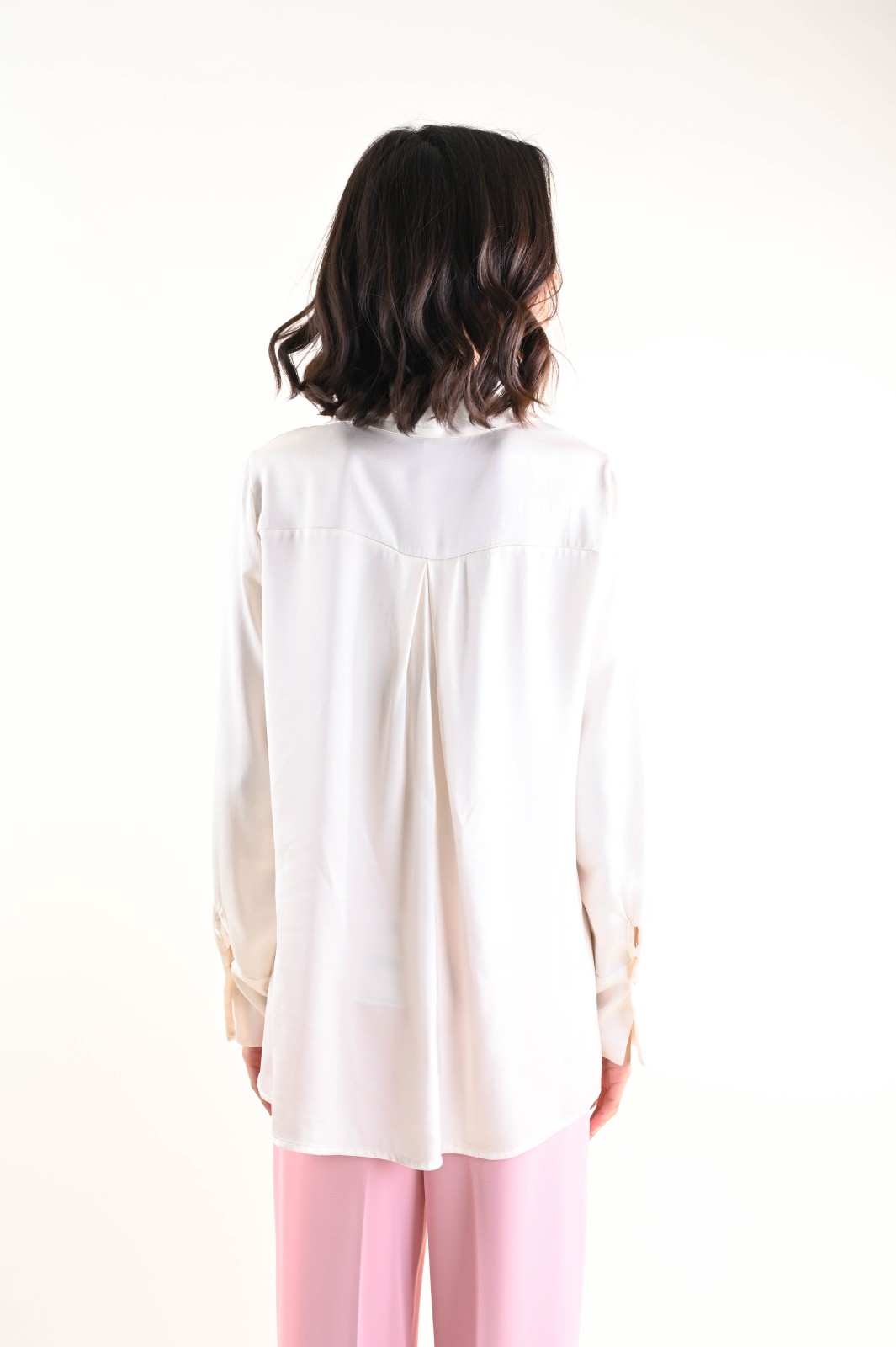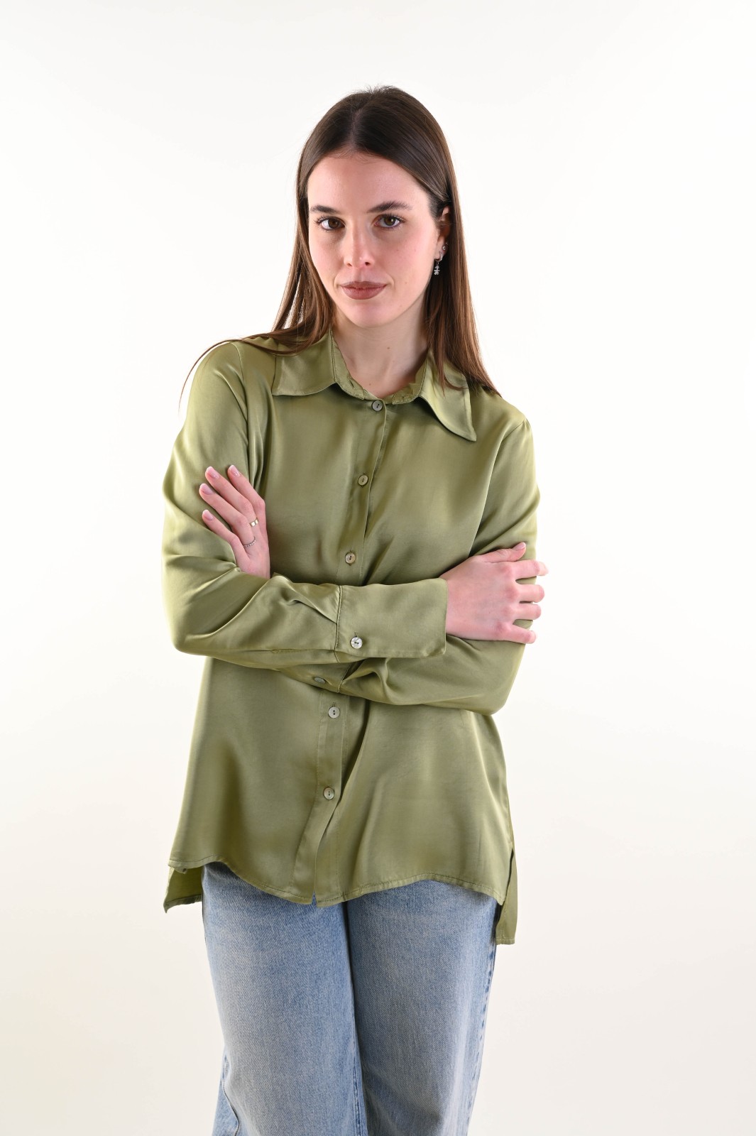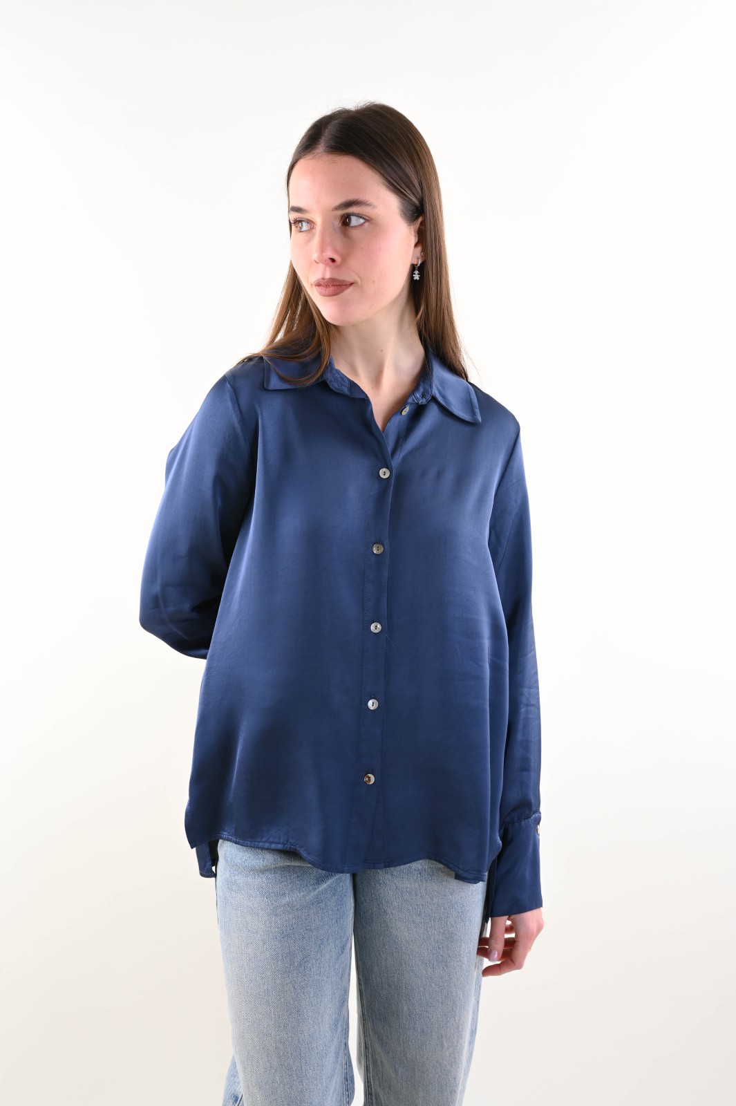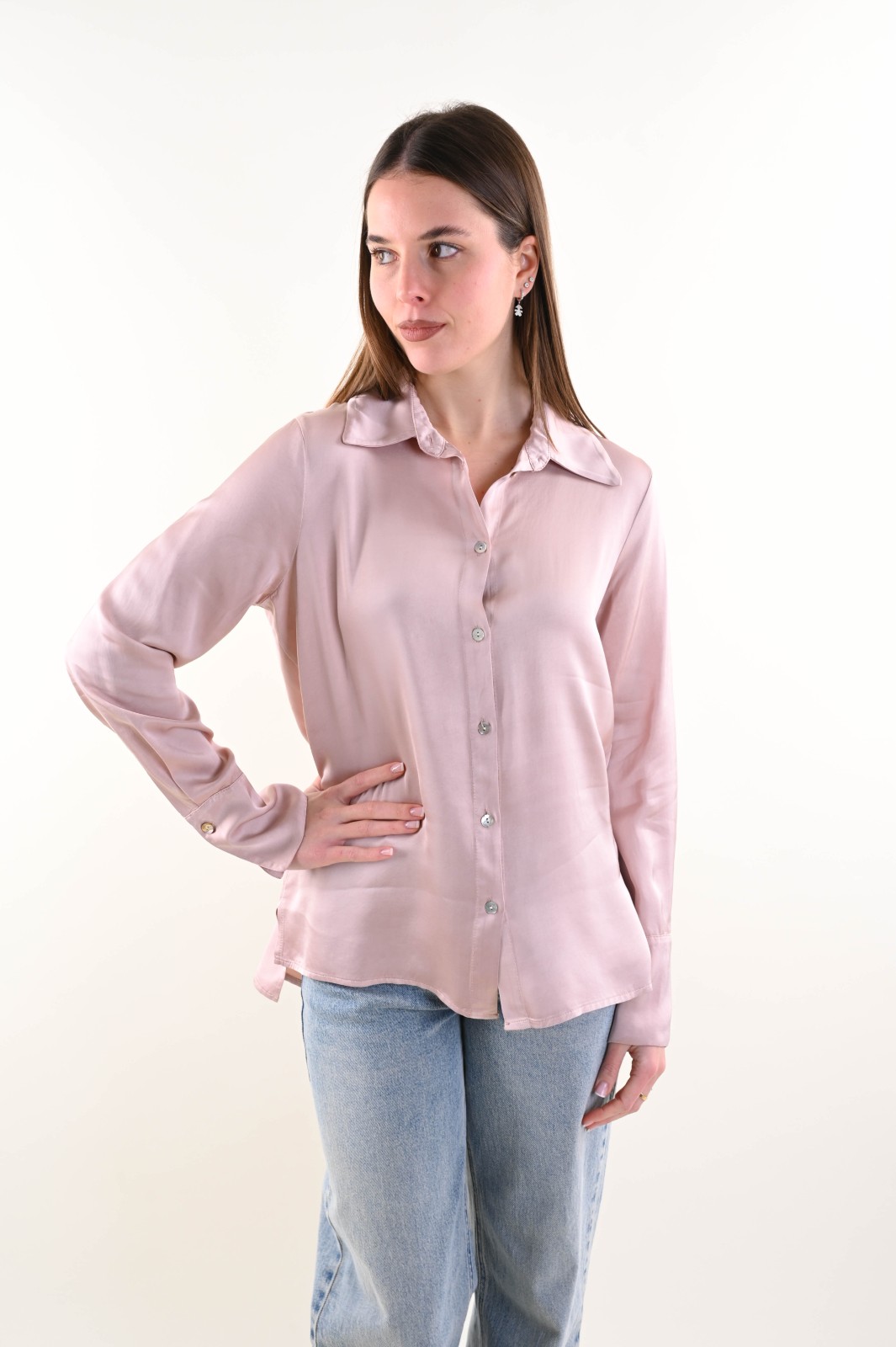 Camicia da donna satin dalla linea fluida ed elegante, con colletto classico e bottoni a chiusura effetto madreperla. Accompagna la silhouette senza costringerla. Maniche lunghe con polsino.