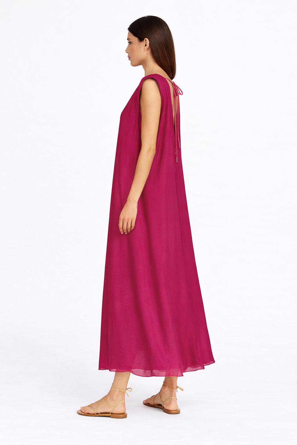 Abito lungo dal design fluido e contemporaneo, pensato per una donna sofisticata, grintosa e femminile. La linea morbida e scivolata valorizza il movimento del capo, rendendolo ideale per una proposta estiva d’impatto.