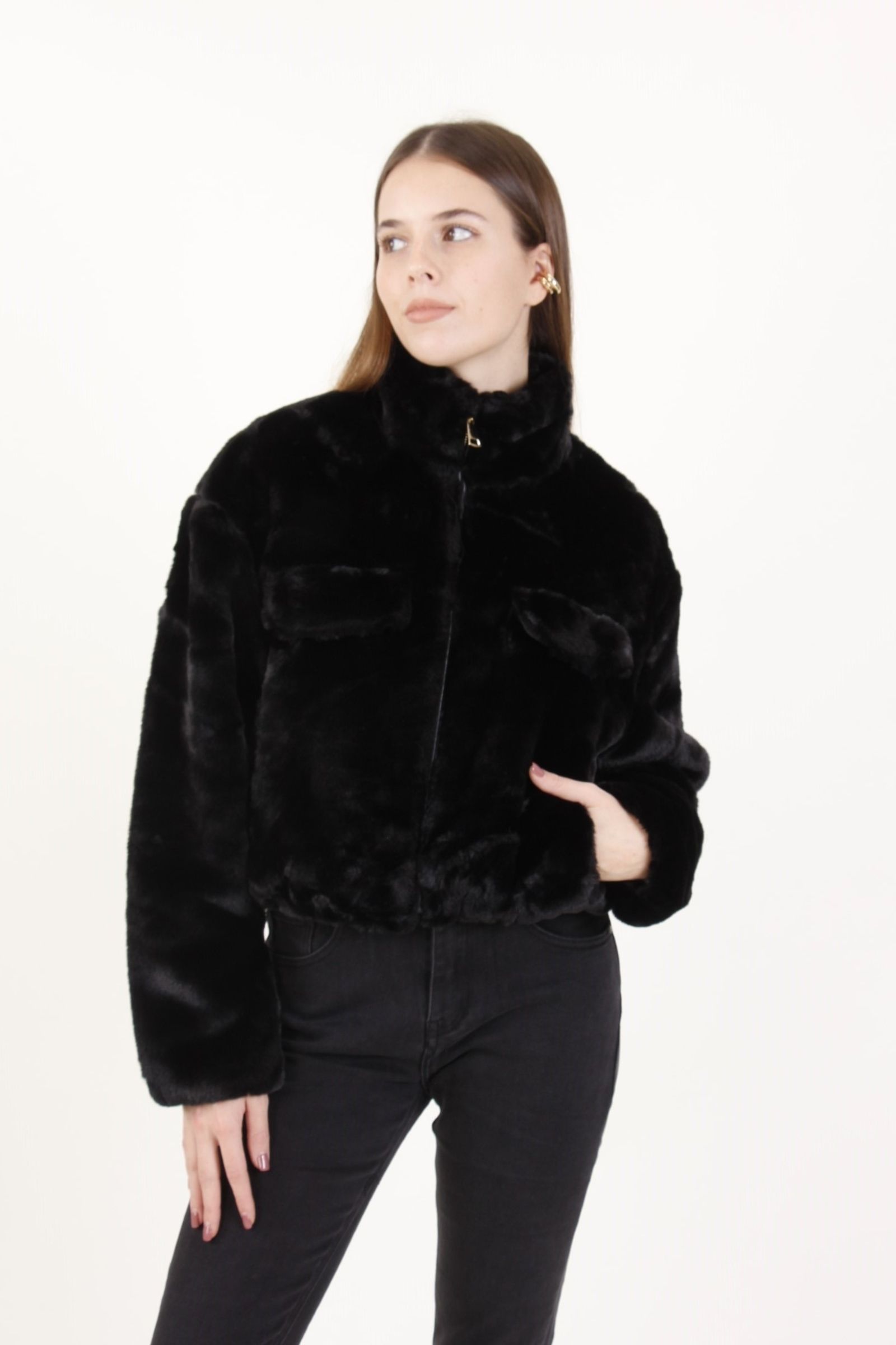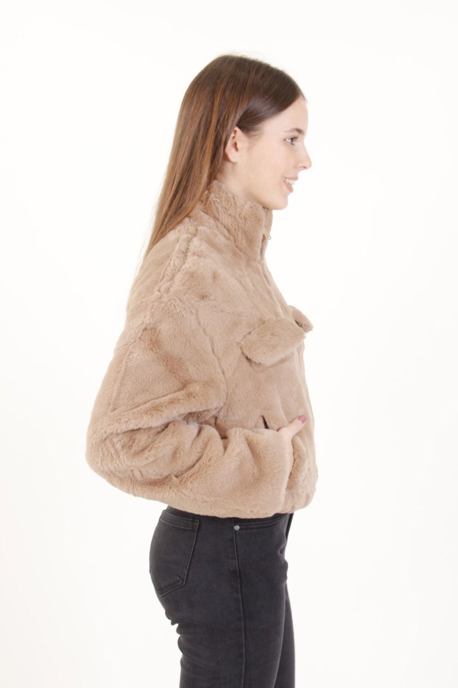 Bomber a girocollo in ecopelliccia, chiusura a zip e tasche finte sul davanti.