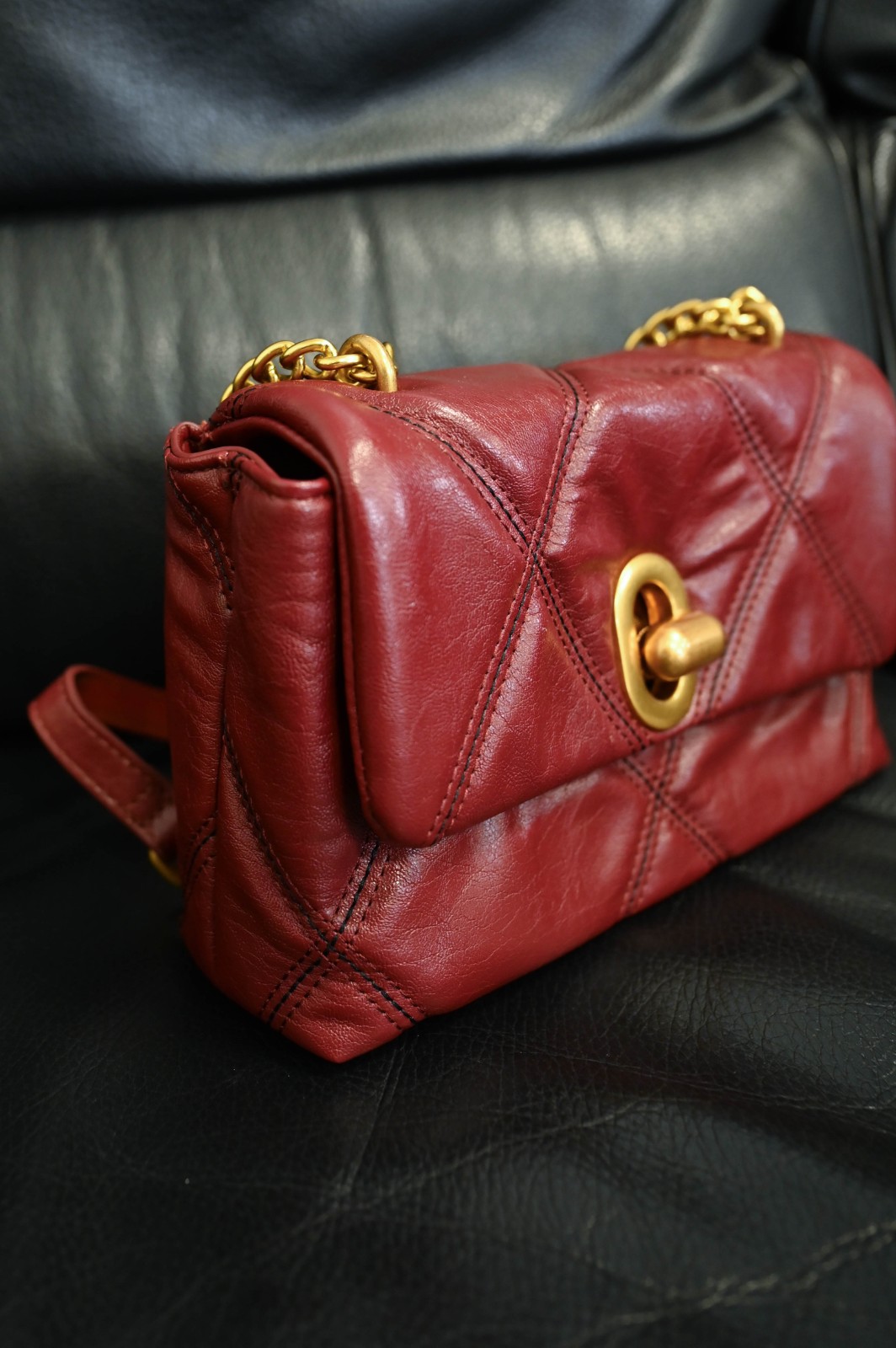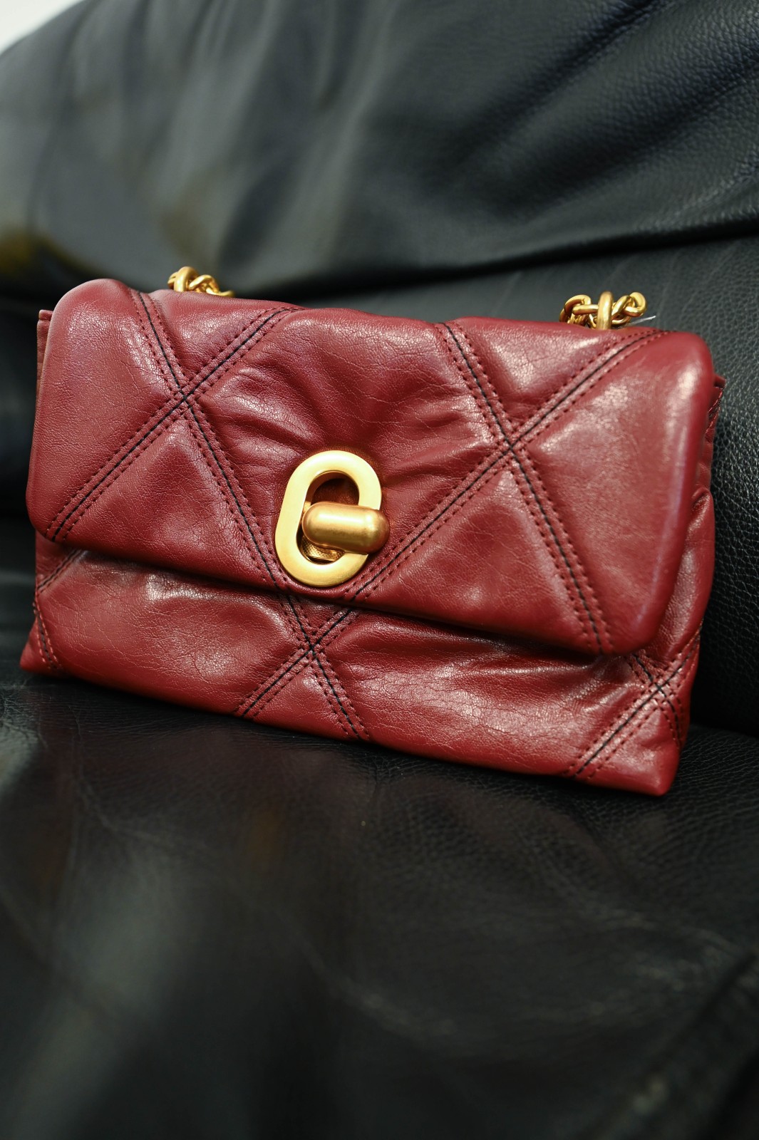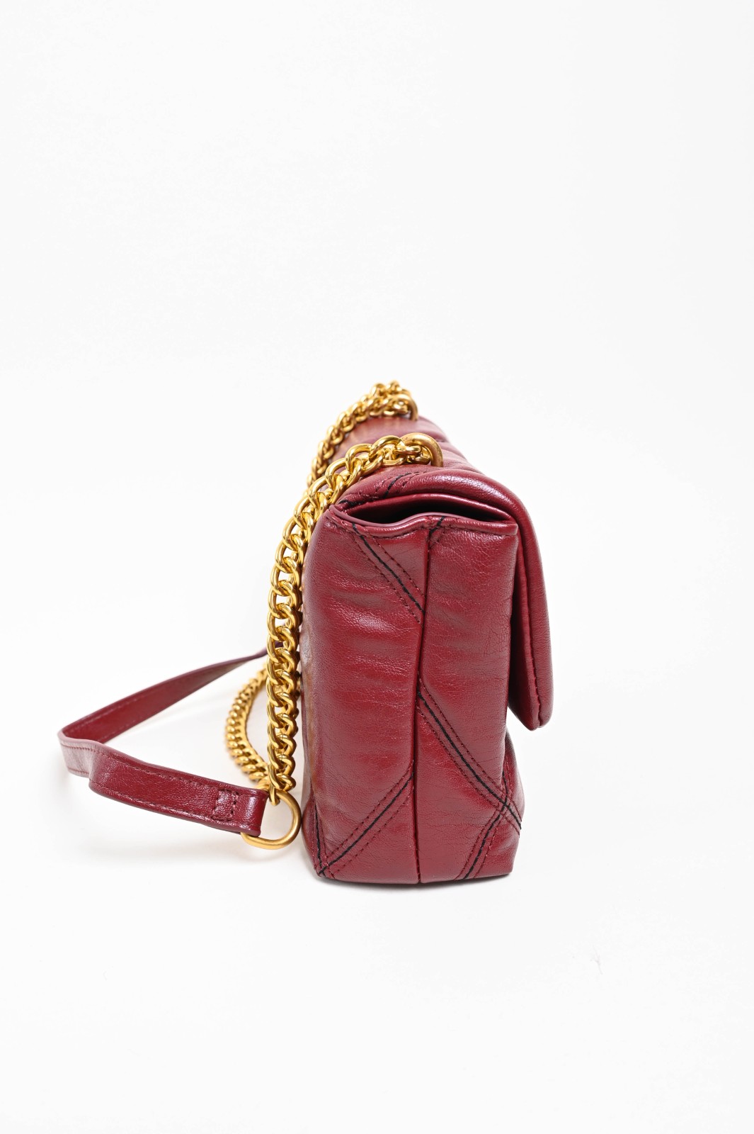 Borsa a spalla in similpelle trapuntata con impunture a contrasto, impreziosita da una doppia catena dorata che permette di indossarla sia a spalla che a tracolla. La chiusura frontale con dettaglio metallico dona un tocco raffinato e luminoso, mentre la forma morbida e compatta la rende perfetta per ogni occasione. Un modello dal fascino intramontabile, ideale per completare look eleganti e sofisticati con una nota di modernità.