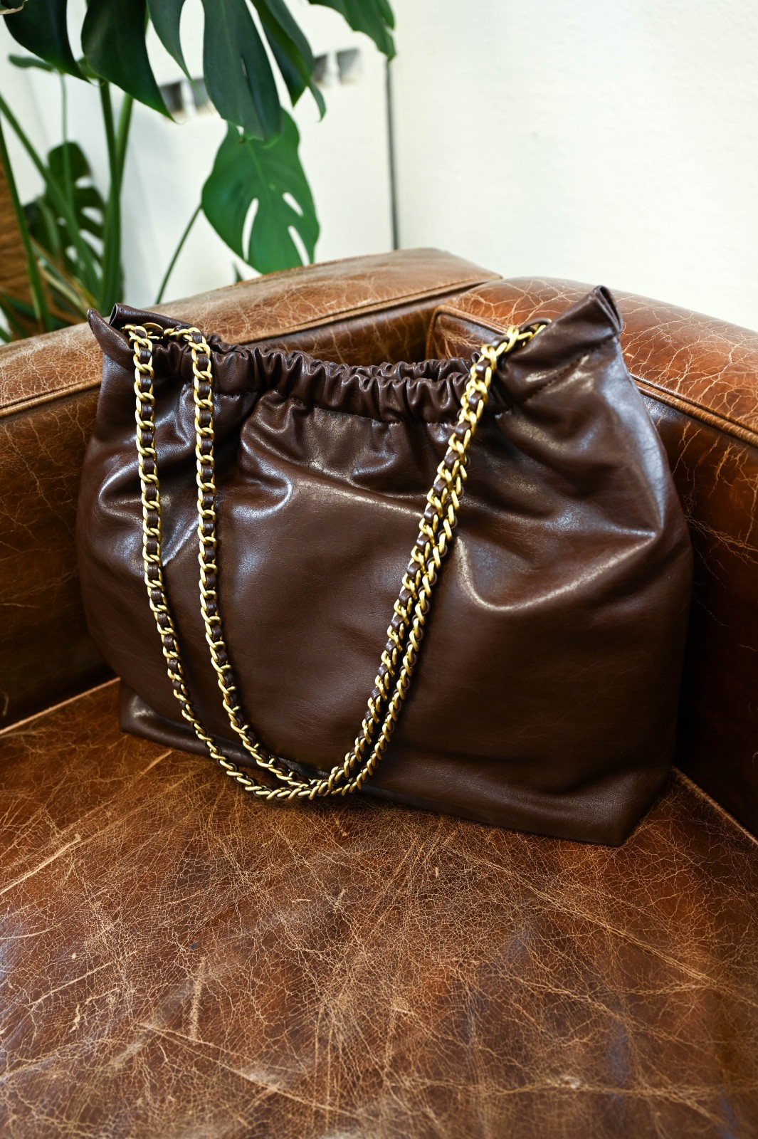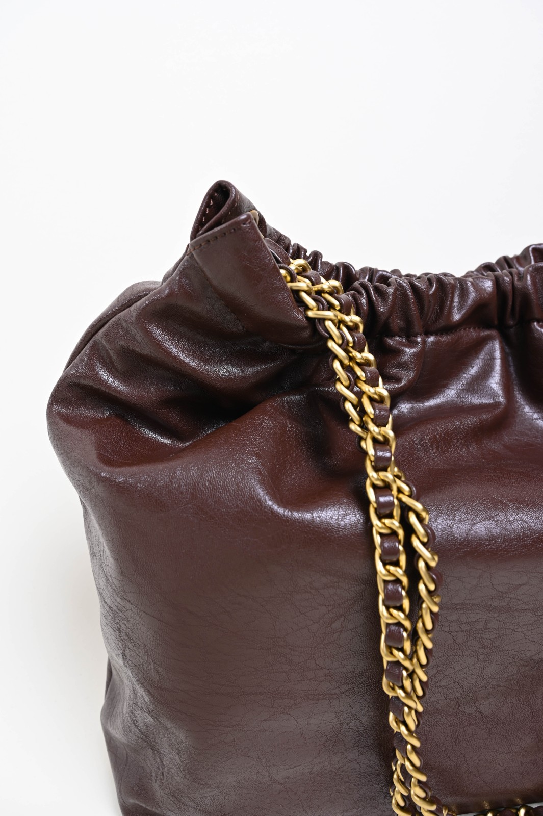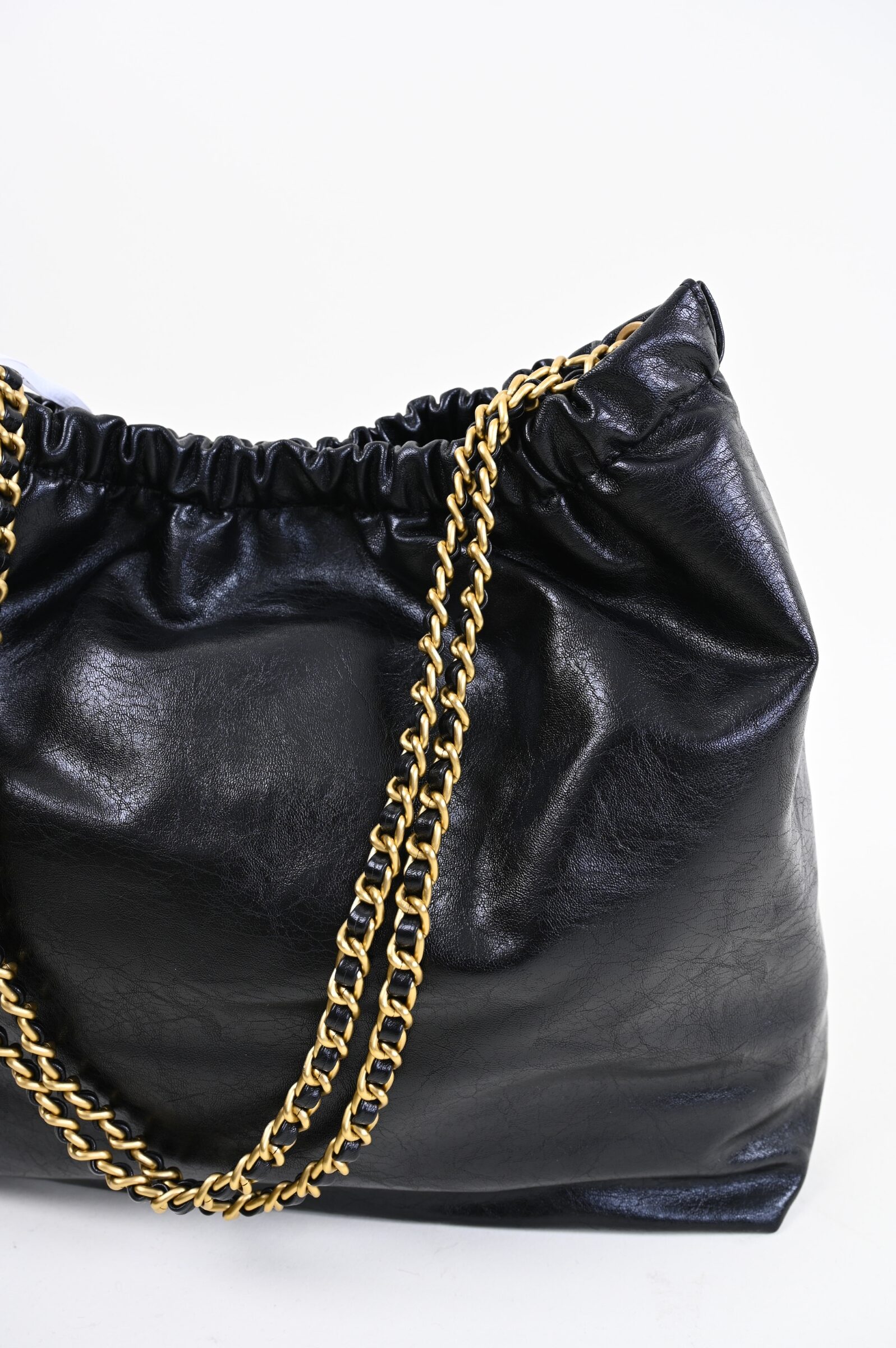 Shoulder bag realizzata in similpelle lucida, con design morbido e arricciatura superiore che crea un effetto elegante e naturale. Il manico a catena intrecciata aggiunge luminosità e carattere, rendendo questa borsa un perfetto mix tra praticità e stile. Capiente e leggera, è l’accessorio ideale per completare look casual o più sofisticati con un tocco contemporaneo e glamour.