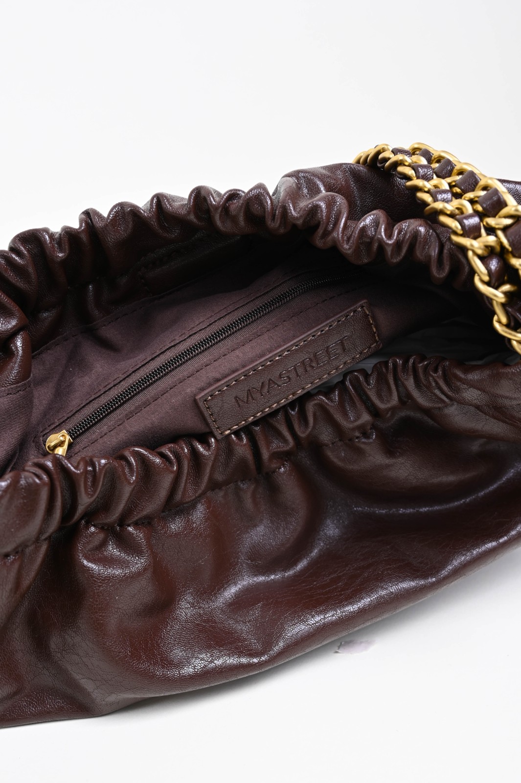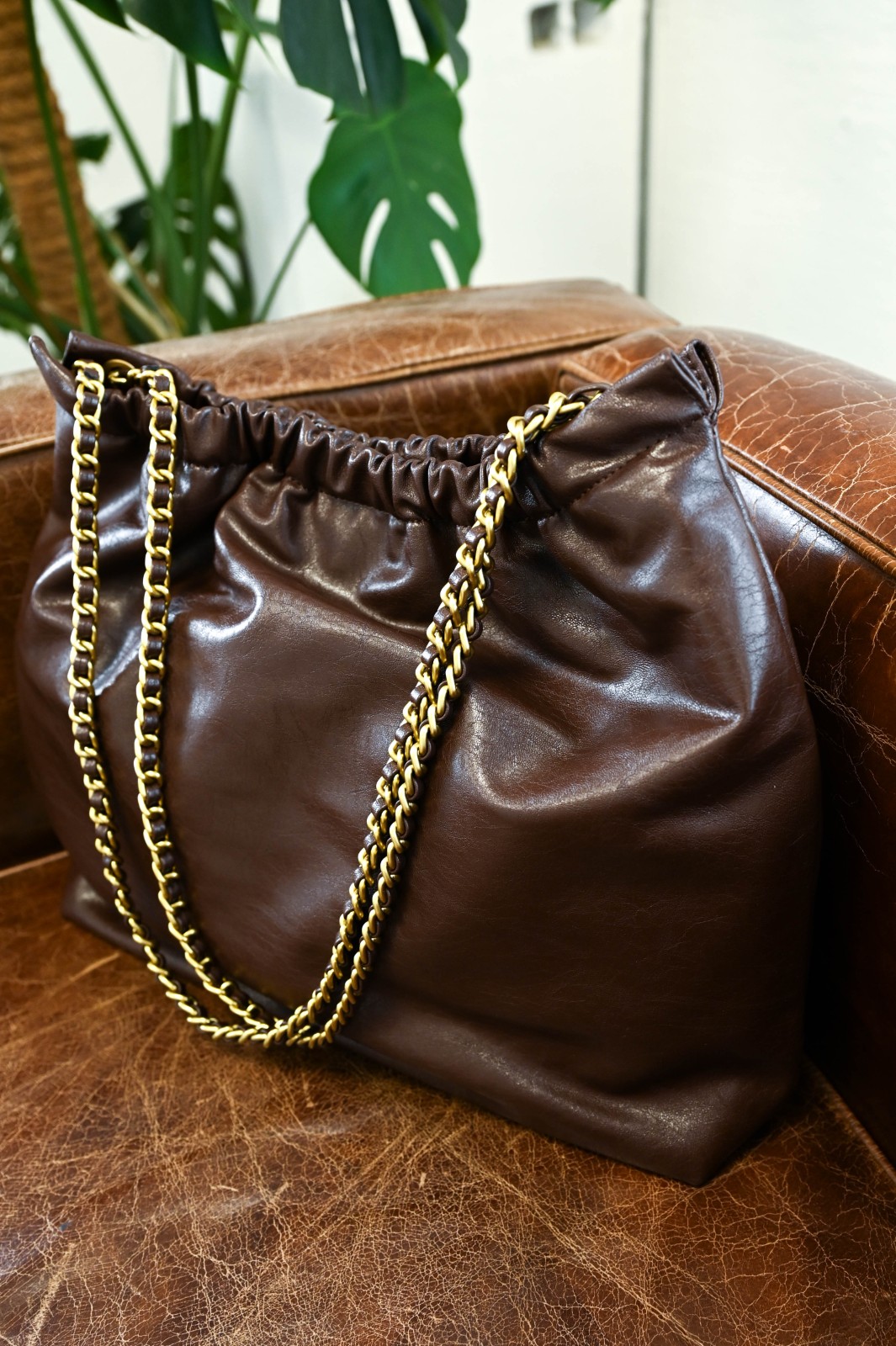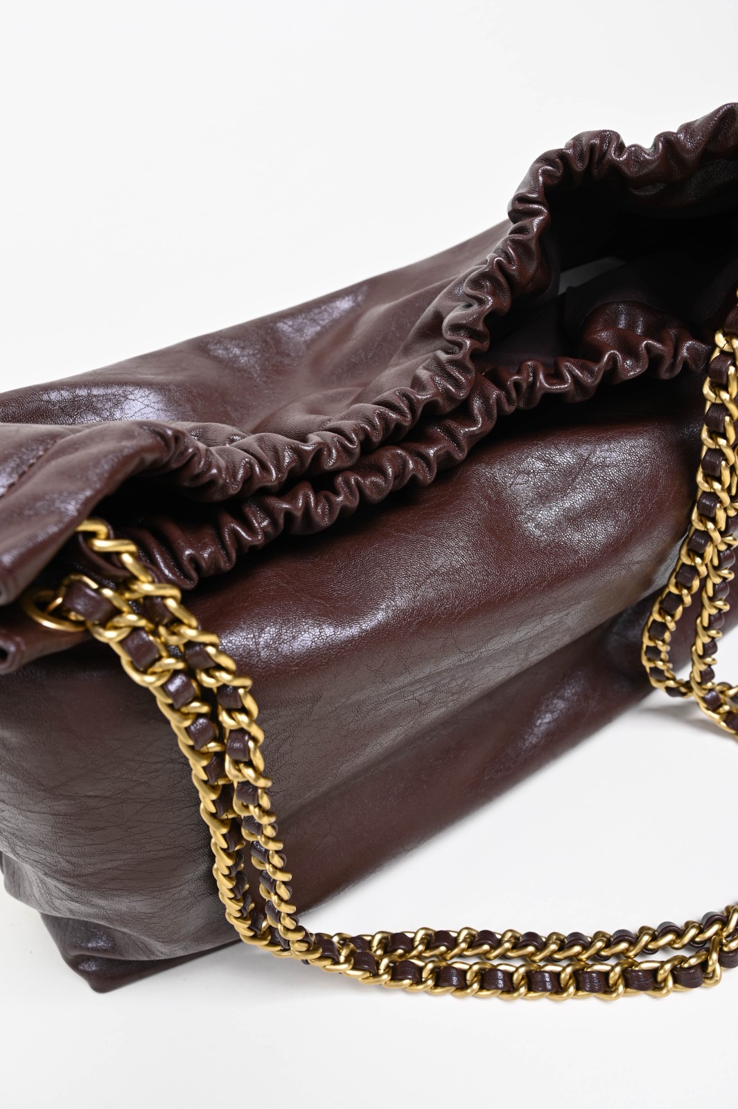 Shoulder bag realizzata in similpelle lucida, con design morbido e arricciatura superiore che crea un effetto elegante e naturale. Il manico a catena intrecciata aggiunge luminosità e carattere, rendendo questa borsa un perfetto mix tra praticità e stile. Capiente e leggera, è l’accessorio ideale per completare look casual o più sofisticati con un tocco contemporaneo e glamour.