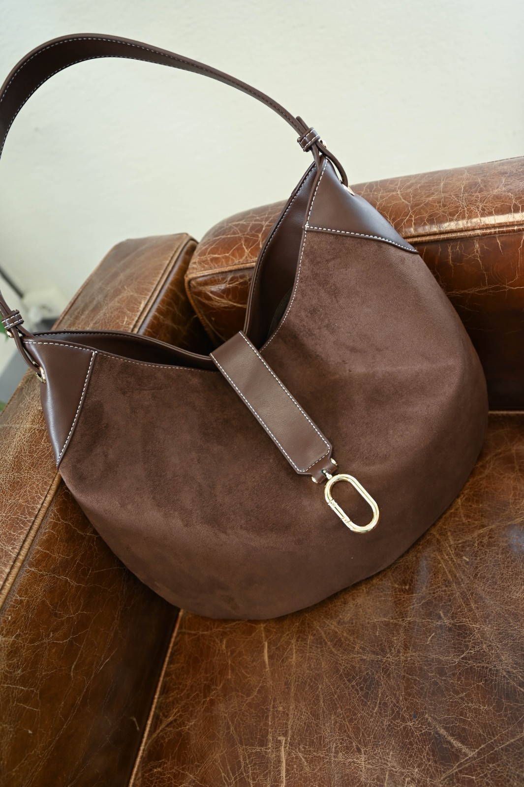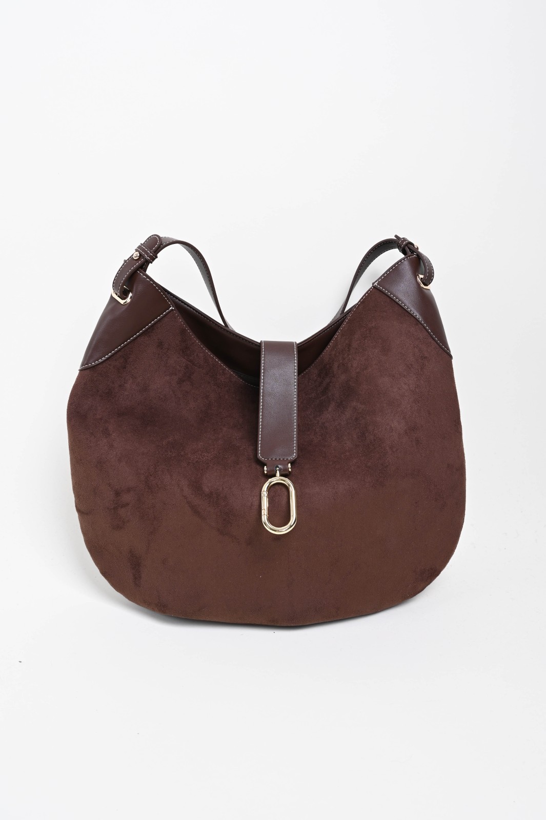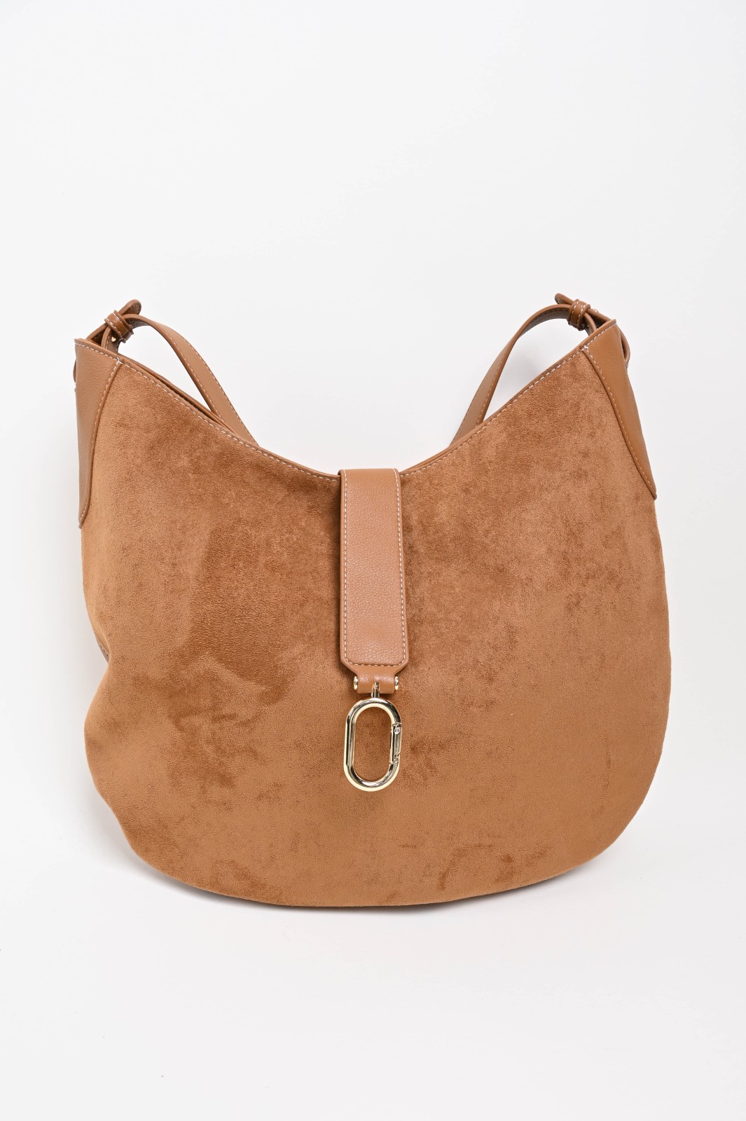 Borsa hobo realizzata in morbido materiale effetto suede con dettagli in similpelle liscia che ne valorizzano la forma. Il design ampio e arrotondato è arricchito da un inserto frontale con dettaglio metallico dorato, che aggiunge un tocco raffinato. Comoda da indossare grazie al manico unico, questa borsa unisce stile e funzionalità, perfetta per accompagnare la donna in ogni momento della giornata.