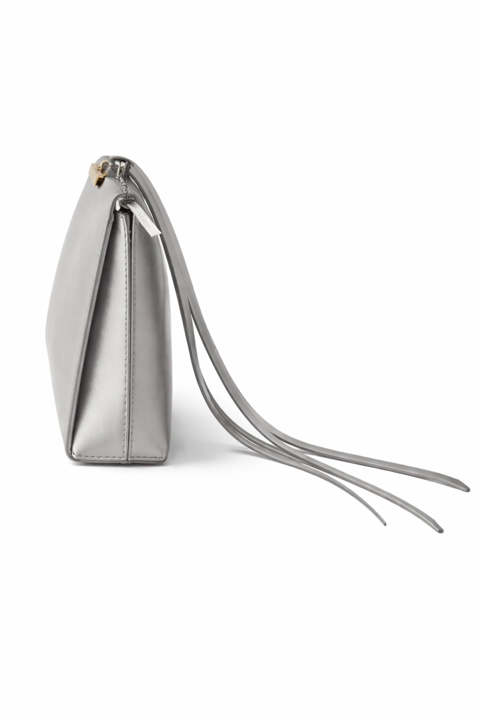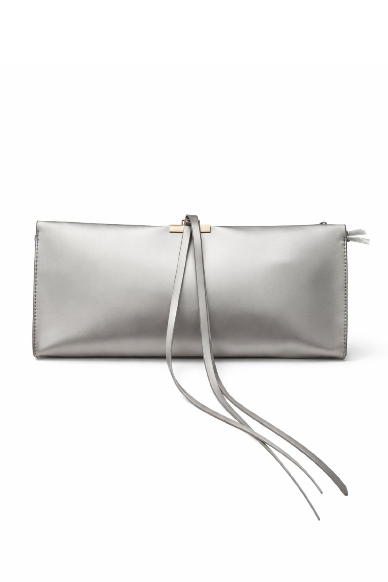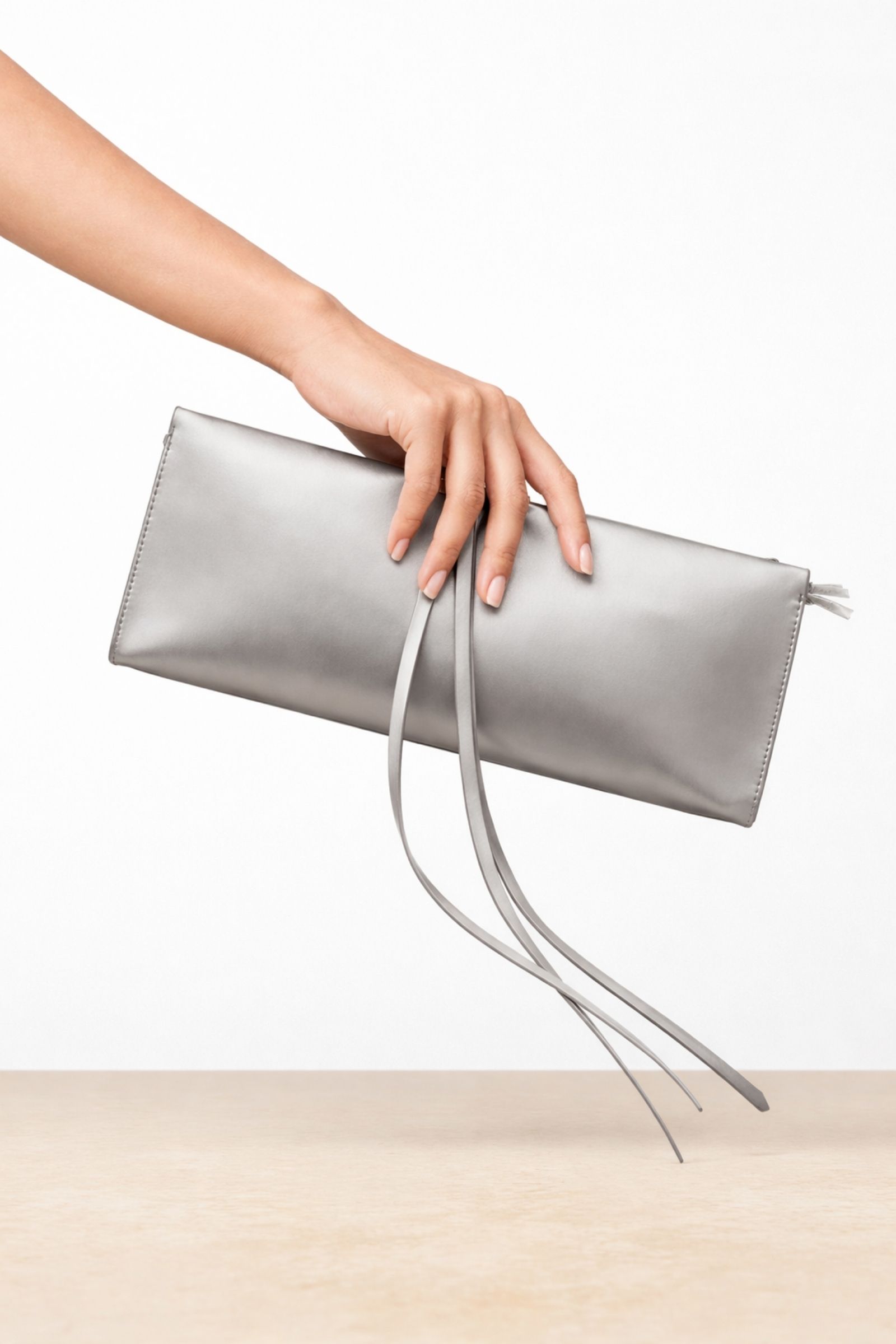 Pochette donna in pelle dal design minimal, caratterizzata da elegante dettaglio metallico e laccetti decorativi frontali. La linea pulita e contemporanea valorizza la silhouette allungata, rendendo questa pochette in pelle elegante perfetta per completare look sofisticati e moderni.