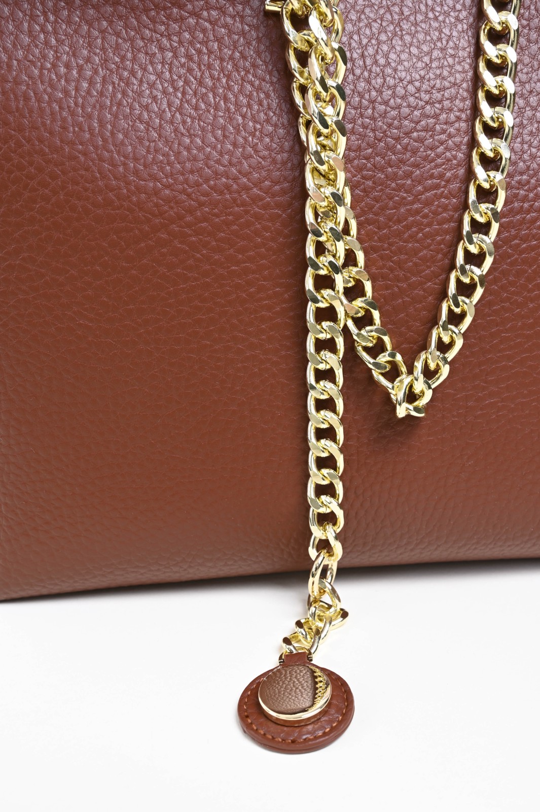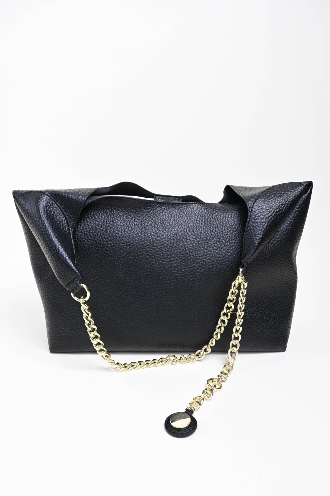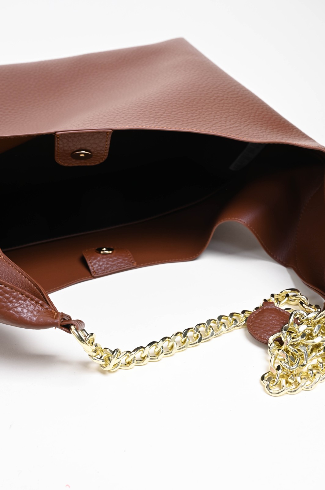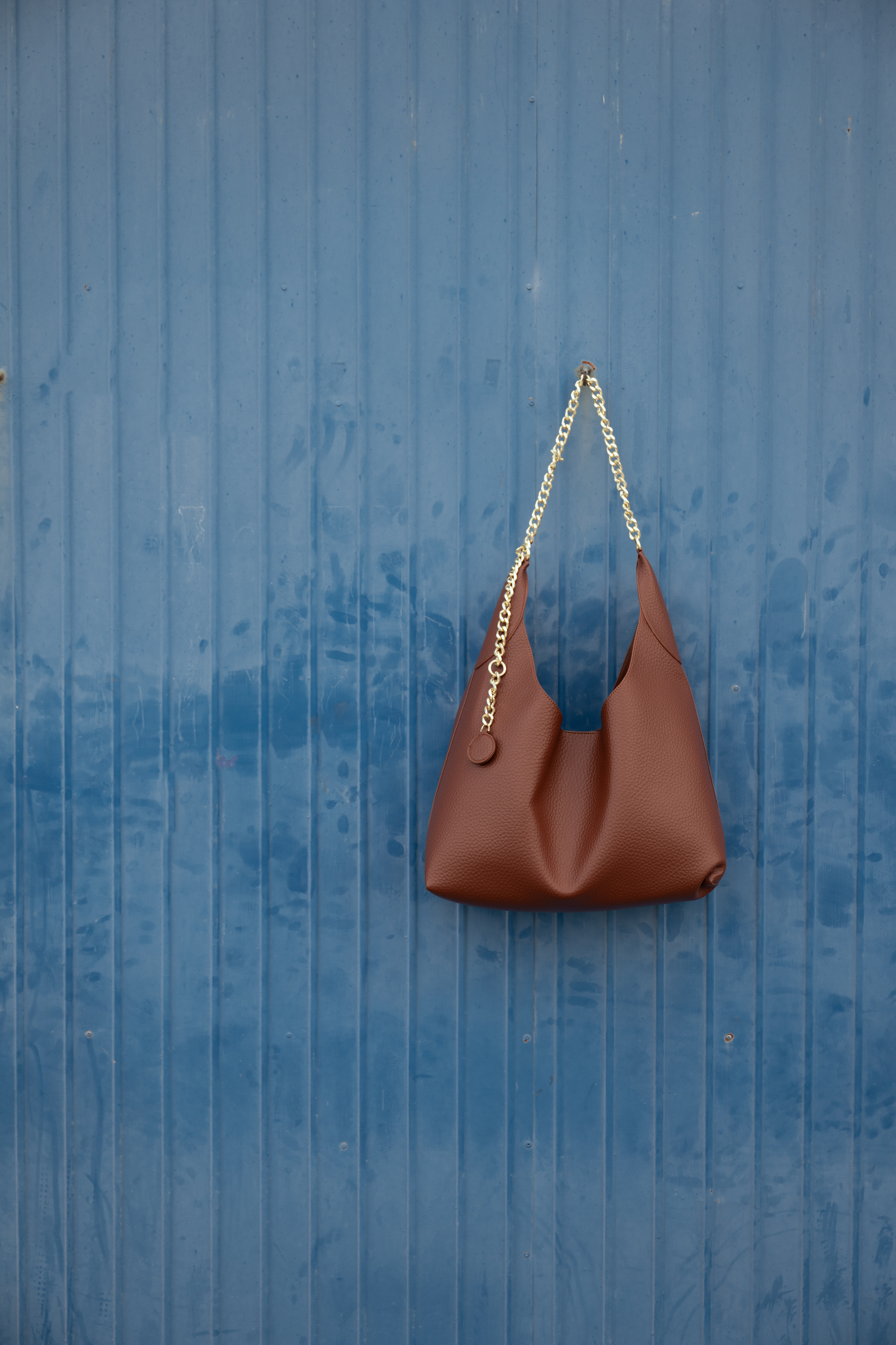 Borsa hobo in similpelle martellata dal design morbido e minimalista, arricchita da un raffinato manico in catena dorata che aggiunge un tocco di luce e modernità. La silhouette ampia e destrutturata la rende pratica e capiente, ideale per l’uso quotidiano. Un modello versatile che unisce stile e funzionalità, perfetto per completare con eleganza sia look casual che più ricercati.
