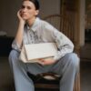 La chiusura metallica frontale aggiunge un dettaglio raffinato e luminoso, esaltando il minimalismo del modello. La struttura pieghevole a portafoglio dona volume e carattere, mantenendo al tempo stesso un’estetica ordinata e versatile.